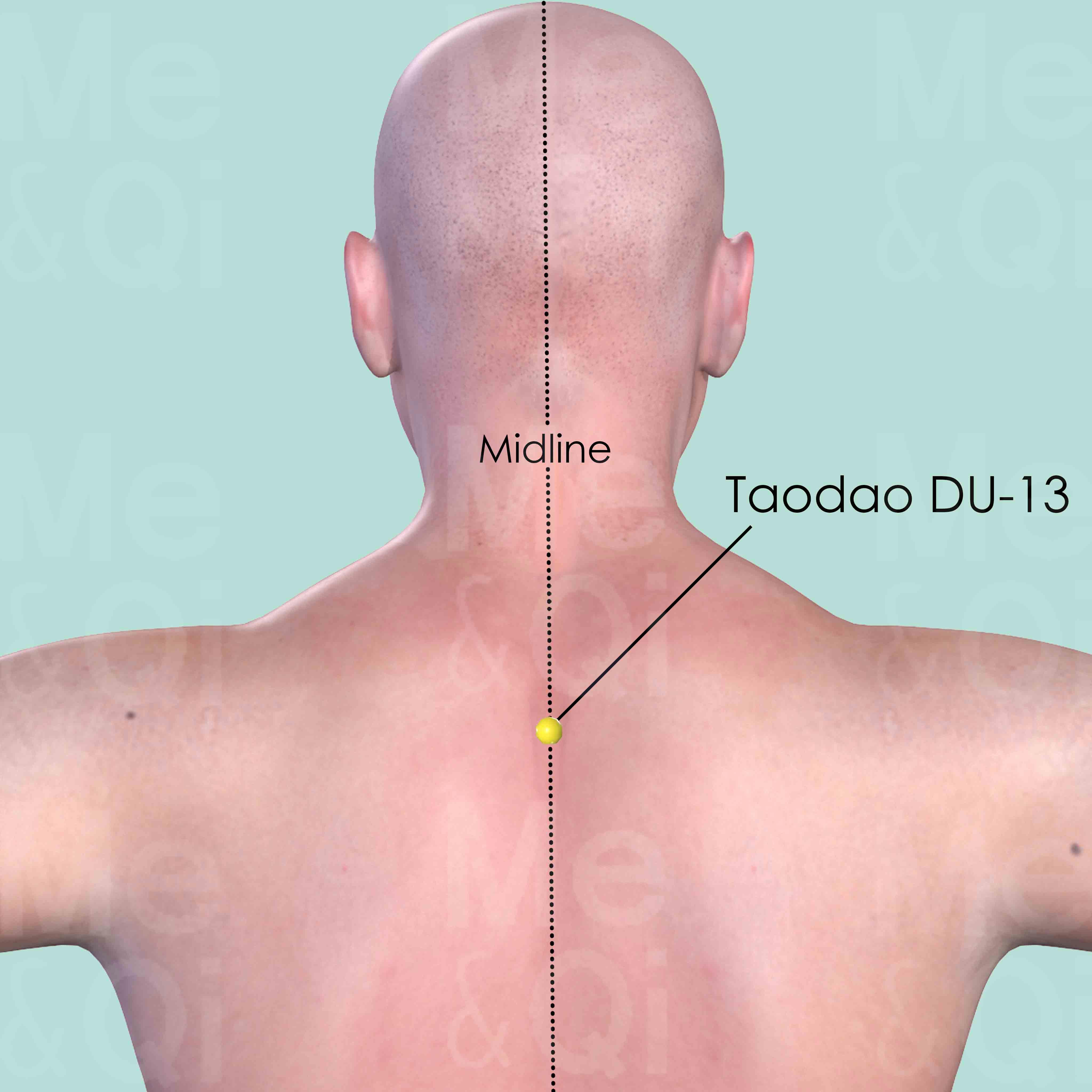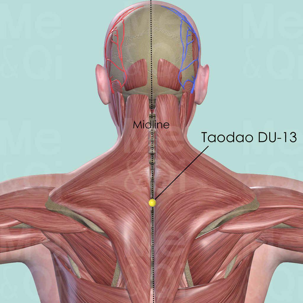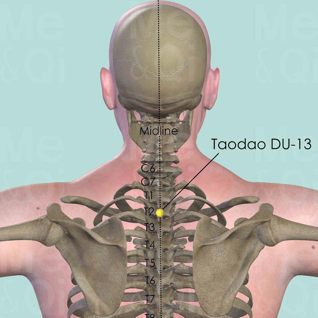 Firstly locate C6 by running the finger down the neck along the midline as it is the first palpable cervical vertebral spinous process. It becomes impalpable when the patients extend their neck. C7 is below C6 and it is still palpable despite that the neck is extended. Then from C7, count down 1 spinous processes and locate T1. Taodao DU-13 is in the depression below T1.