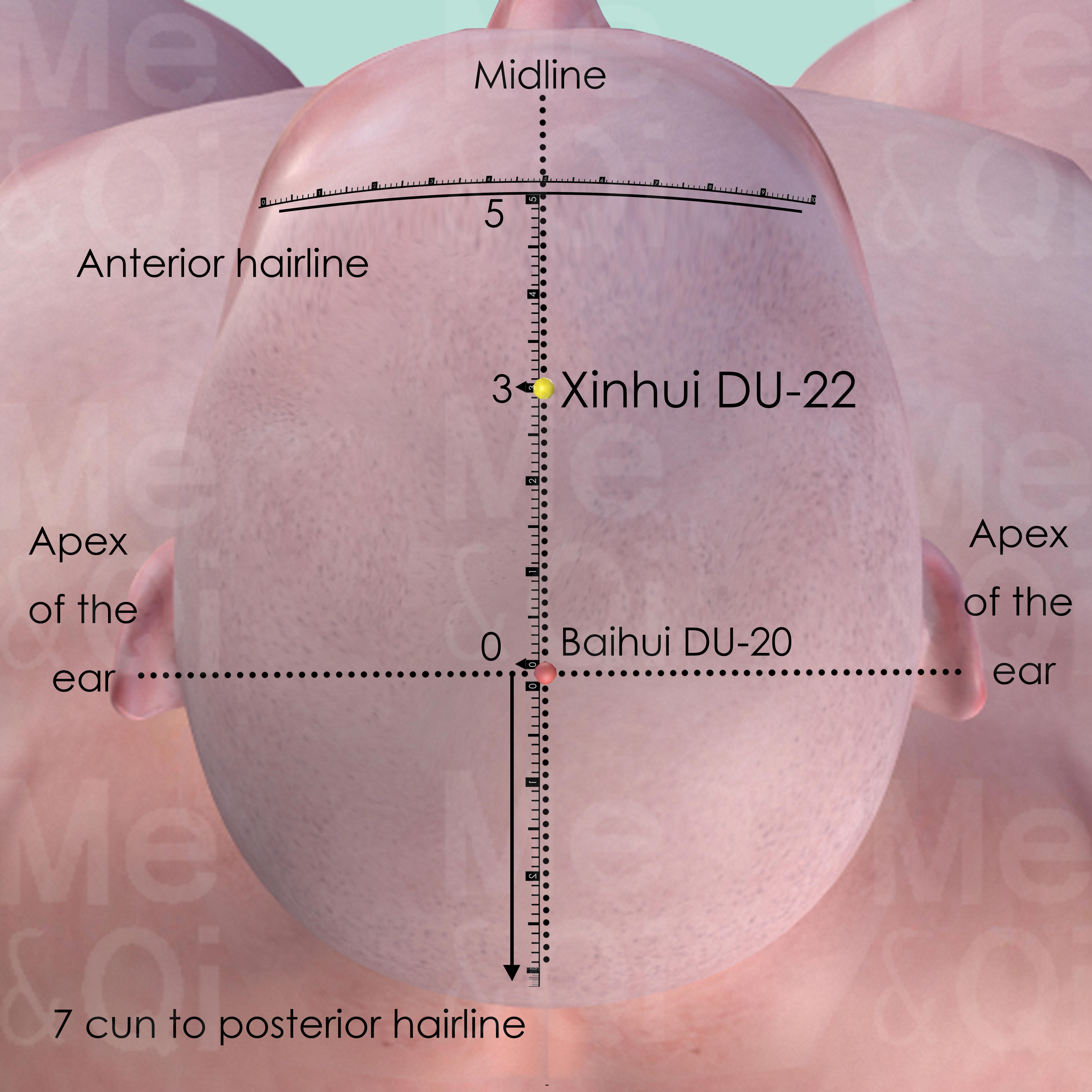 0.5–1 cun transversely. Caution with infants whose fontanelle has not yet closed, as Xinhui DU-22 is located on the anterior border of the fontanelle.