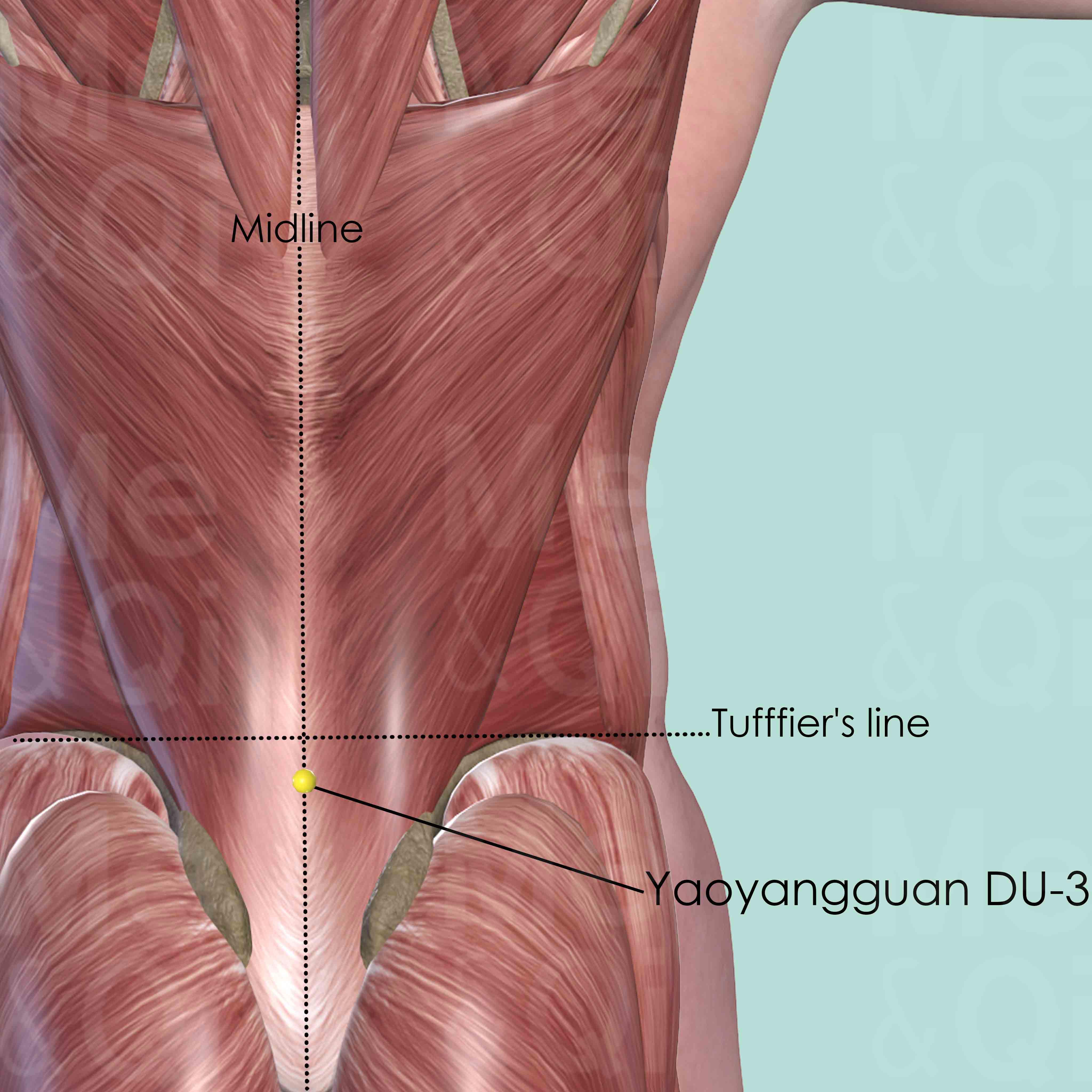 Locate the Tufffier's line, which connects the two most superior points on the iliac crest. It intersects with the 4th lumber vertebra. Locate Yaoyangguan DU-3 below the spinous process of the 4th lumber vertebra (L4) on the midline.
