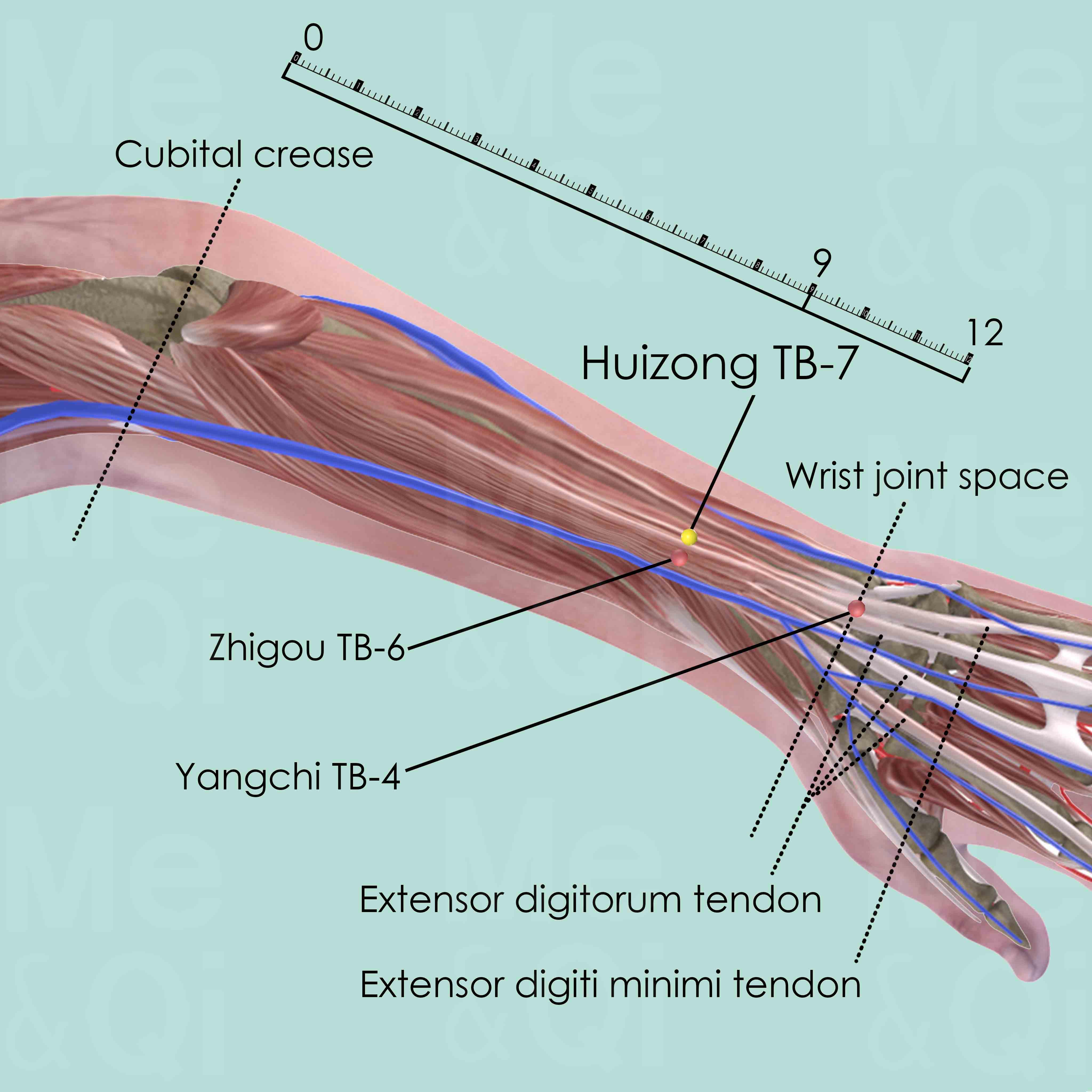 First identify Yangchi TB-4. Move the wrist in a relaxed way so that the joint space is more visible. TB-4 is located laterally to the joint space midpoint, in the depression between the tendons of the extensor digitorum and extensor digiti minimi muscle, which continues to the litter finger. Huizong TB-7 is located 3 cun above Yangchi TB-4 and 0.5 cun ulnar to the forearm center. Zhigou TB-6 is at the same level but 0.5 cun towards the radius.
