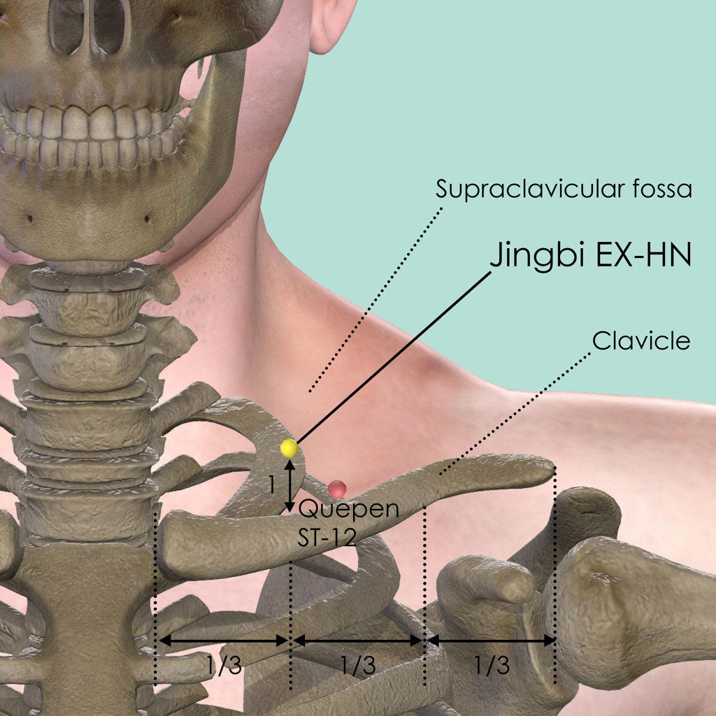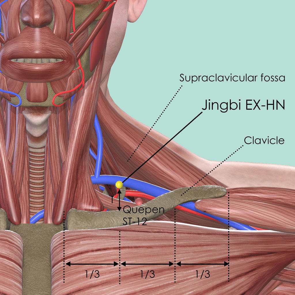 Measure a third of the clavicle from its medial end, then measure 1 cun in a superior direction, where locate Jingbi EX-HN in the supraclavicular fossa. Quepen ST-12 is very close to this point, directly superior to the midpoint of the clavicle.