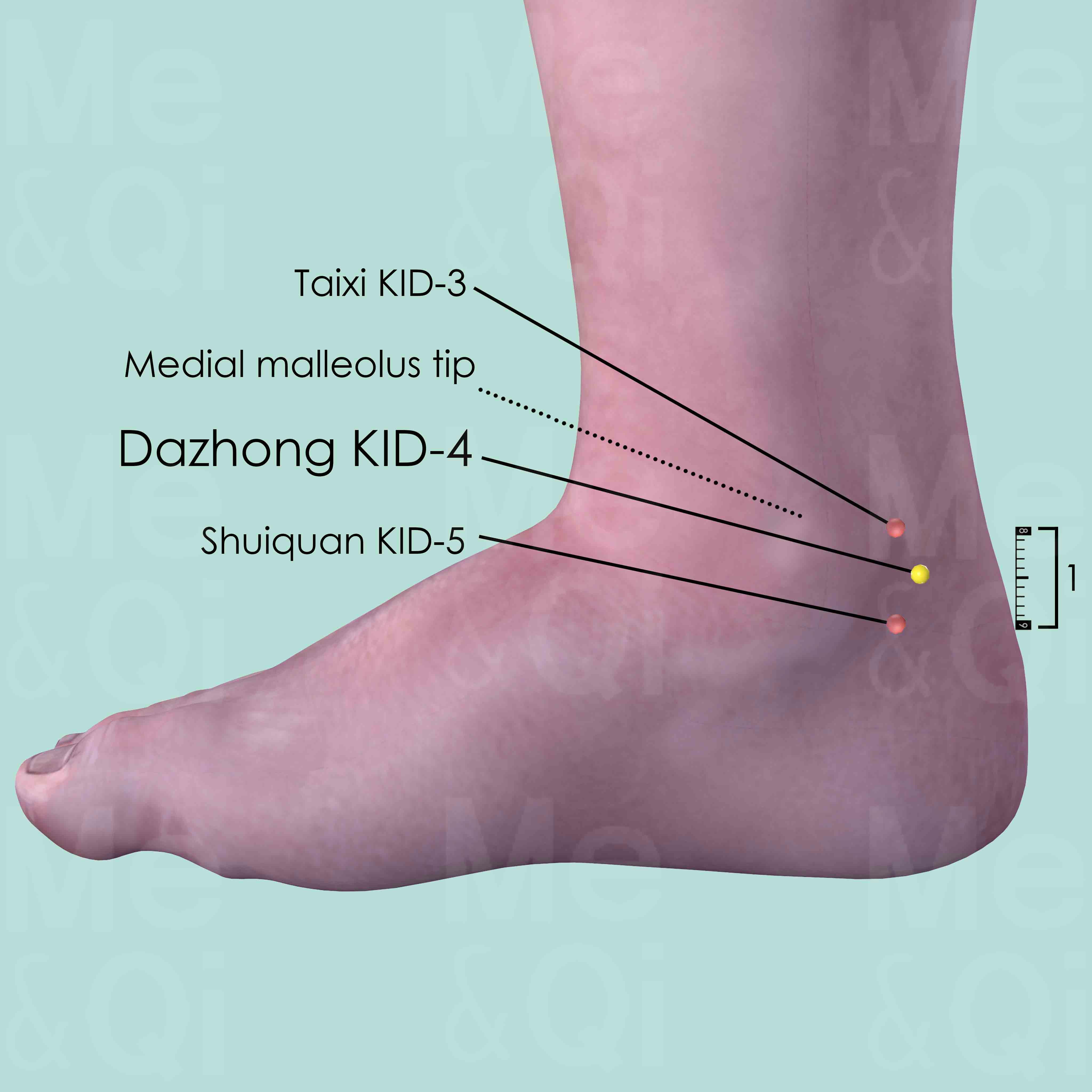 From the tip of the medial malleolus, draw a horizontal line to the medial border of the Achilles tendon. From there, measure 0.5 cun in a distal direction. Dazhong KID-4 is in a depression anterior to the Achilles tendon, slightly superior to its insertion at the calcaneus. Or: the point is located posterior to the midpoint of a line connecting Taixi KID-3 and Shuiquan KID-5 anterior to the Achilles tendon.
