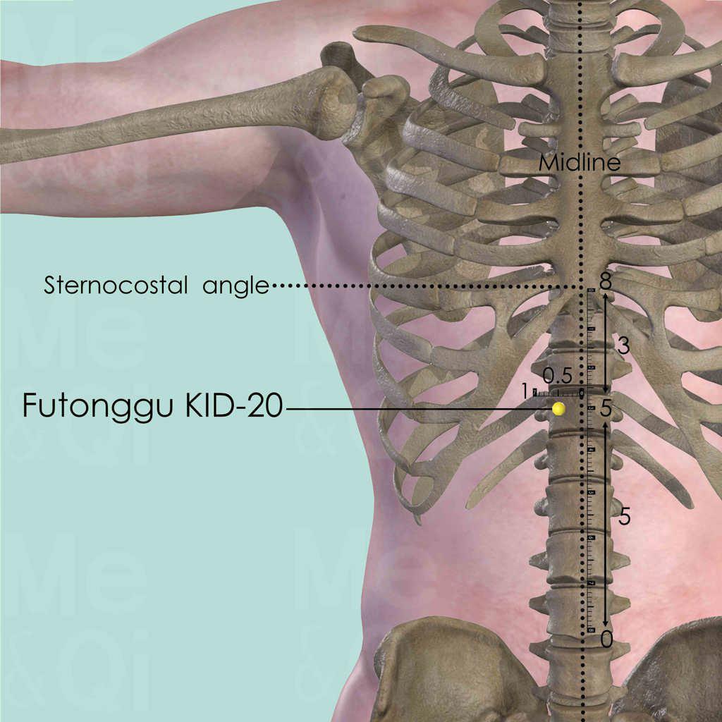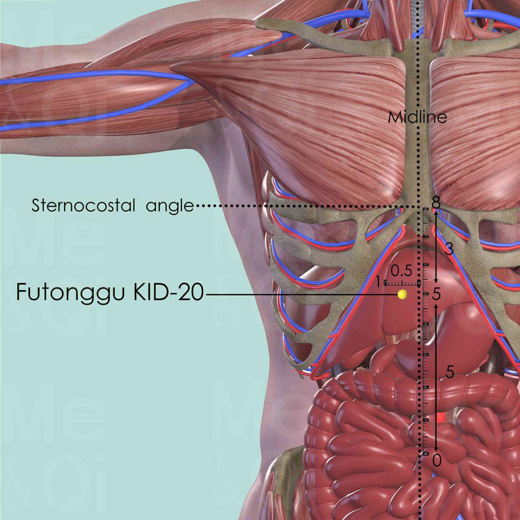 Divide the distance between the umbilicus center and the sternocostal angle into 8 equal parts. Each part is about 1 cun. Futonggu KID-20 is 5 cun above the umbilicus and 0.5 cun lateral to the anterior midline.