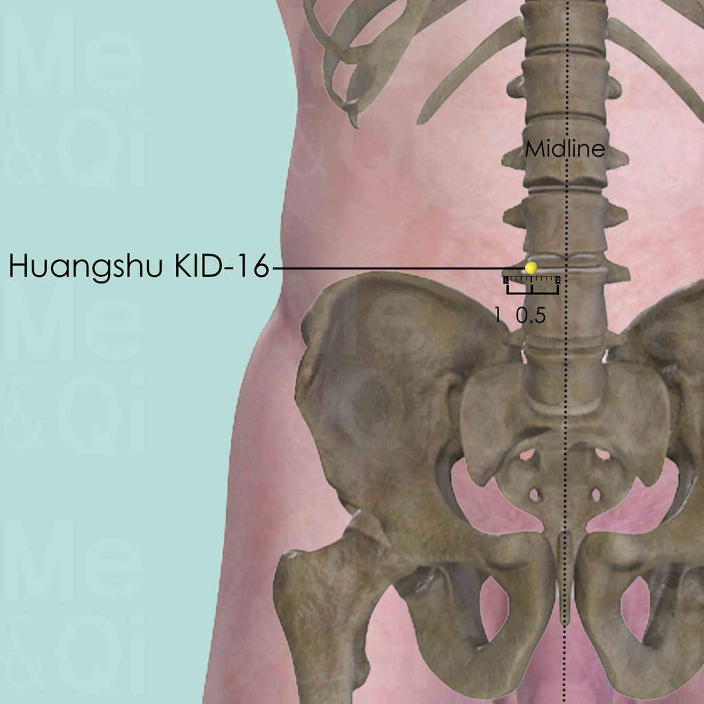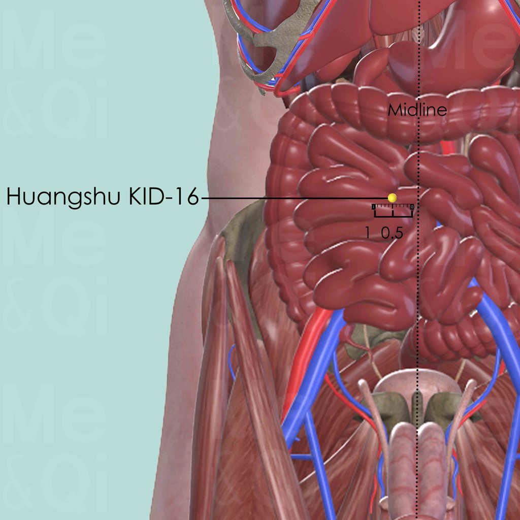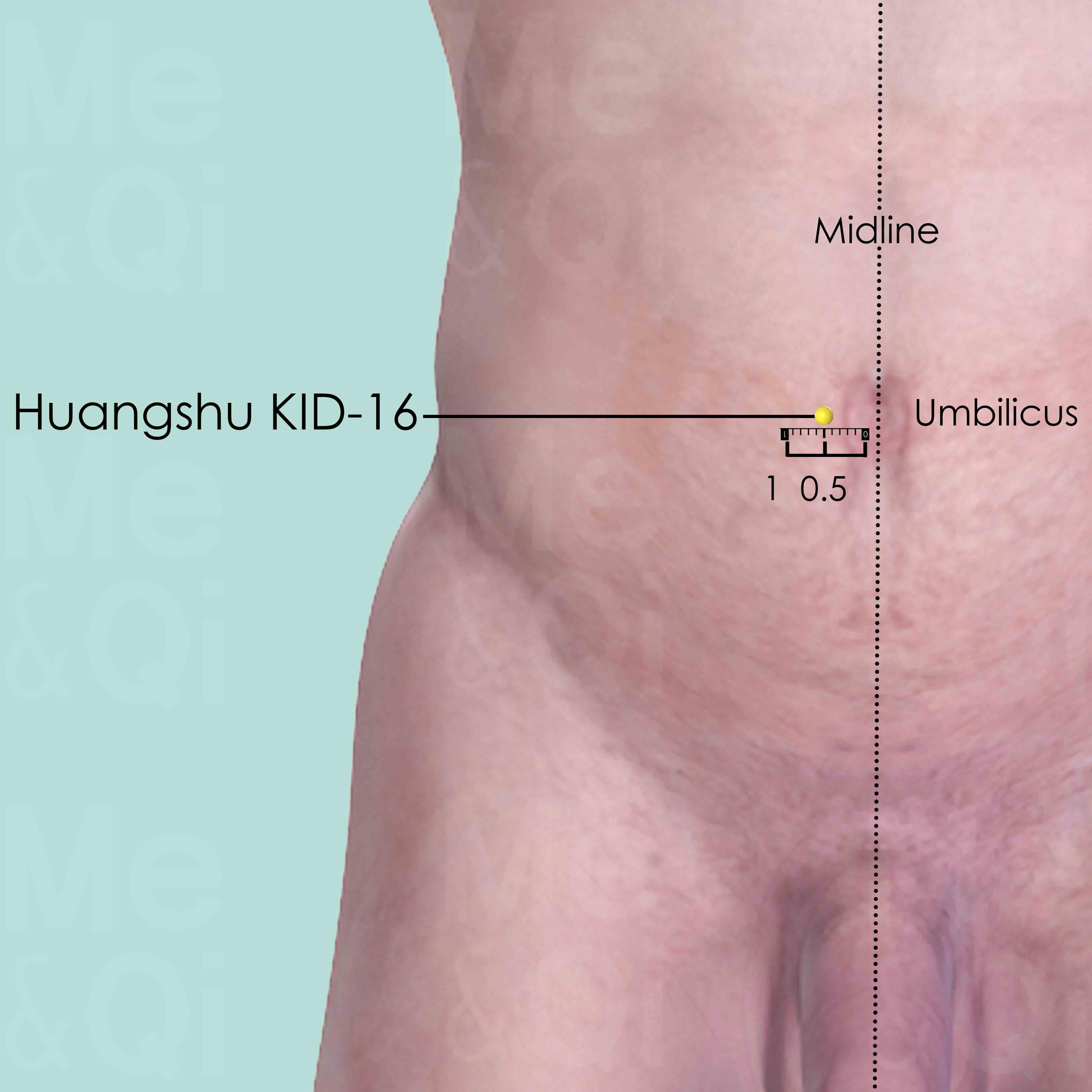 Locate Huangshu KID-16 at the same level as the umbilicus, but 0.5 cun in a lateral direction.