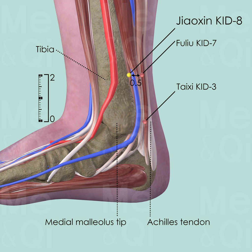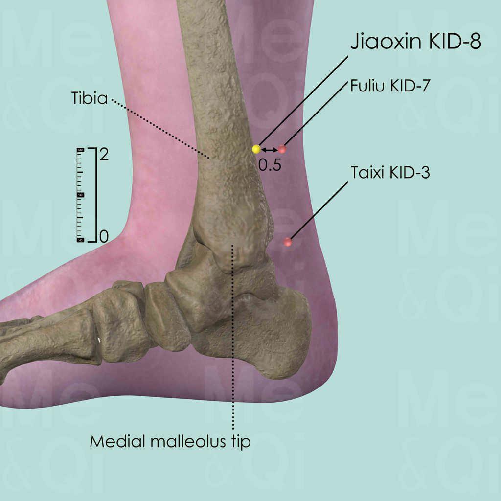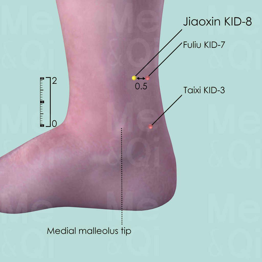 First identify Taixi KID-3 in a depression between the medial malleolus and Achilles tendon, level with the tip of the medial malleolus. Then identify Fuliu KID-7 by measuring 2 cun towards the knee, in a depression at the anterior border of the Achilles tendon. Jiaoxin KID-8 is at the same level as KID-7, approximately 0.5 cun closer to the border of the tibia.