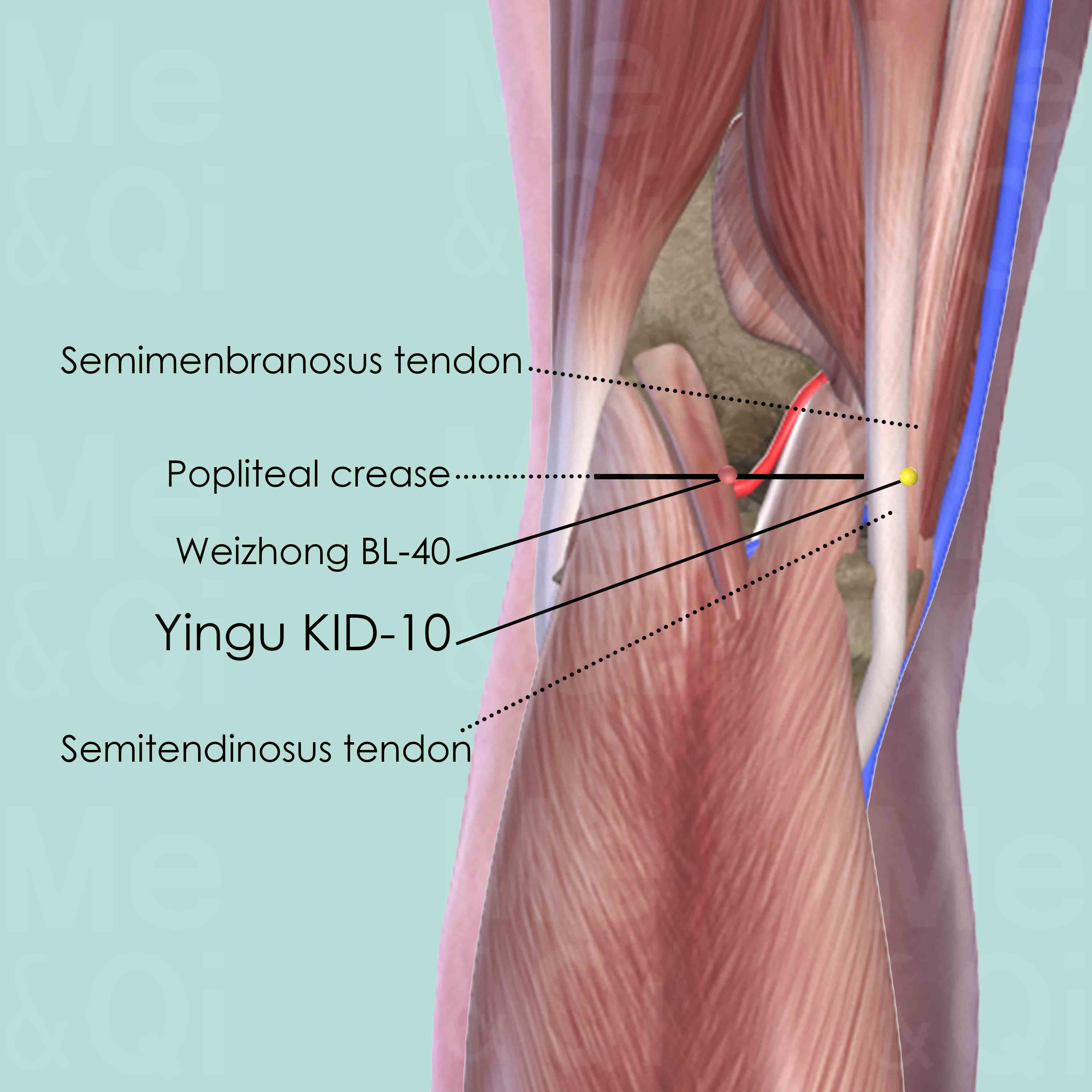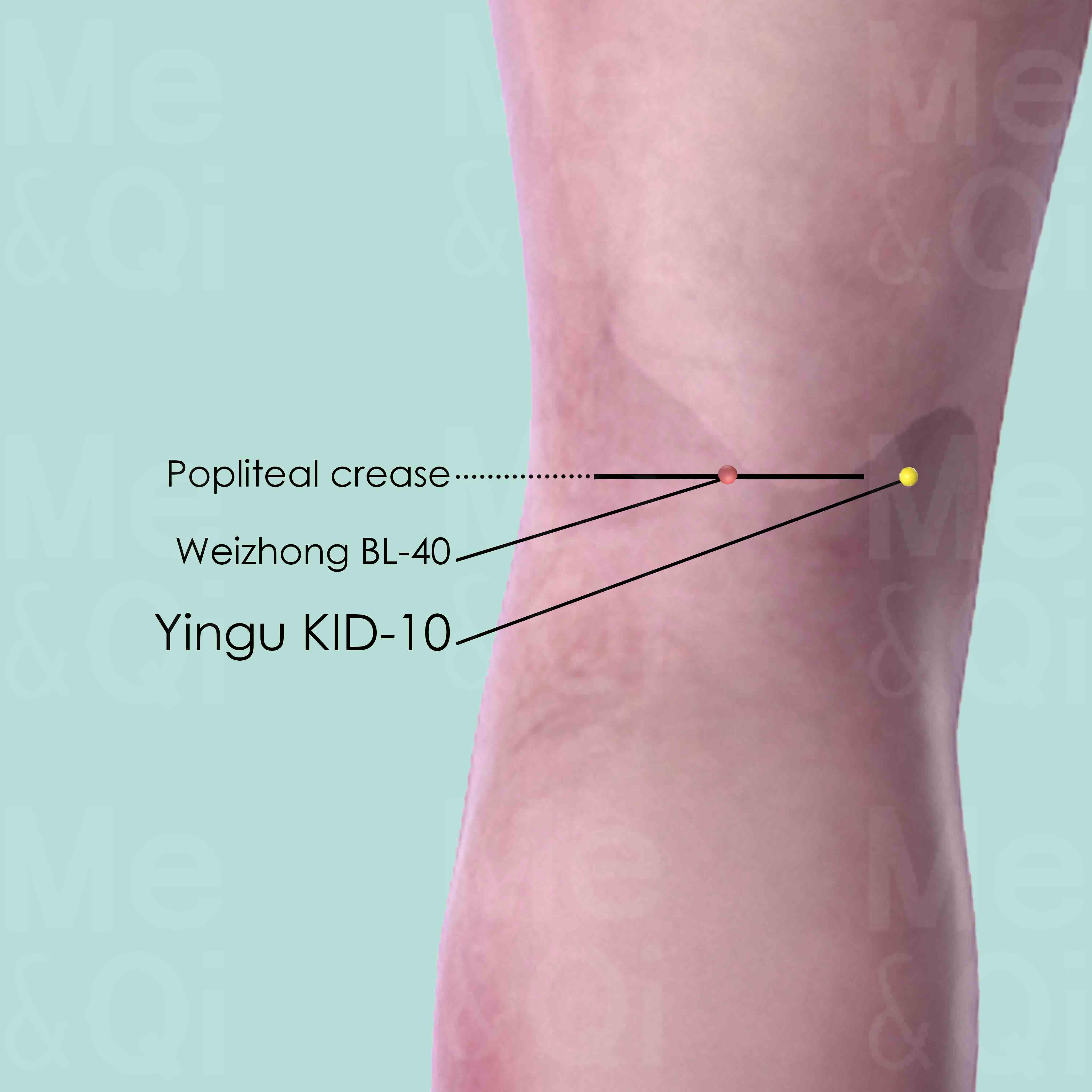 Flex the knee at less than 90° and press the heel against the floor to reveal the tendons of the semimembranosus and semitendinosus muscles in the popliteal crease. Locate Yingu KID-10 in a small gap between the more prominent tendon of the semitendinosus muscle and the less obvious tendon of the semimembranosus muscle.