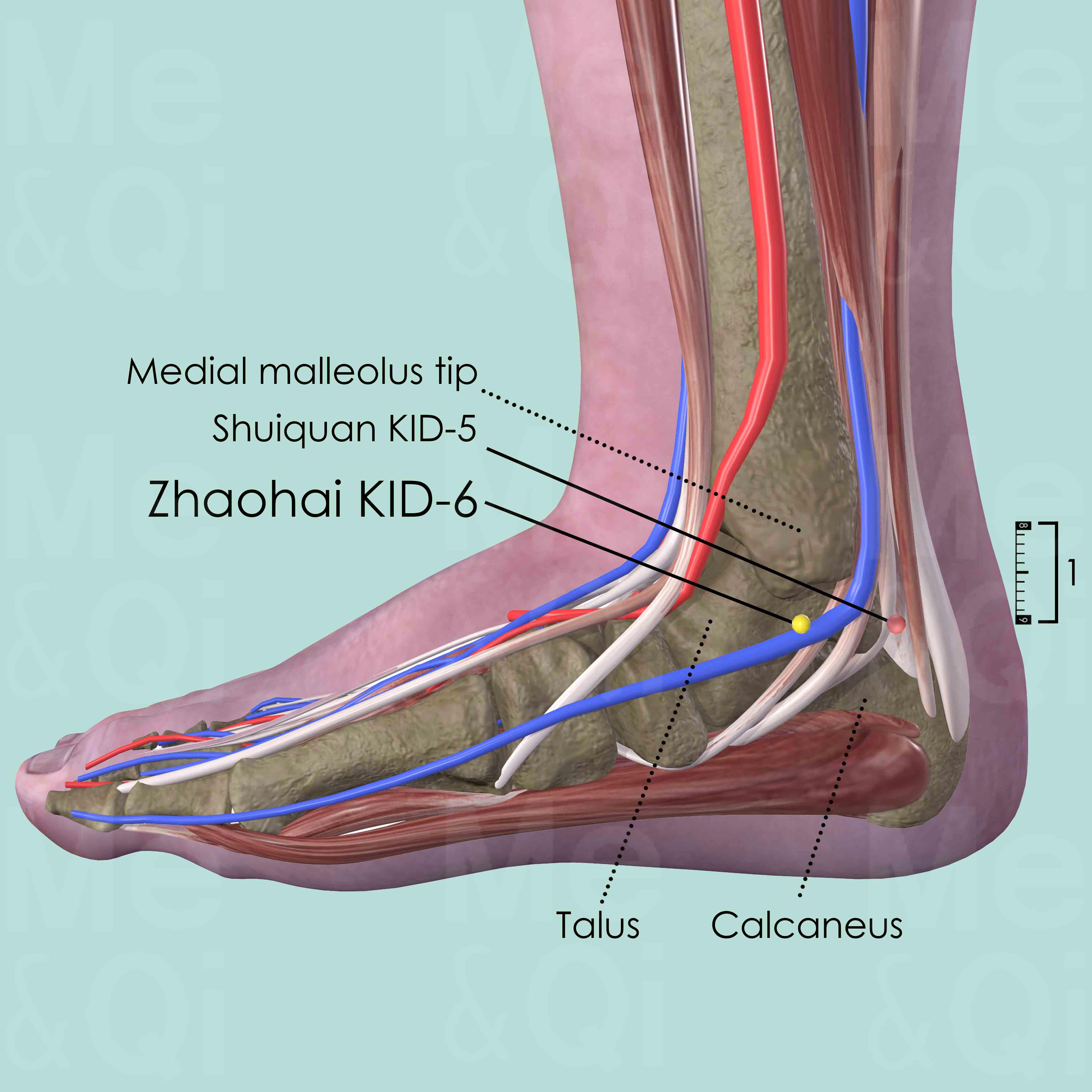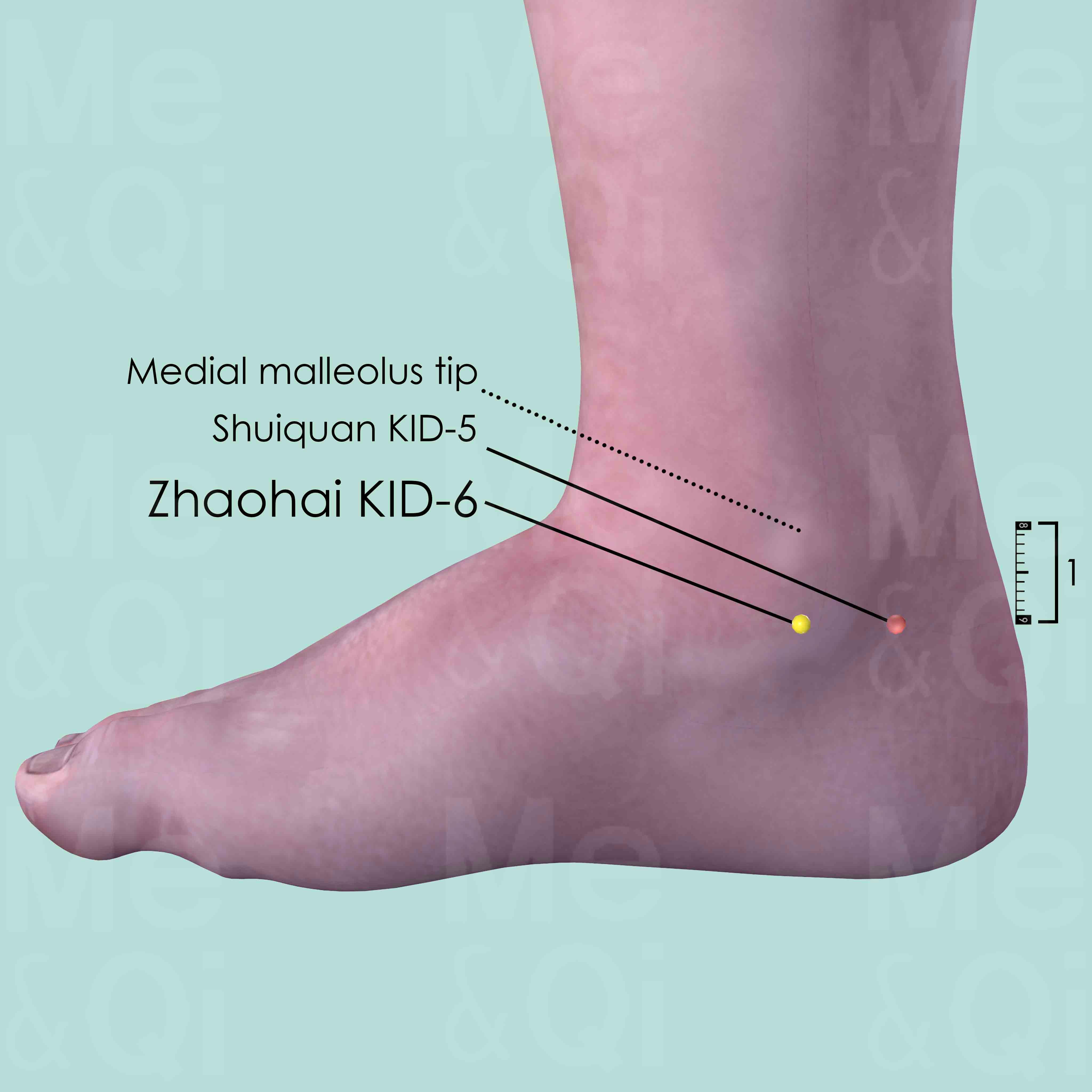 Palpate distally from the tip of the medial malleolus, until reaching the depression of the joint space between the talus and the calcaneus. Shuiquan KID-5 is at the same level as Zhaohai KID-6. It is also located between the two foot bones mentioned above.