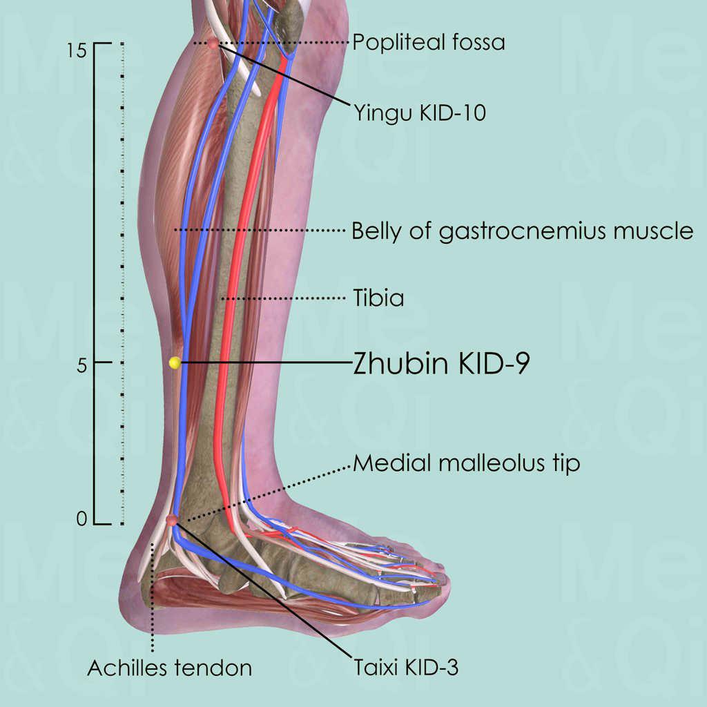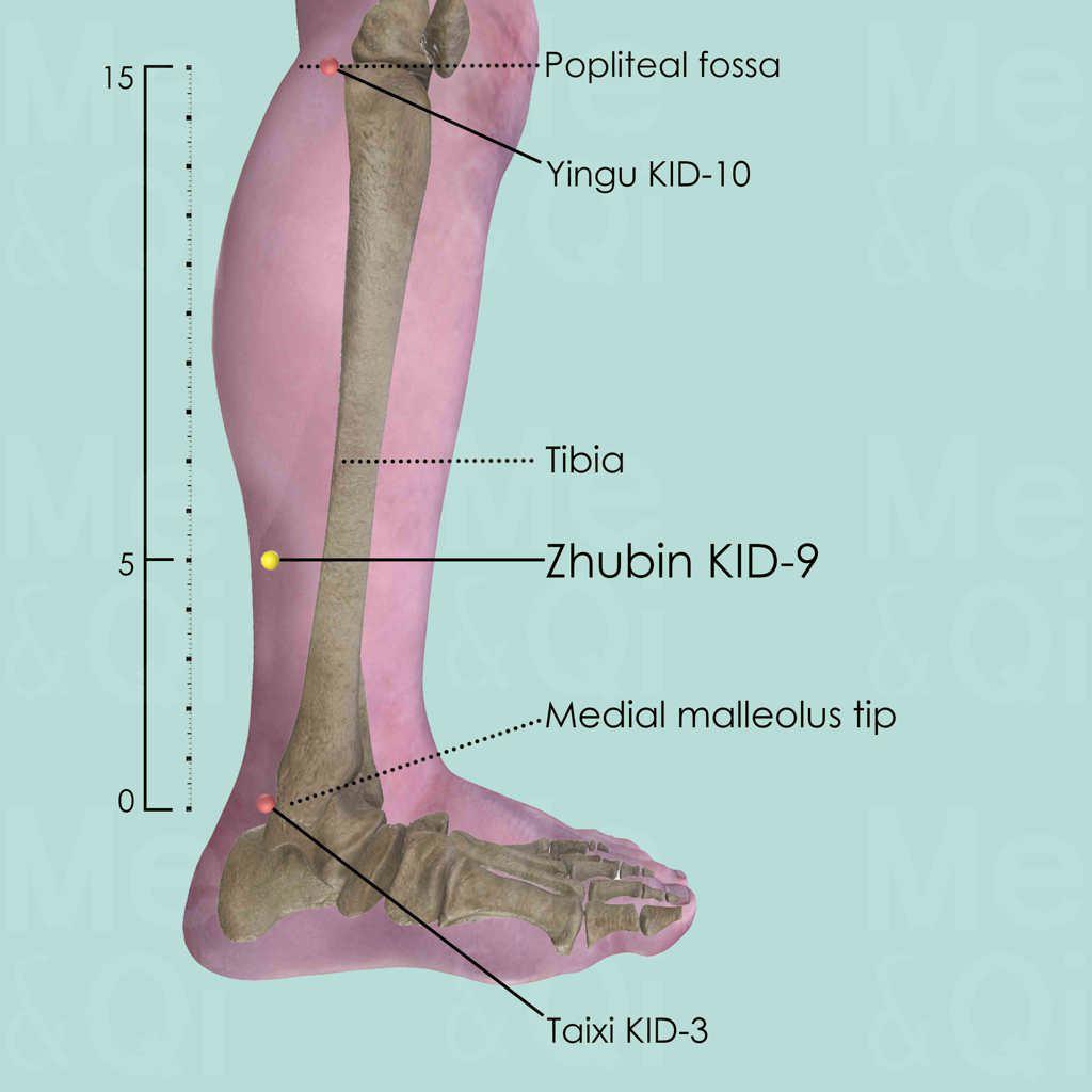First identify Taixi KID-3 in a depression between the medial malleolus and Achilles tendon, level with the tip of the medial malleolus. Then locate Yingu KID-10 on the medial side of the popliteal fossa when the knee is flexed. Draw an imaginary line between these two reference points and locate Zhubin KID-9, 5 cun above KID-3, 2 cun posterior to the medial border of the tibia.