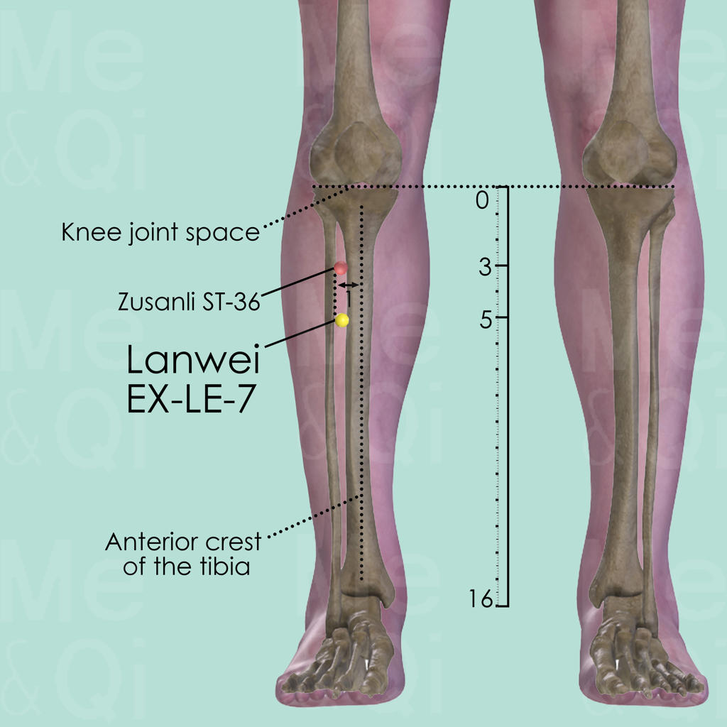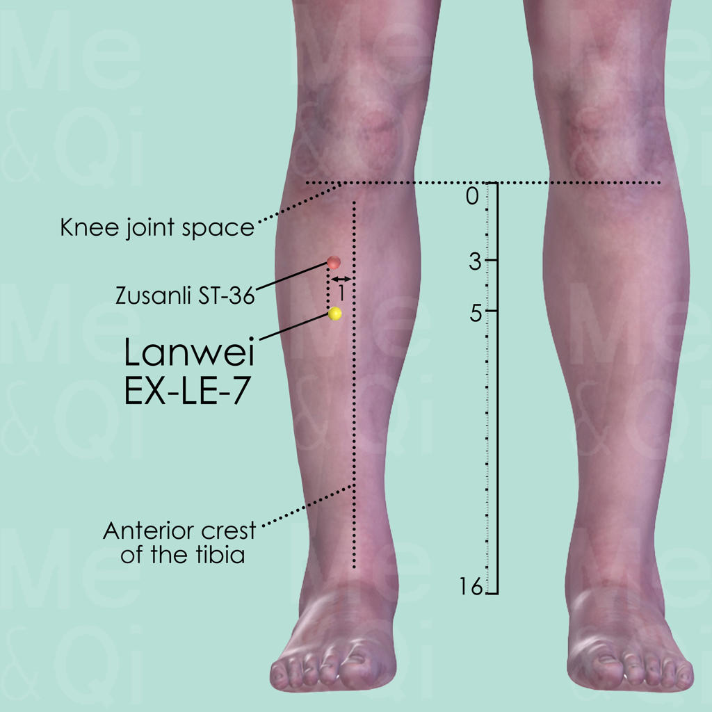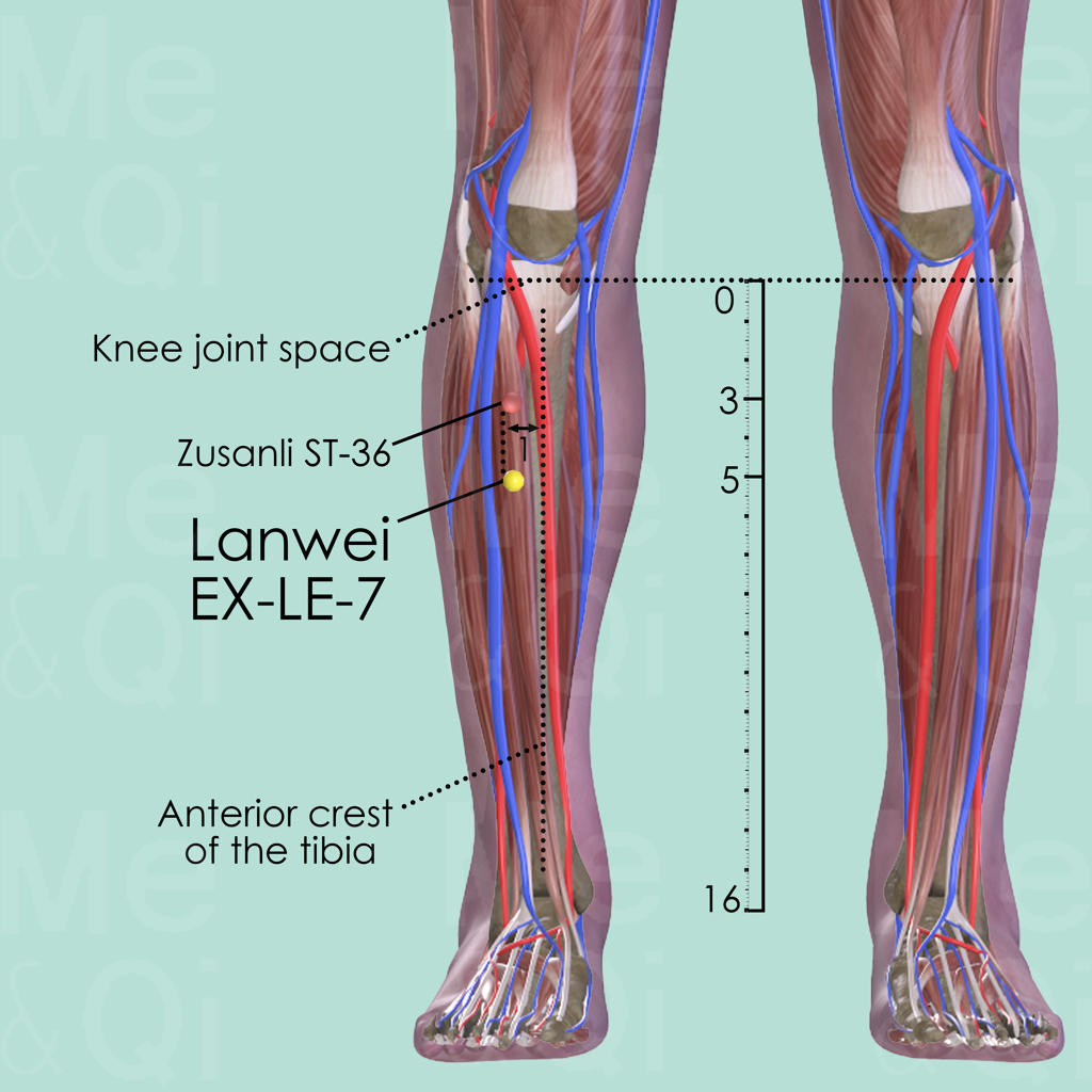 On the Stomach Channel of the right leg, Lanwei EX-LE-7 is about 2 cun distal to Zusanli ST-36, in the most tender point of that area.