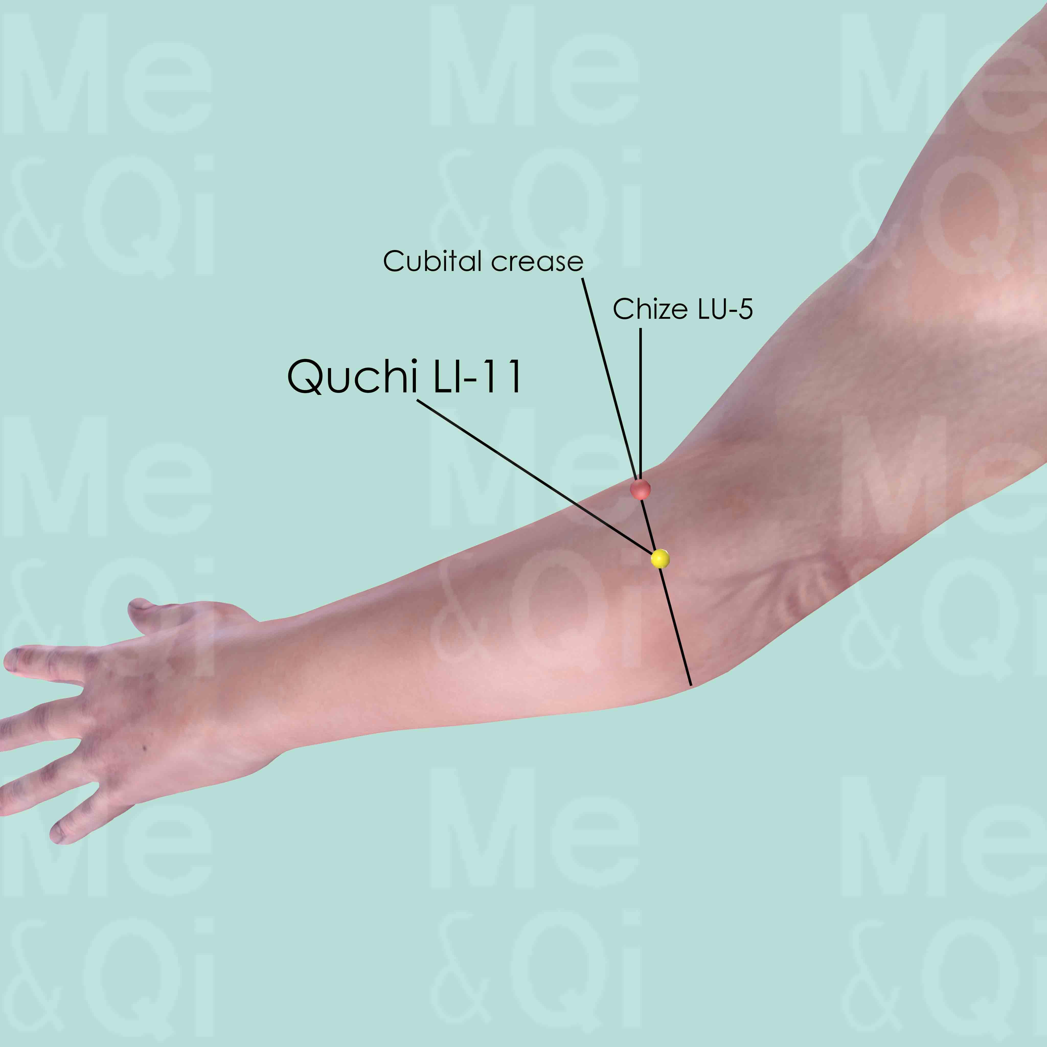 When the elbow is flexed, Quchi LI-11 is in the depression at the lateral end of the cubital crease, midway between Chize LU-5 and the lateral epicondyle of the humerus.