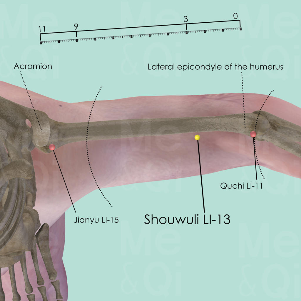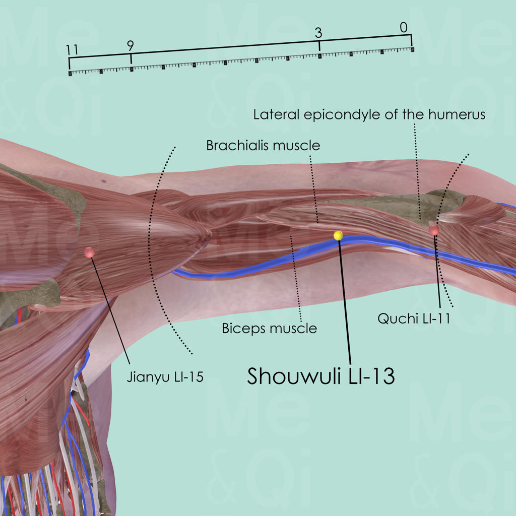 First identify the line connecting Quchi LI-11 at the lateral end of the elbow crease and Jianyu LI-15 in a depression anterior and inferior to the acromion. Locate Shouwuli LI-13 on this line, 3 cun above Quchi LI-11, on the lateral border of the biceps, in a depression between the biceps and the brachialis muscle. It is easier to locate the point when the elbow is flexed at 90°.