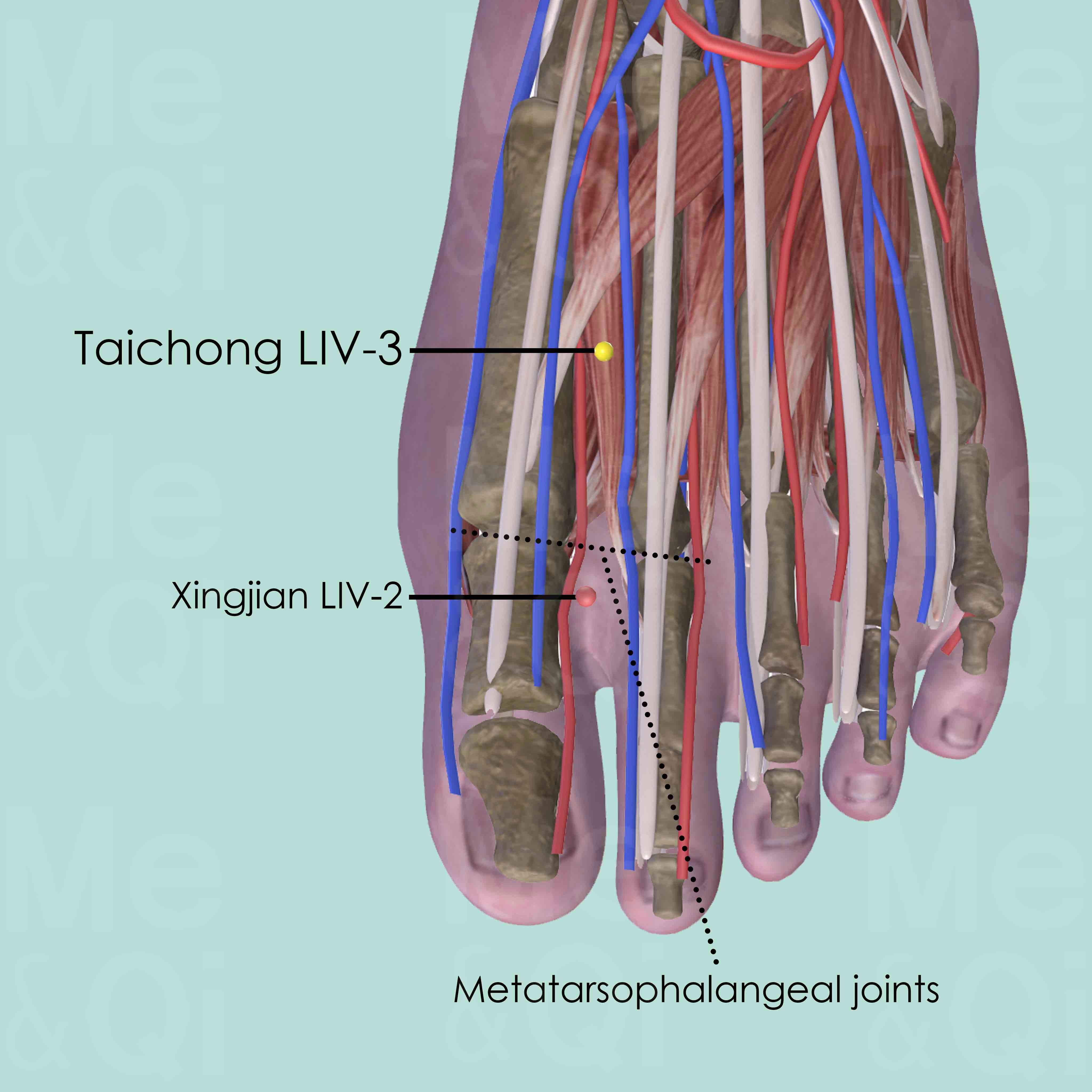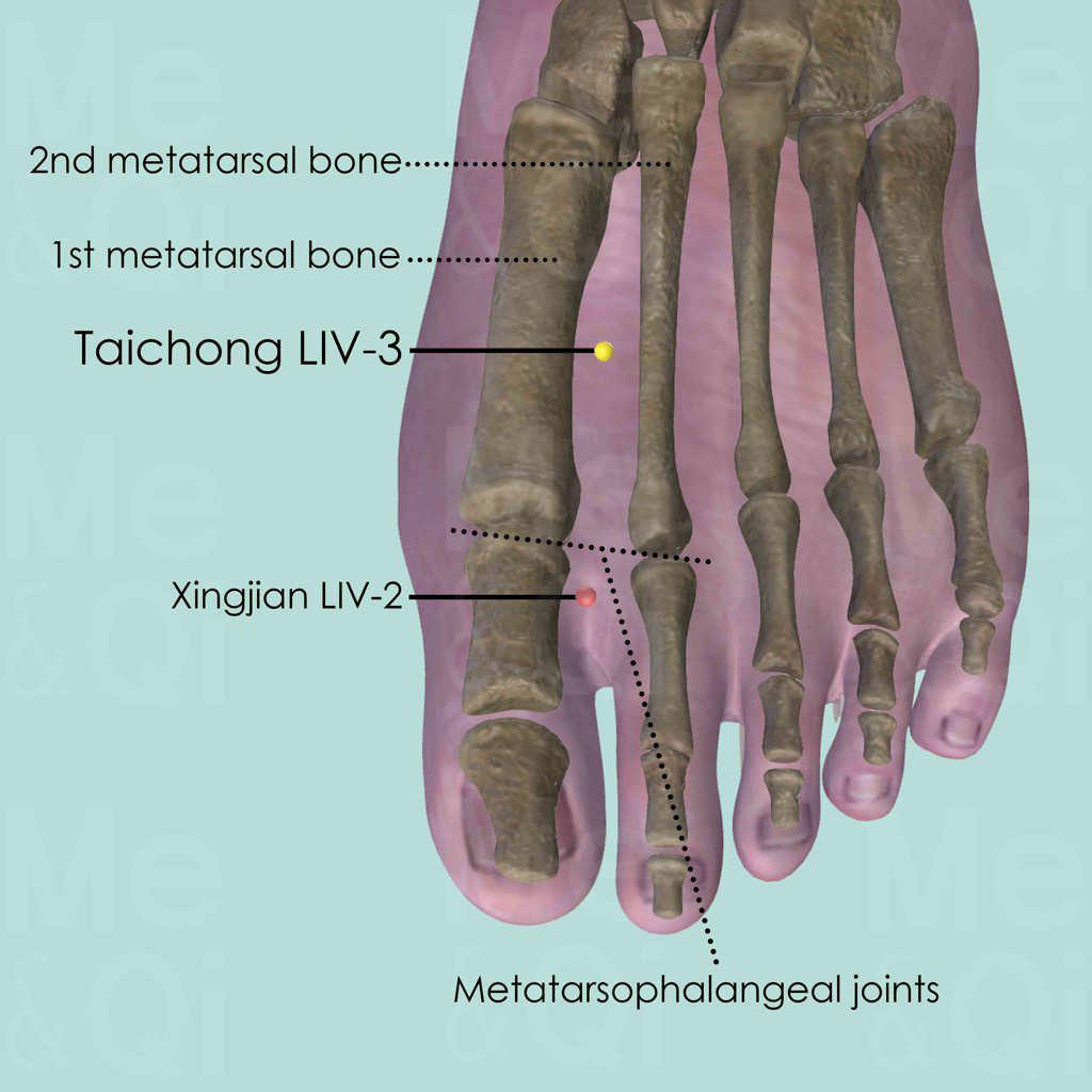 Run a finger from Xingjian LIV-2 along the groove between the 1st and 2nd metatarsal bones. Locate LIV-3 at the widest and deepest part of the groove. To double check, the groove become more narrow and shallow again from LIV-3.