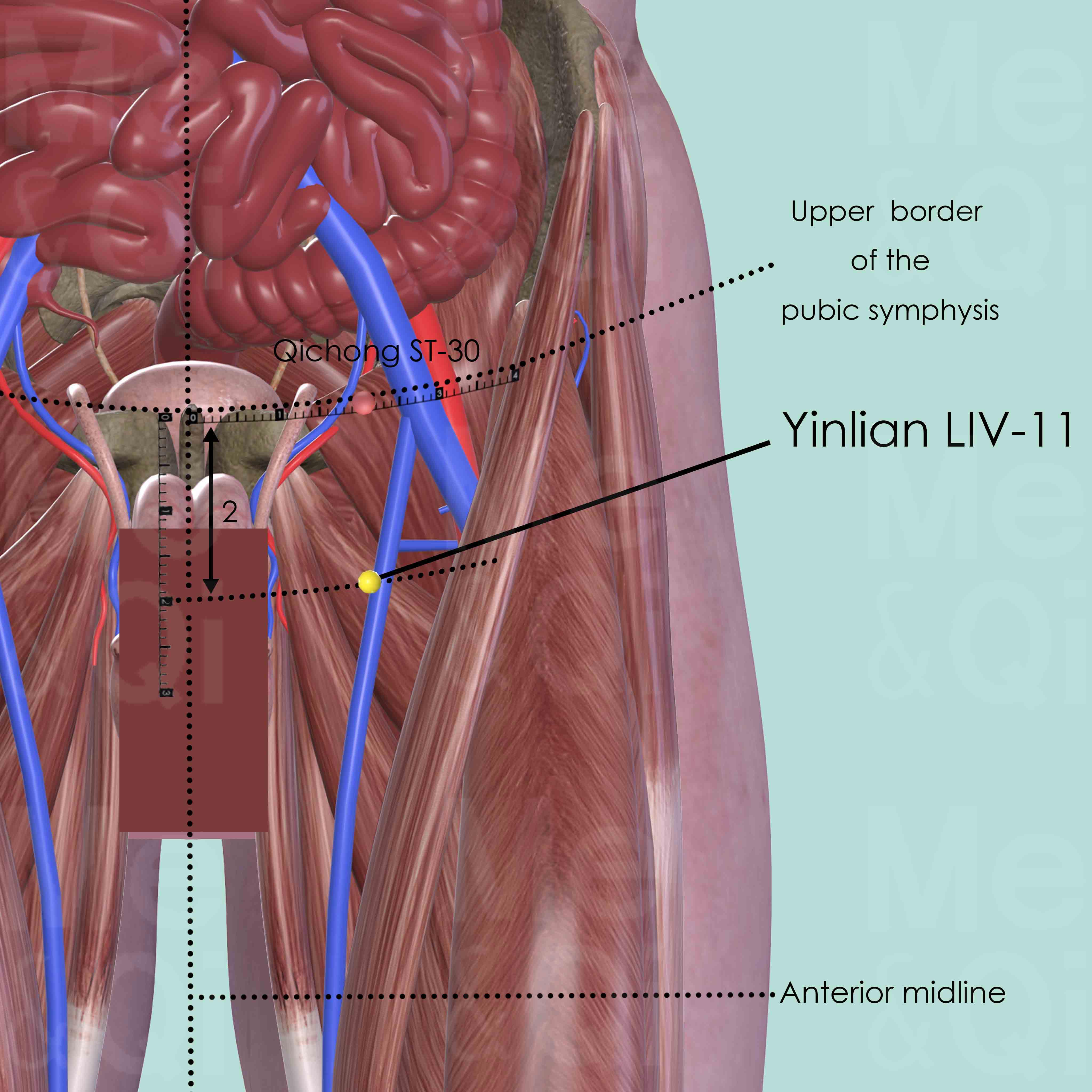 Flex the adductors by pressing feet against each other. Locate LIV-11 2 cun inferior to the upper border of the pubic symphysis and 2 cun lateral to the anterior midline.