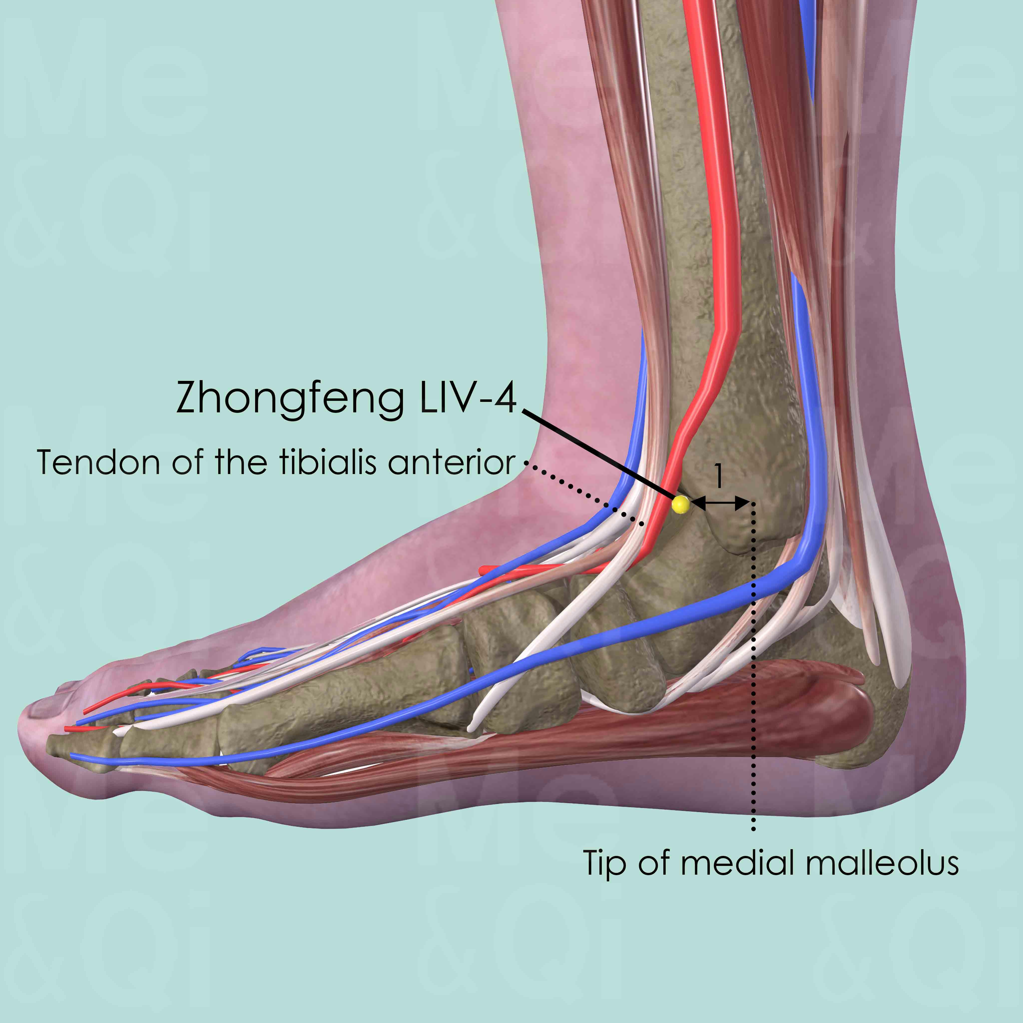 With slight ankle dorsiflexion, the tendon of the tibialis anterior muscles becomes more pronounced on the medial aspect of the ankle. Zhongfeng LIV-4 is located in the depression between the tendon and the tip of the medial malleolus.