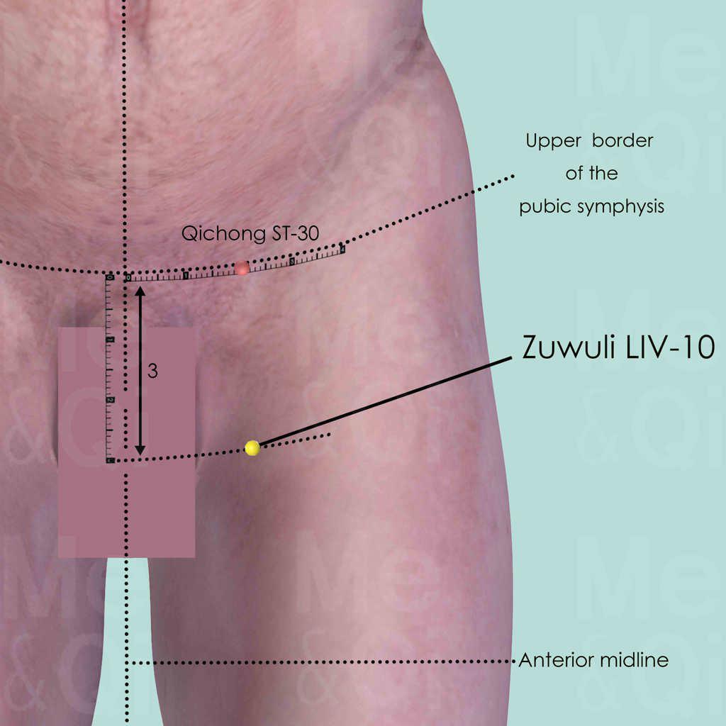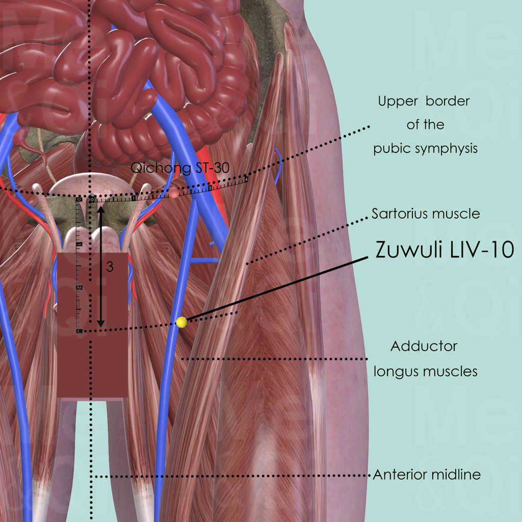 Flex the adductors by pressing feet against each other. Locate Zuwuli LIV-10 in the depression on the lateral border of the adductor longus muscles, where it forms an angle with the sartorius muscle.