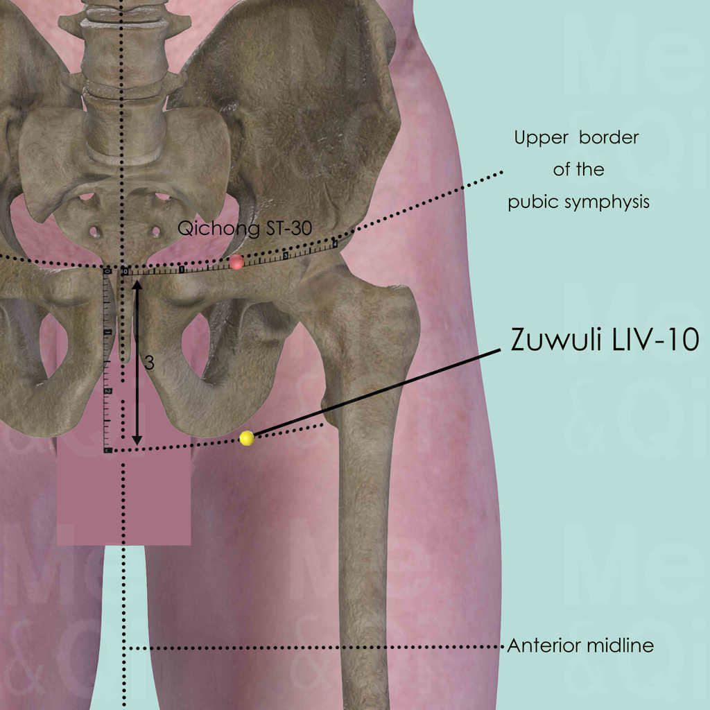 3 cun inferior to Qichong ST-30 which is on the upper border of the symphysis and 2 cun lateral to the anterior midline. The point is also on the lateral border of adductor longus muscle.