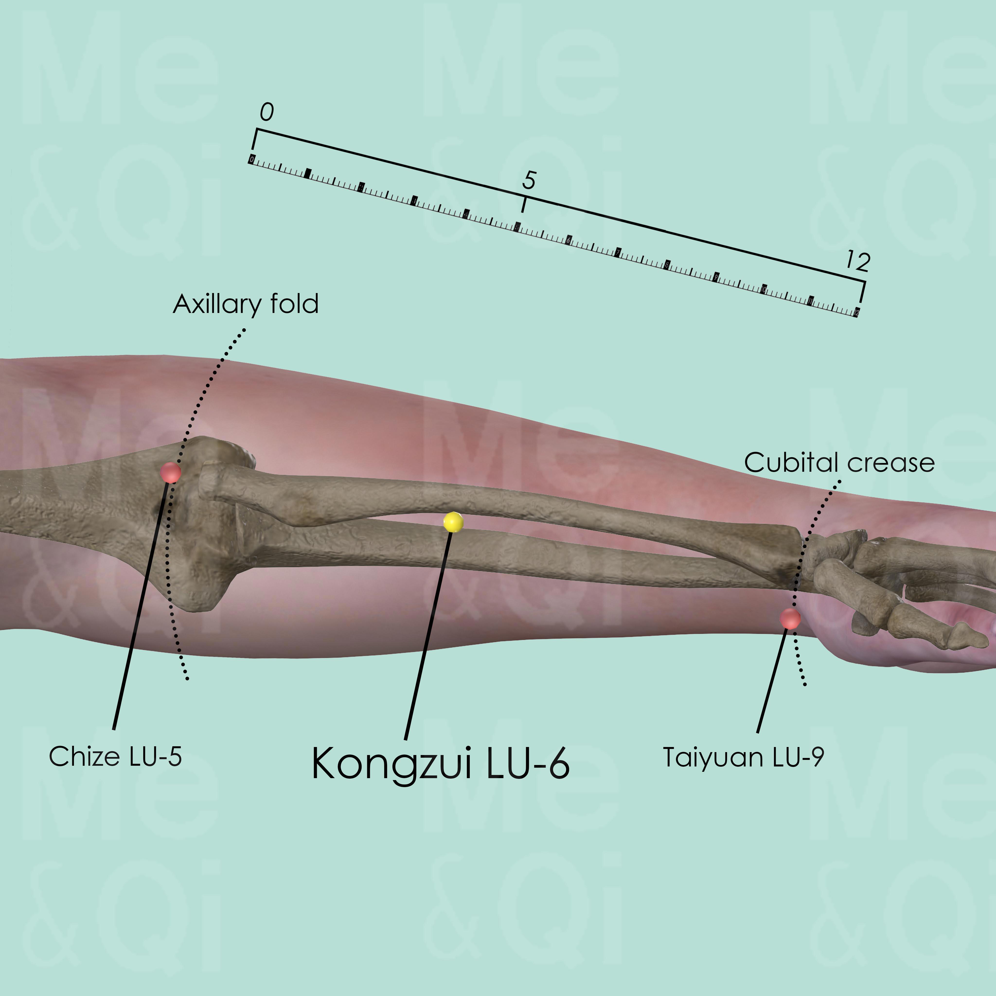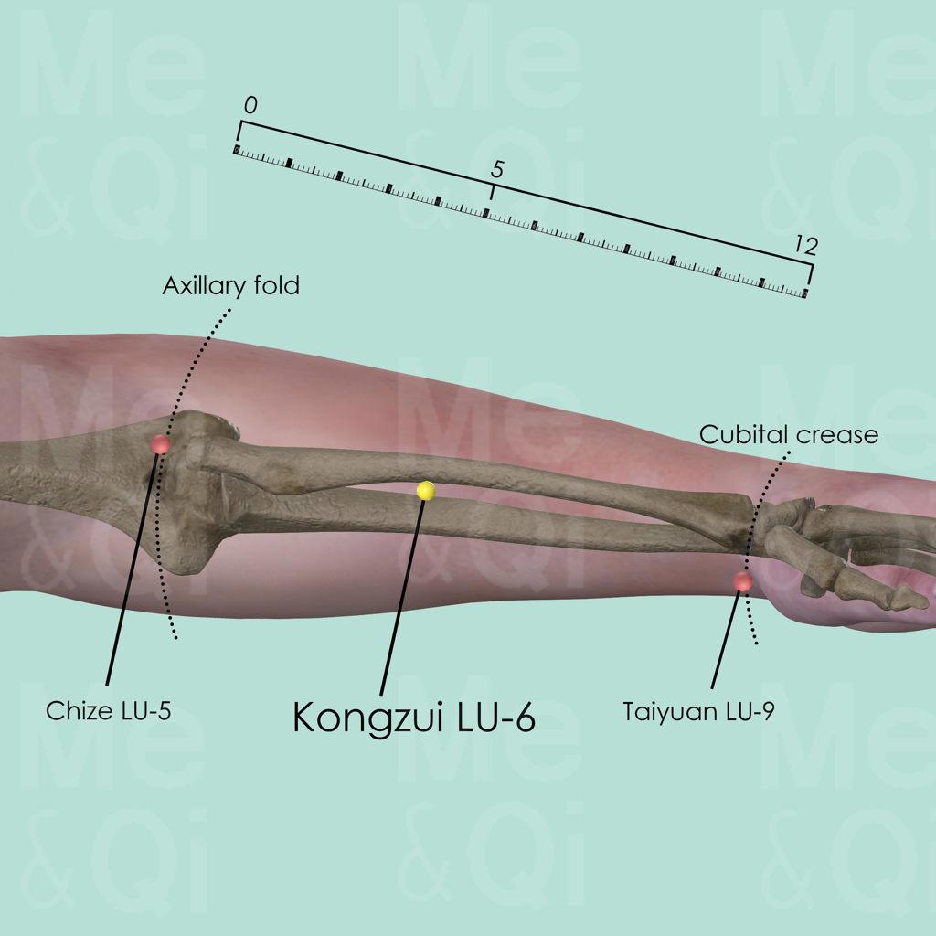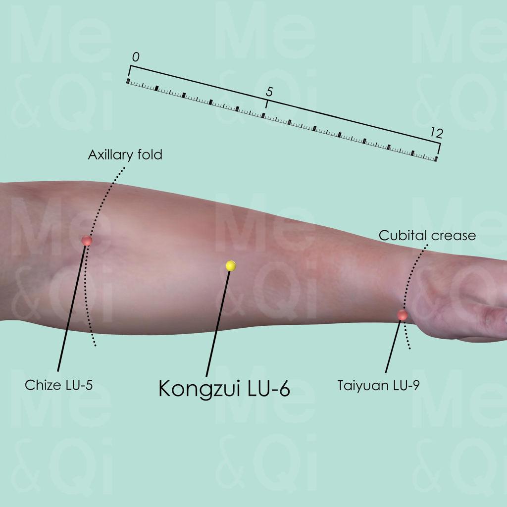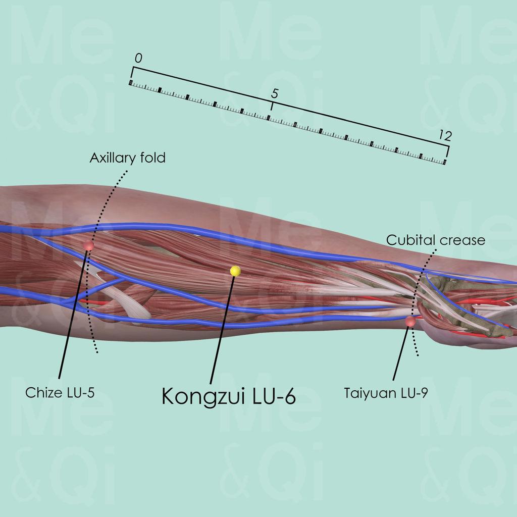Flex the arm to make the biceps tendon more visible. Locate Chize LU-5 on the radial aspect of the cubital crease, locate Taiyuan LU-9 on the radial artery of the wrist joint. Kongzui LU-6 is 1 cun proximal to the midpoint of the two mentioned points above. It is also 7 cun above Tayuan LU-9 and 5 cun below Chize LU-5.