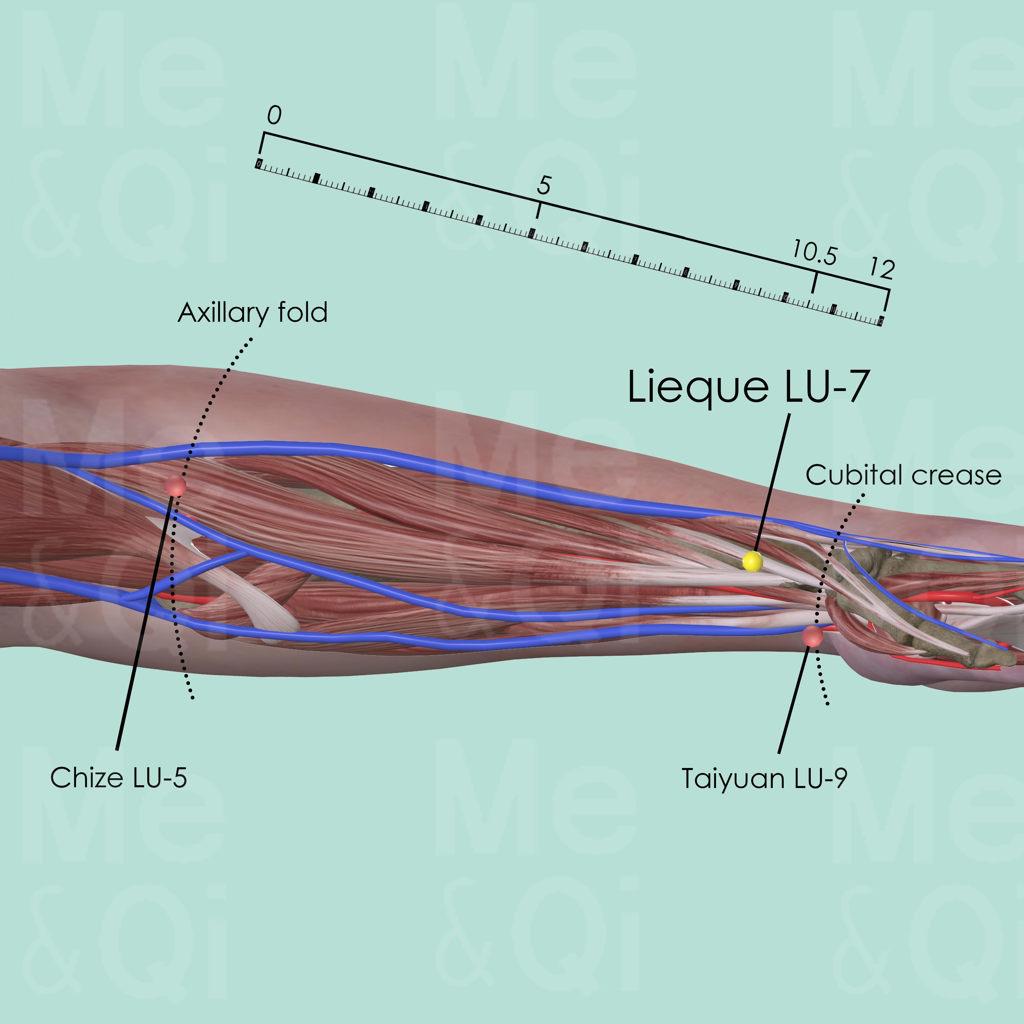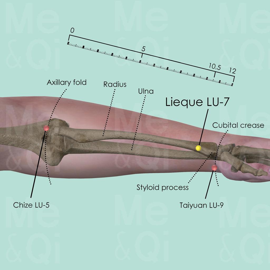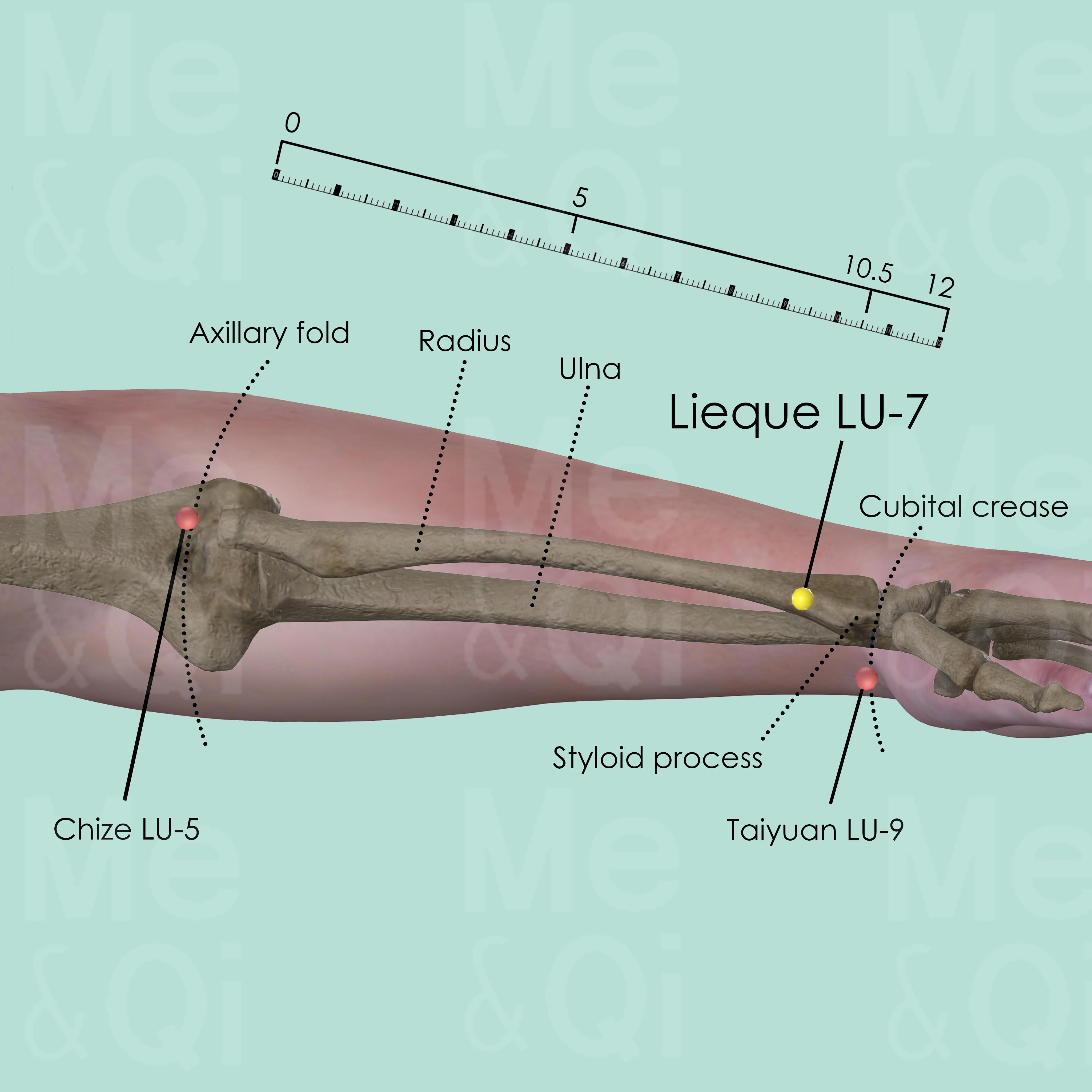 Lieque LU-7 is a very important point, because it stimulates the Lung Qi descending and diffusing, enhances the Defensive Qi flow between the skin and muscle and releases external Pernicious Influences (mainly Wind-Cold or Wind-Heat) from the Exterior through sweating.