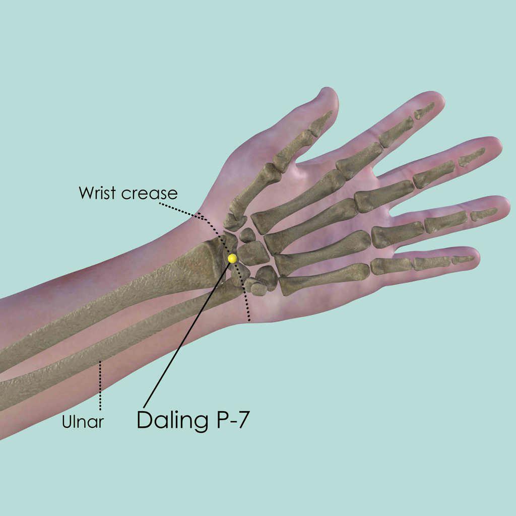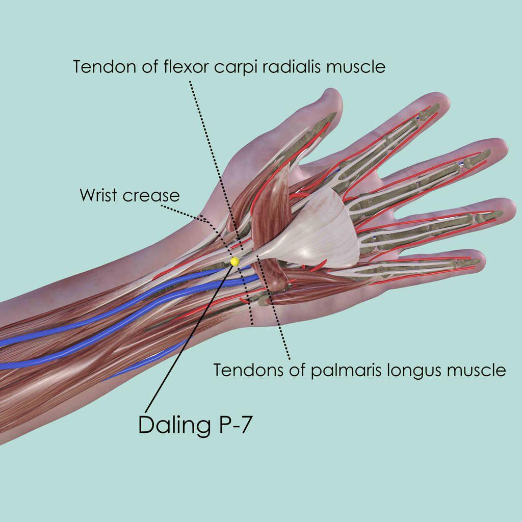 First identify the wrist joint space and locate Daling P-7 in the middle between the two tendons, which is easier to palpate when the fingertips are pressed together. If only one tendon is visible, it will be the tendon of the flexor carpi radialis muscle, which goes to the index finger. P-7 is on its ulnar side.