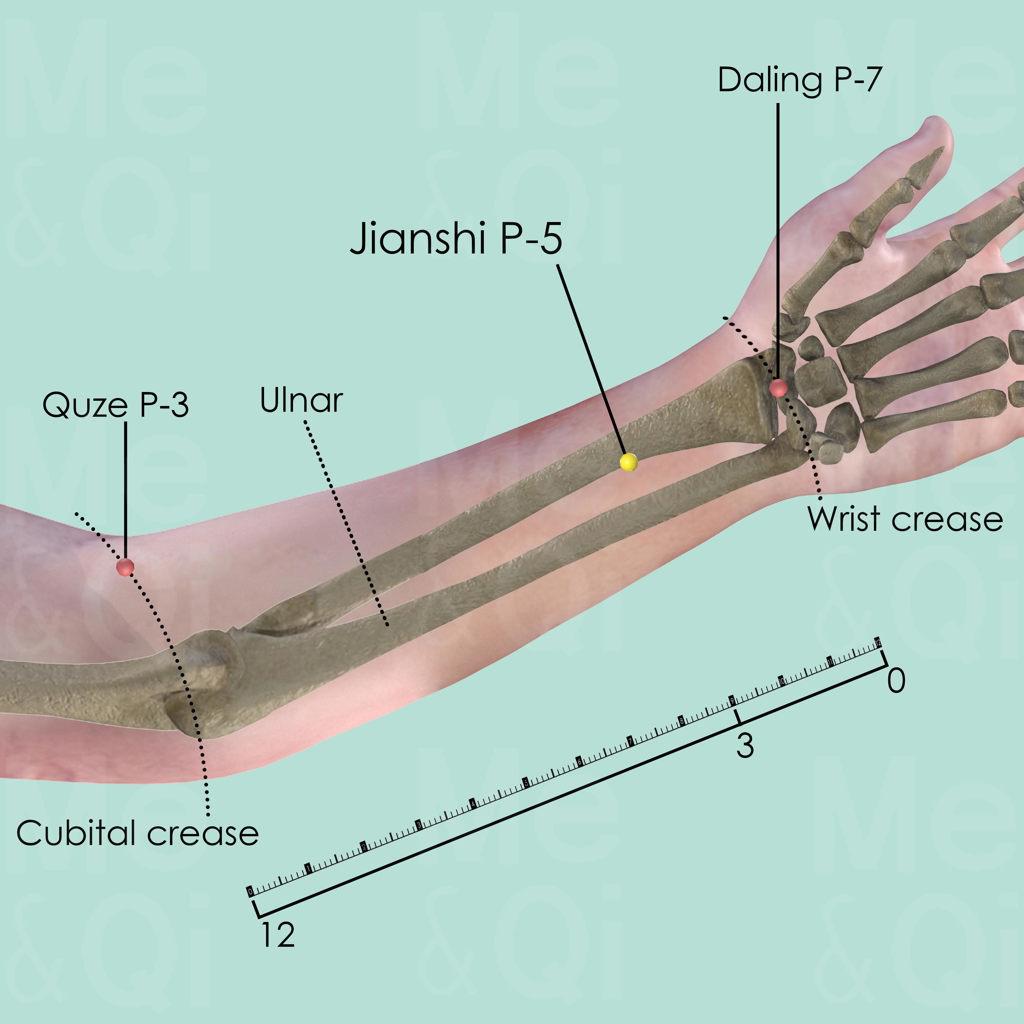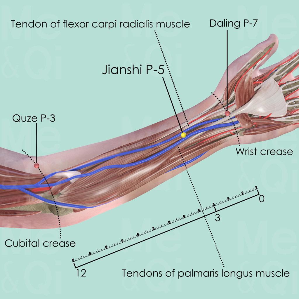 First locate Daling P-7 at the middle of the cubital crease (wrist joint space) and measure 3 cun in a proximal direction. Then make a fist and make the tendons of palmaris longus and flexor carpi radialis muscle more visible. Jianshi P-5 is between these two tendons.
