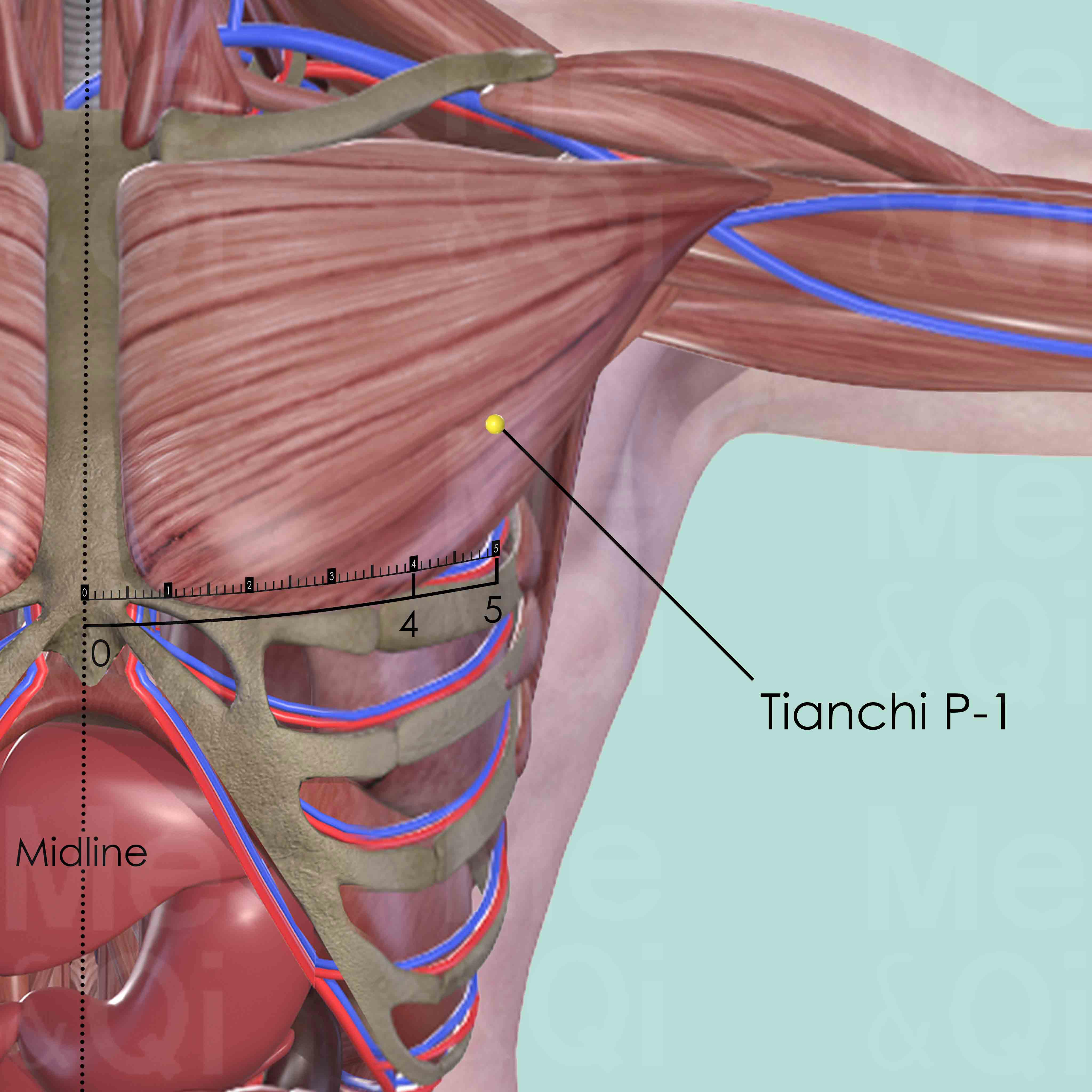 Locate Tianchi P-1 1 cun lateral to the nipple in the 4th intercostal space, which is on the same level of the nipples.