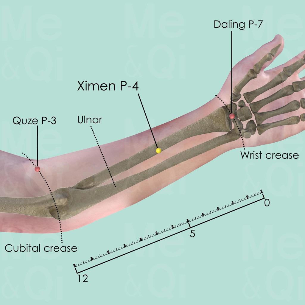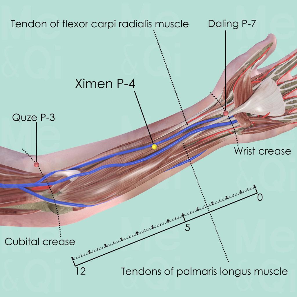 Ximen P-4 is mostly used in acute conditions and is very effective in opening the chest and remove Heart Blood Stagnation so as to stop pain. As the Accumulation-Xi point, it is particularly useful in removing the Obstruction in Pericardium Channel. Therefore, it can ease chest and Heart pain.