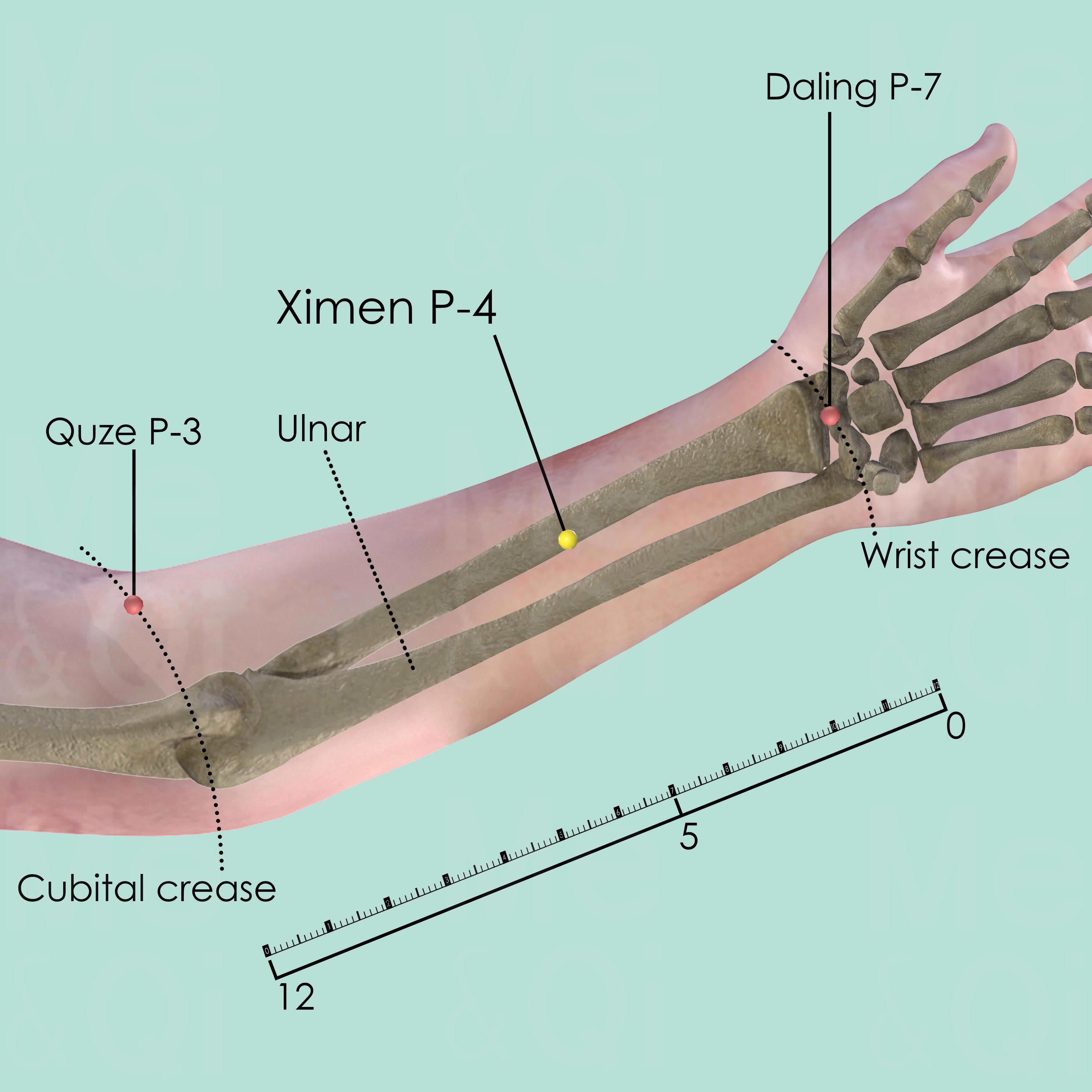 First locate Daling P-7 in the center of the anterior wrist joint space and Quze P-3 in the cubital crease. Use the spread finger technique by placing the little fingers in both points and identify the middle point, from where measure 1 cun in a distal direction. On this level, locate Ximen P-4 between the tendons of palmaris longus and flexor carpi radialis muscles. If only one tendon is visible, this will be the tendon of the flexor carpi radialis muscle. P-4 is located on its ulnar aspect.