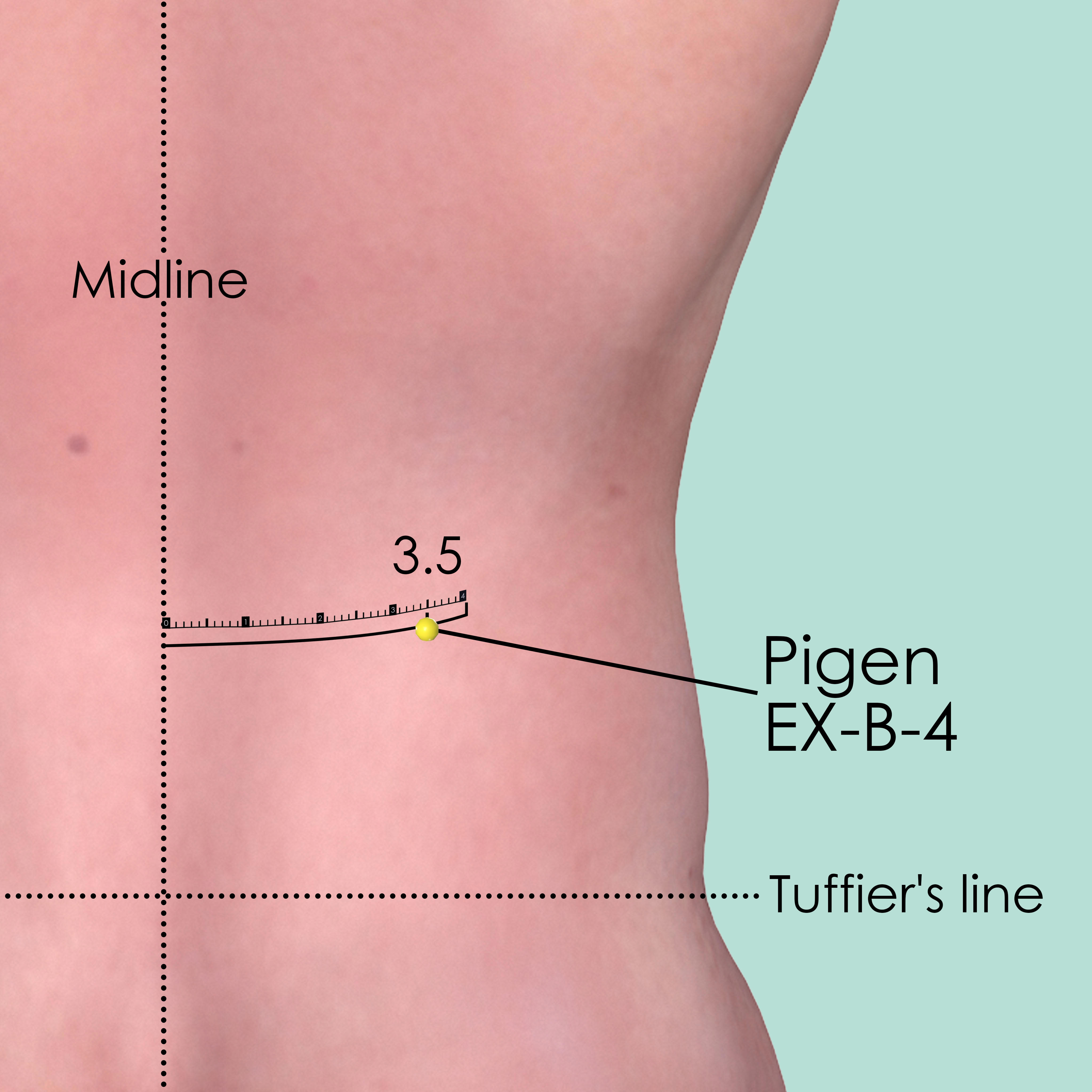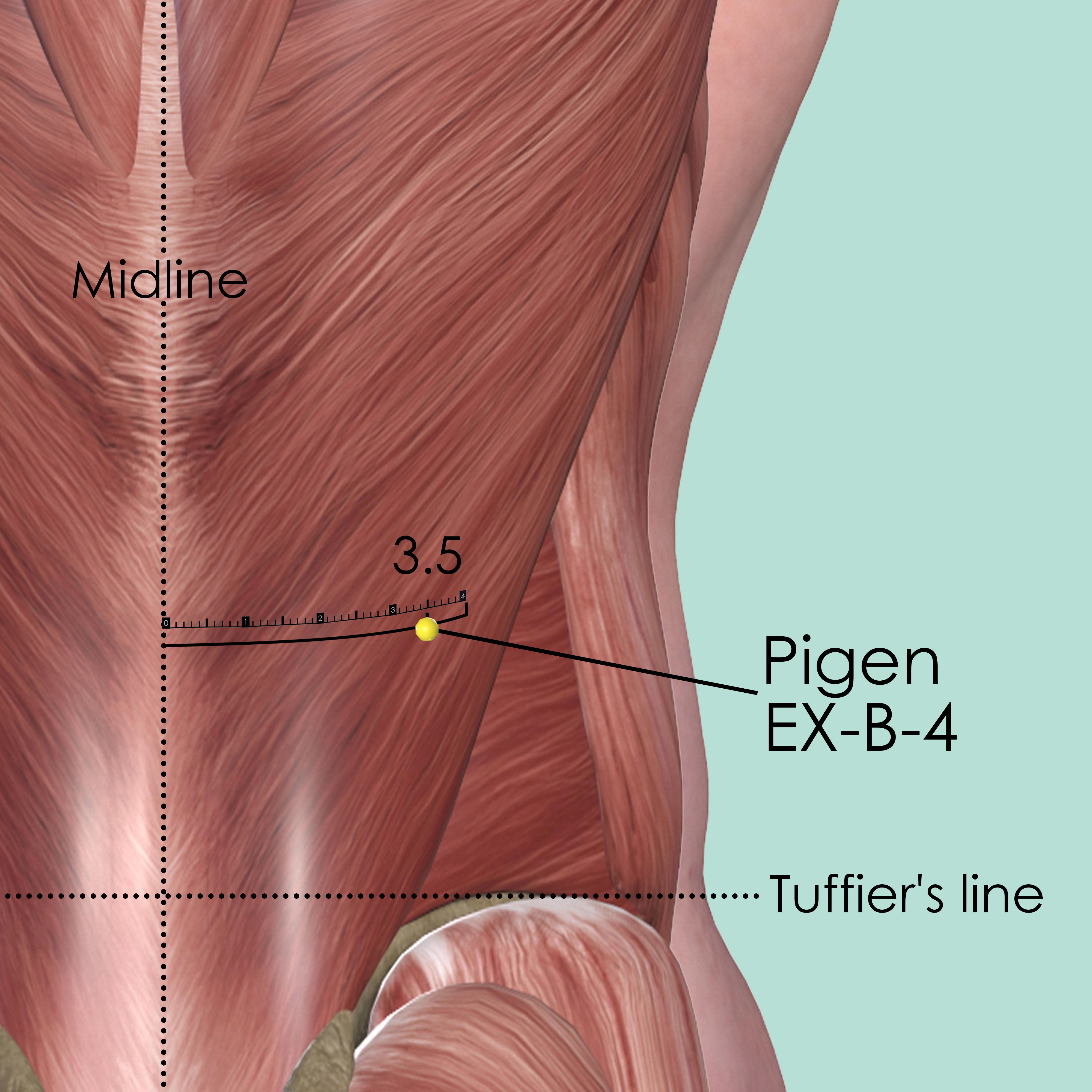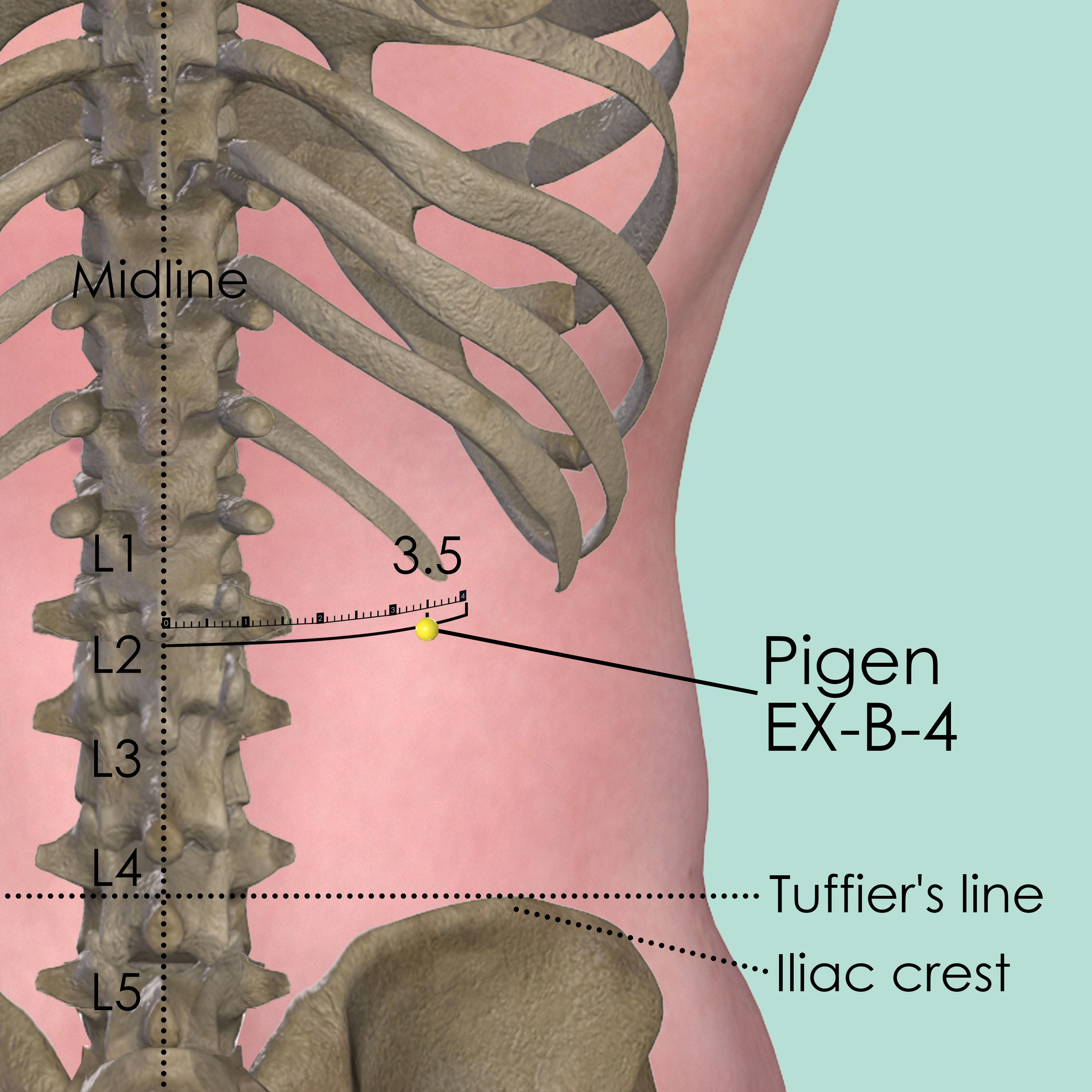 First identify the Tuffier's line which connects the highest points of the iliac crest. The spinous process of the 4th lumber vertebra (L4) mostly falls on this line. Then identify the 1st spinous process of the 1st lumber vertebra (L1) by counting up three. Pigen EX-B-4 is 3.5 cun lateral to the lower border of L1.