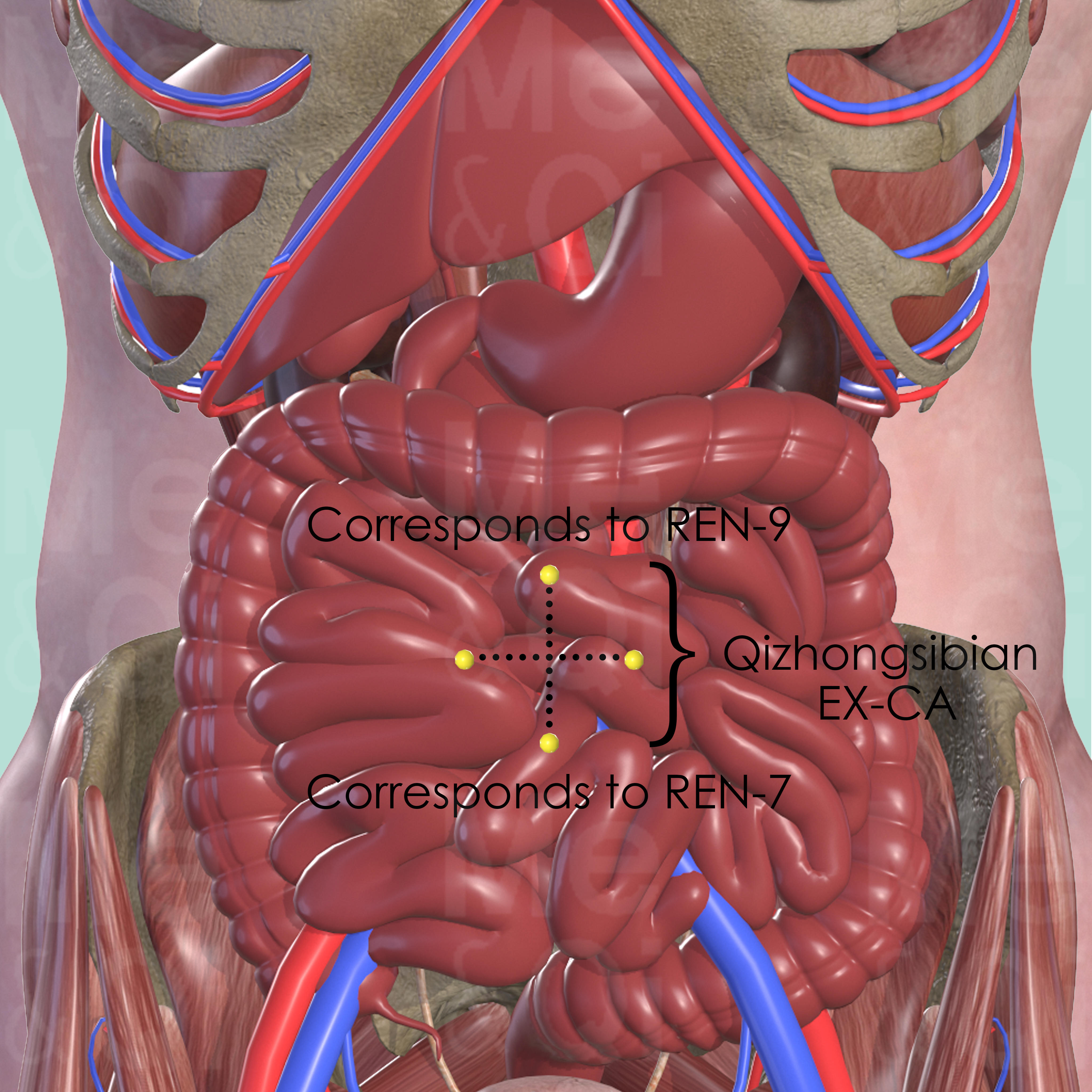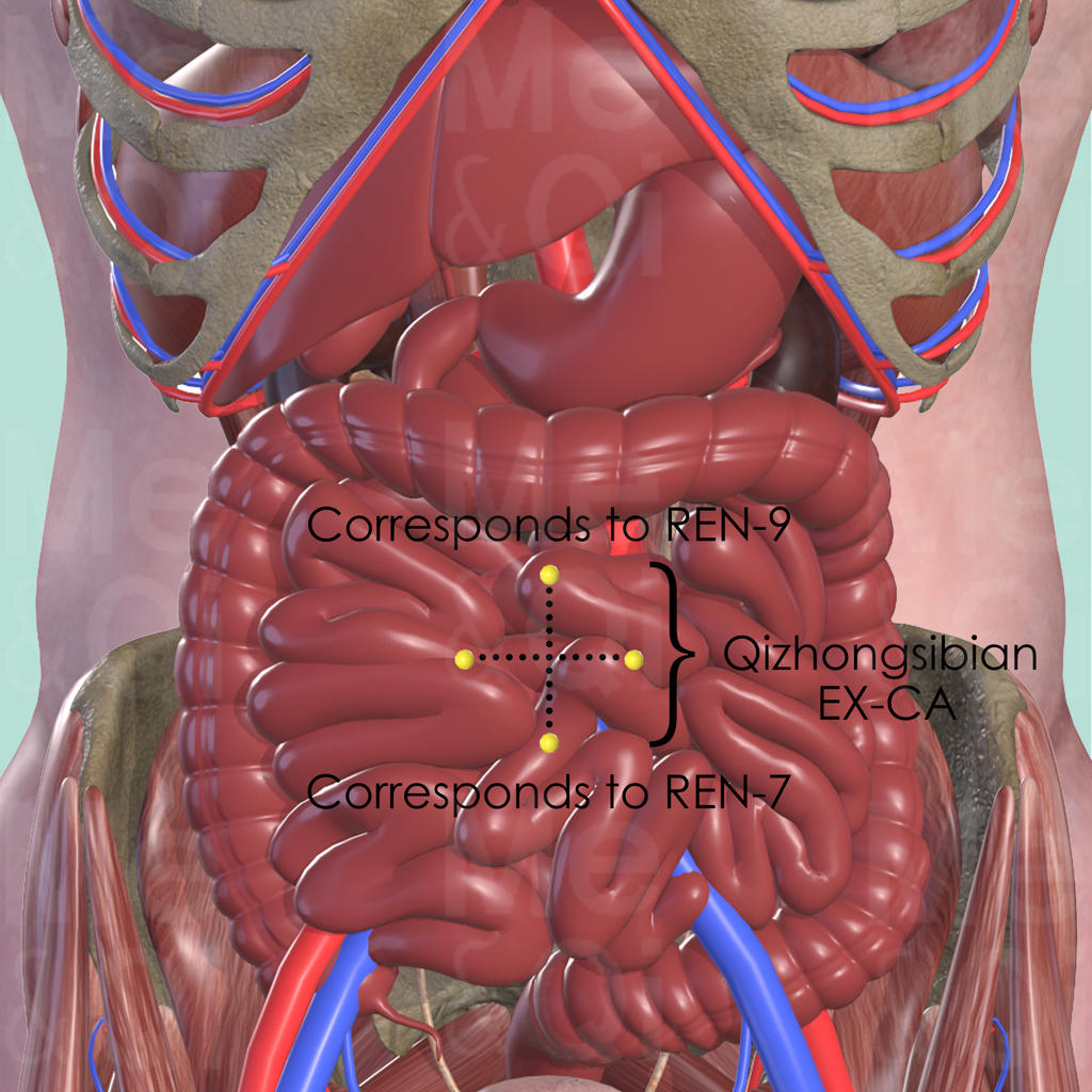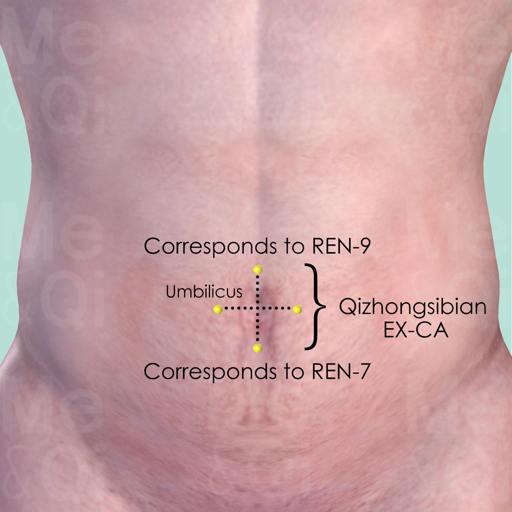This is a group of 4 points, 1 cun lateral, superior and inferior to the center of the umbilicus. The superior point corresponds to Shuifen REN-9, while the inferior one corresponds to Yinjiao REN-7.