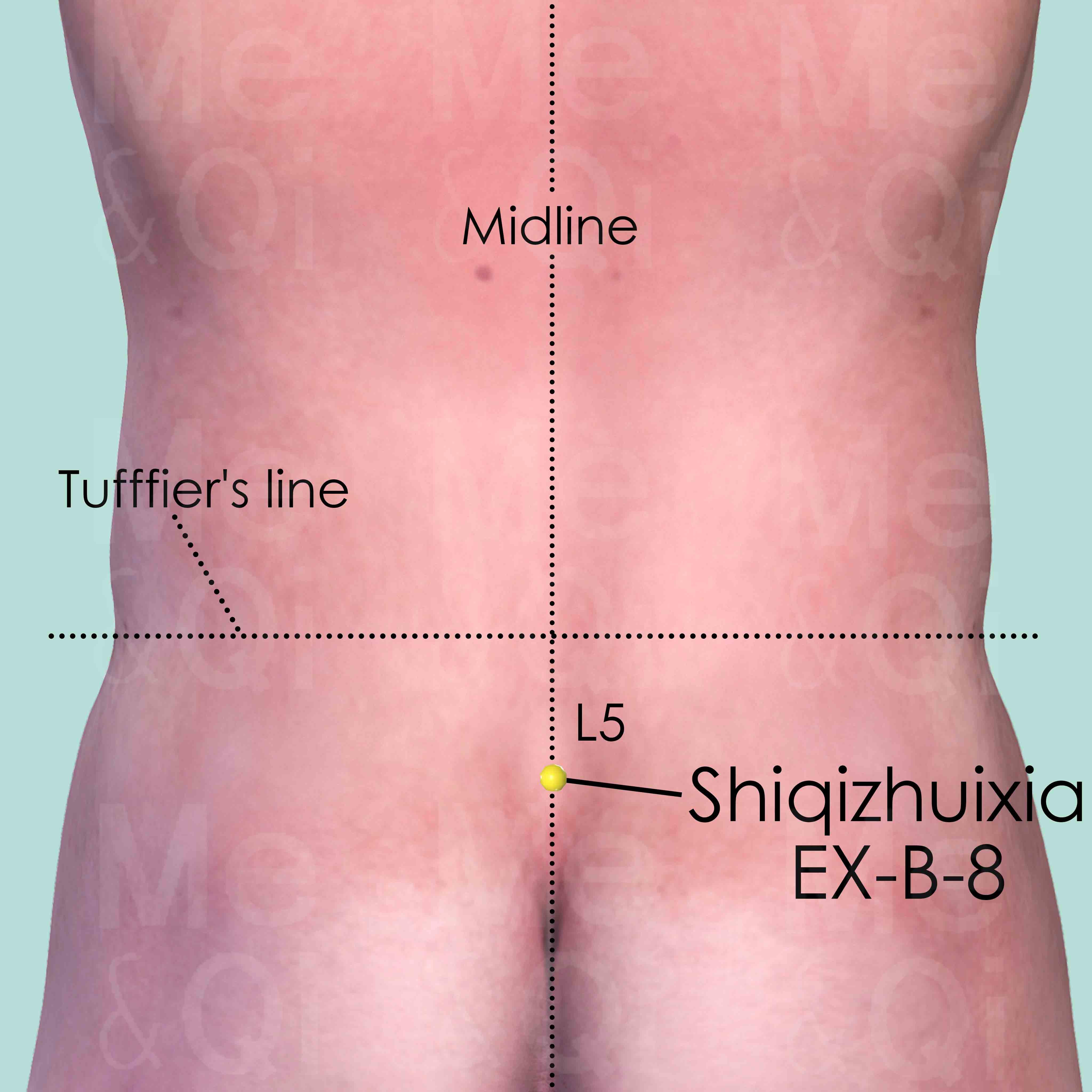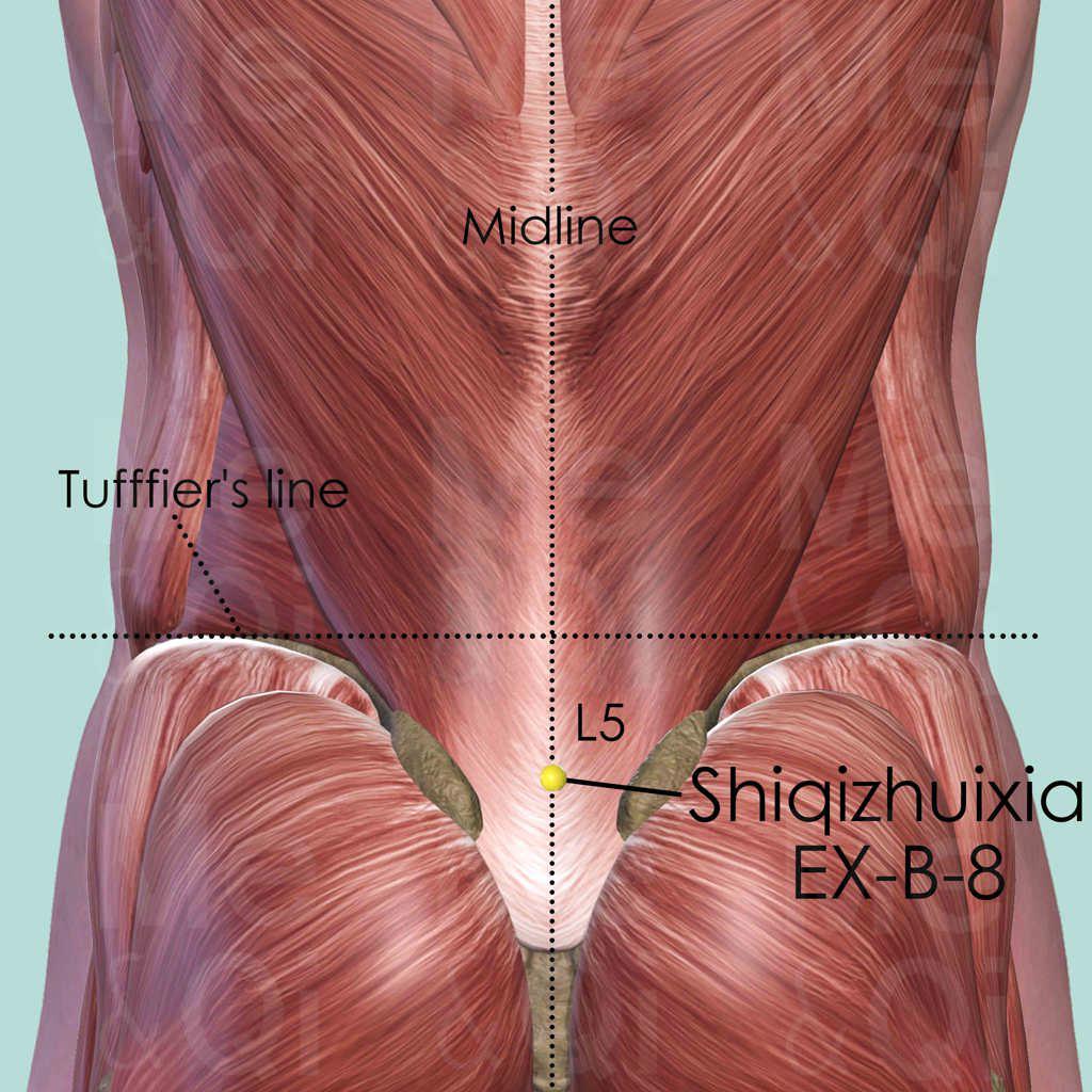 Locate the Tufffier's line, which connects the two most superior points on the iliac crest. It generally intersects with the spinous process of the 4th lumbar vertebra (L4). Then palpate in an inferior direction to the next vertebra (L5) and locate Ex-B-8 below the border of its spinous process, at the lumbosacral joint.