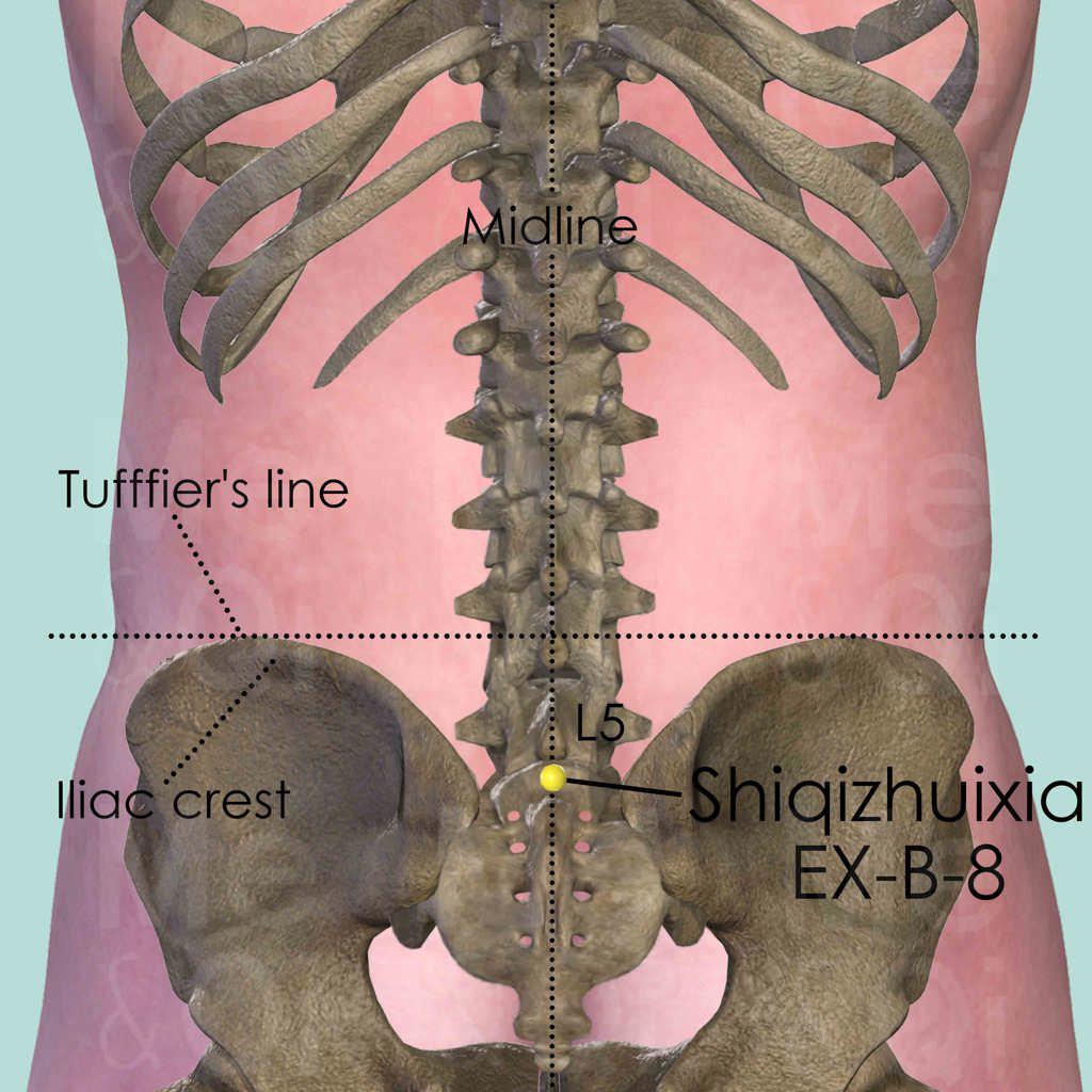 Shiqizhuixia EX-B-8 is an important extra point located on the posterior midline at the lumbosacral junction. Its Chinese name literally means "below the seventeenth vertebra" – in traditional TCM counting, starting from the first thoracic vertebra (T1) as "one," the fifth lumbar vertebra (L5) is counted as the seventeenth vertebra. The point was first recorded in Sun Simiao's Qianjin Yifang (Supplement to the Thousand Gold Prescriptions) during the Tang Dynasty.