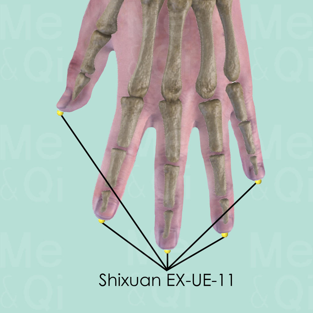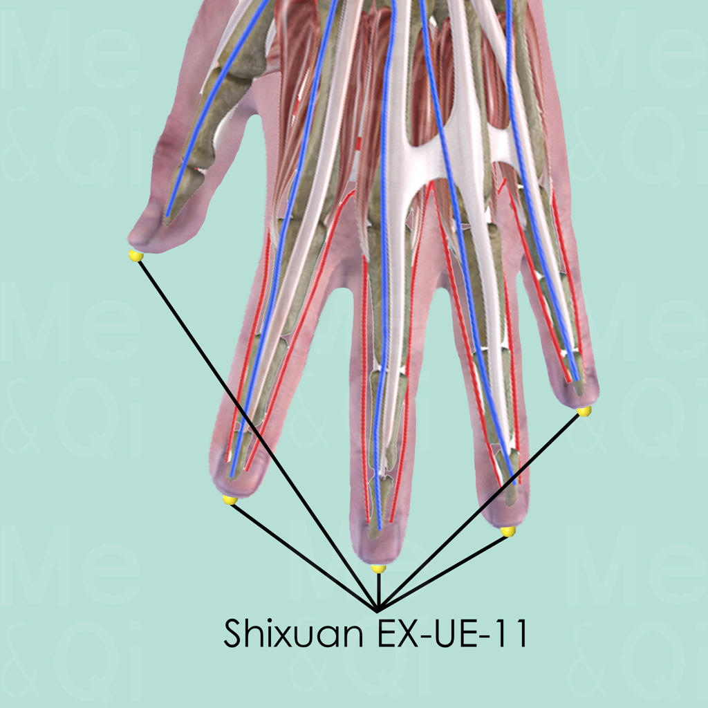 This is a group of 10 points on the tips of the 10 fingers, about 0.1 cun from the tip of the fingernail. Qiduan EX-LE-12 is a group of 10 points on the tips of the 10 toes.