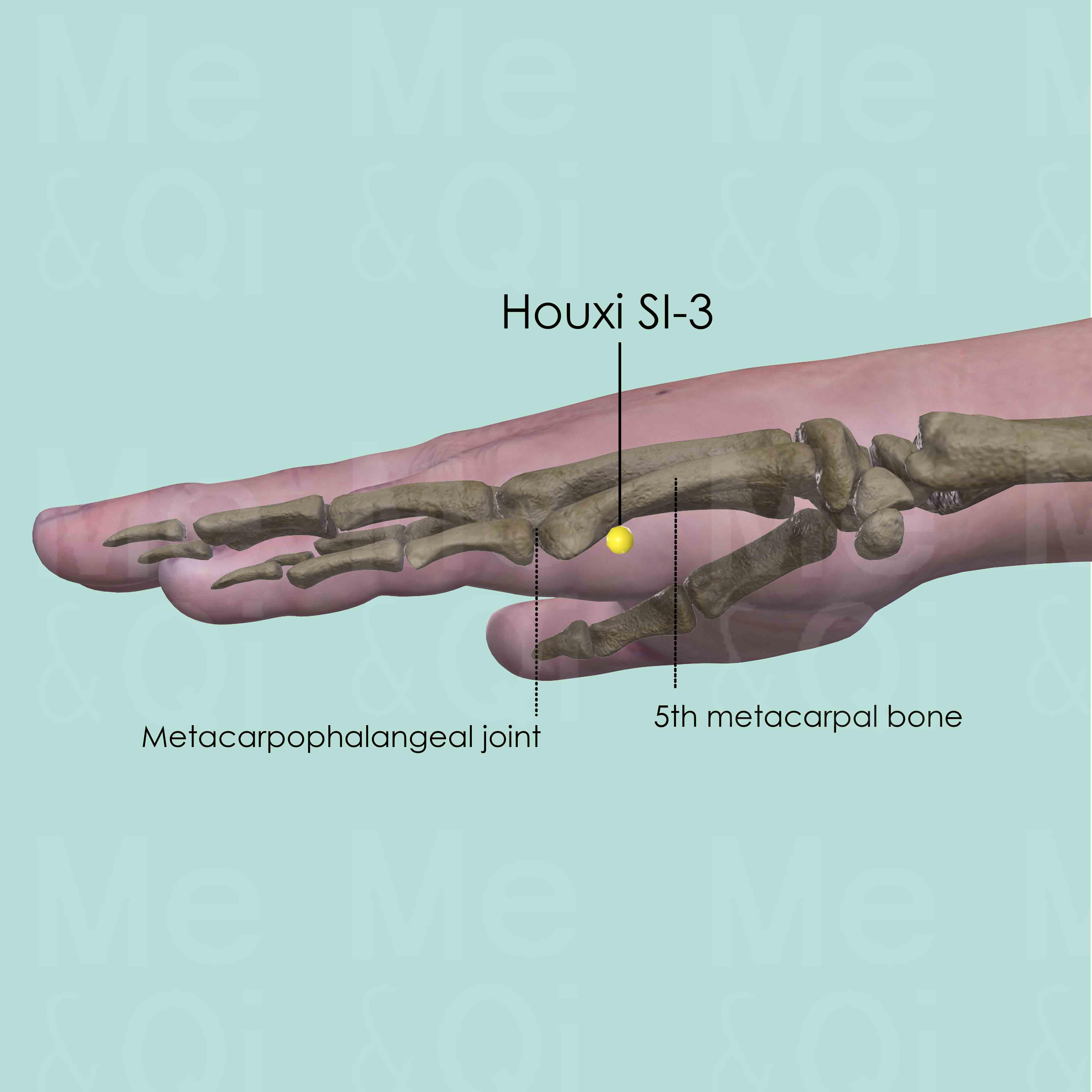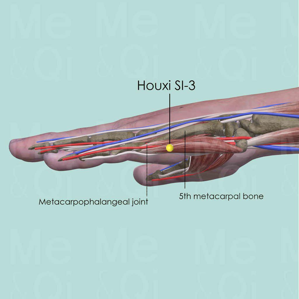When a loose fist is made, a small bulge forms at the end of the most distal transverse crease. Then locate Houxi SI-3 in a palpable depression slightly proximal and dorsal to the bulge. Another quick method: Slide from proximal (wrist) to distal (little finger) along the ulnar border of the hand, until the palpating finger comes to rest at the junction between the base and the head of the 5th metacarpal bone proximal to the metacarpophalangeal joint. Locate Houxi SI-3 there.