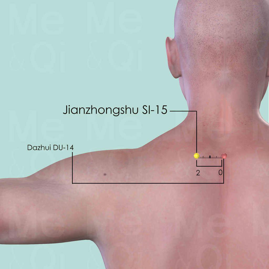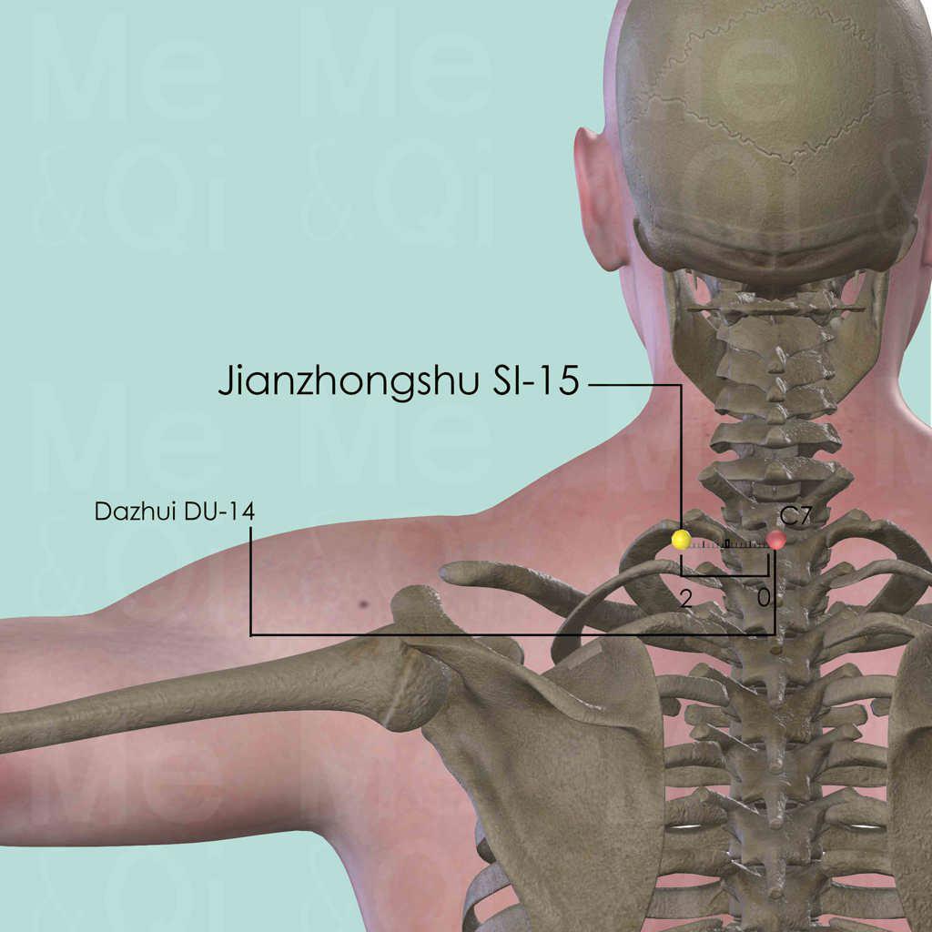 First identify Dazhui DU-14 below the 7th cervical vertebra (C7). Jianzhongshu SI-15 is located at the same level as DU-14 by measuring 2 cun in a lateral direction.