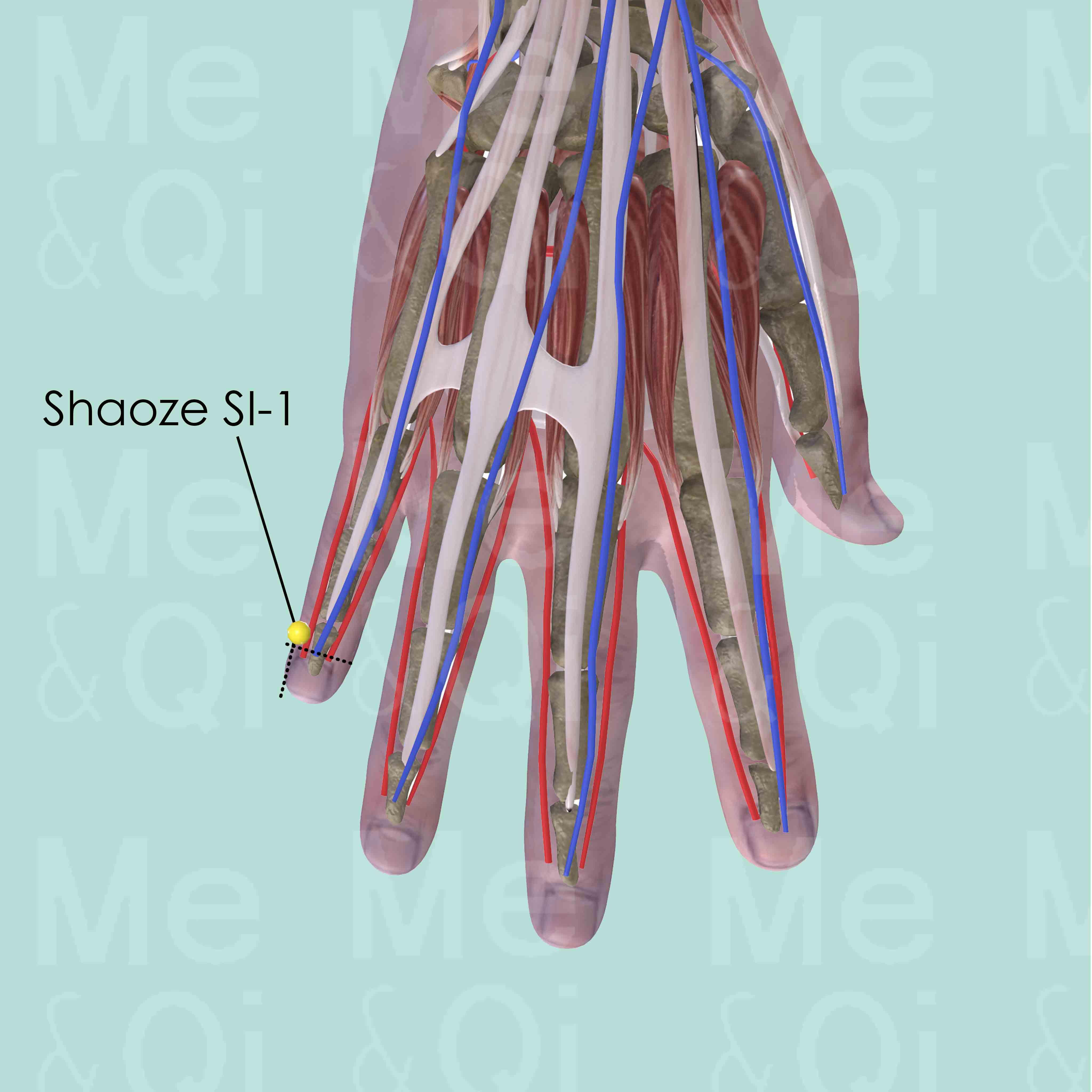 Shaoze SI-1 is located at the junction of the lines drawn along the ulnar and bottom border of the nail, about 0.1 cun from the corner of the nail. Shaochong HE-9 is located on the other corner of the nail.