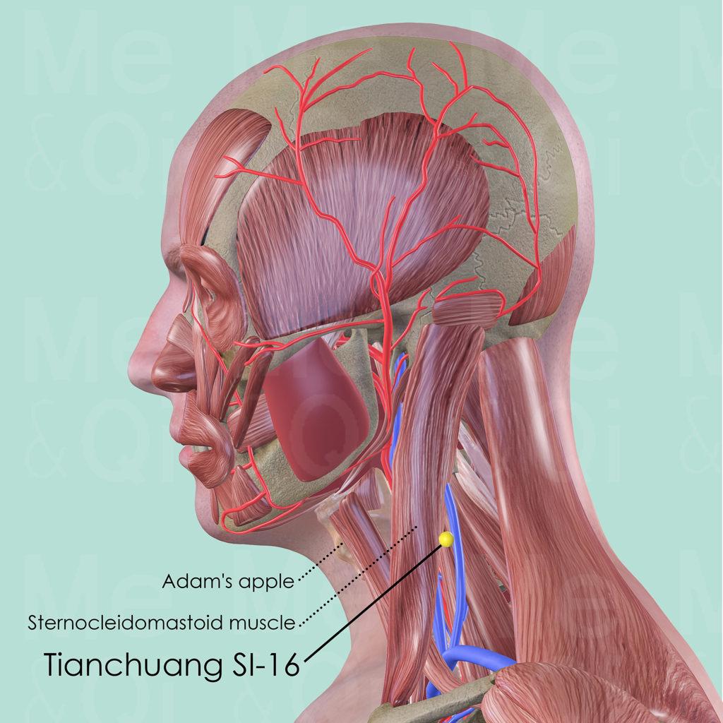 From the Adam's apple, draw a line to the posterior border of the sternocleidomastoid muscle. Tianchuang SI-16 is located directly at its posterior border.