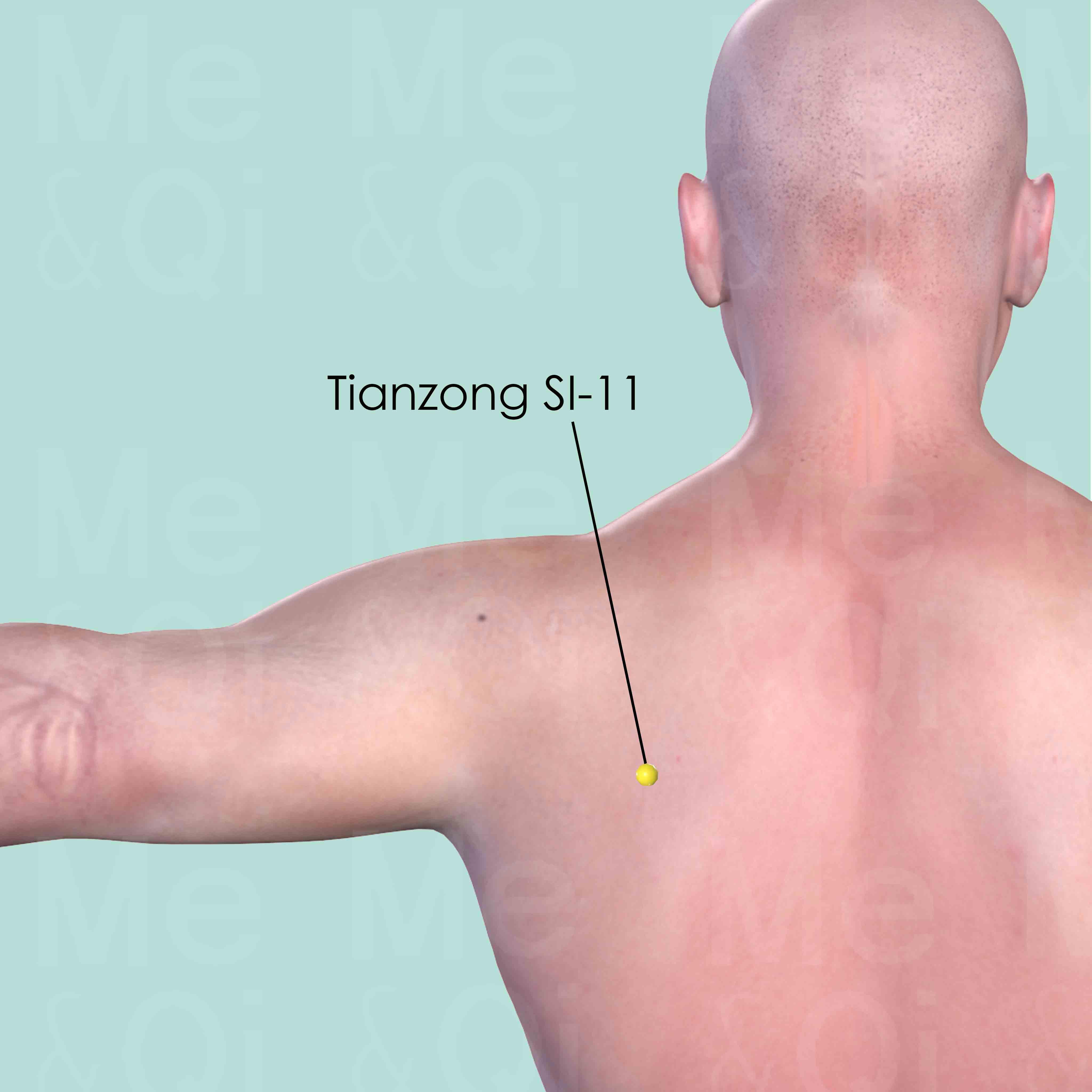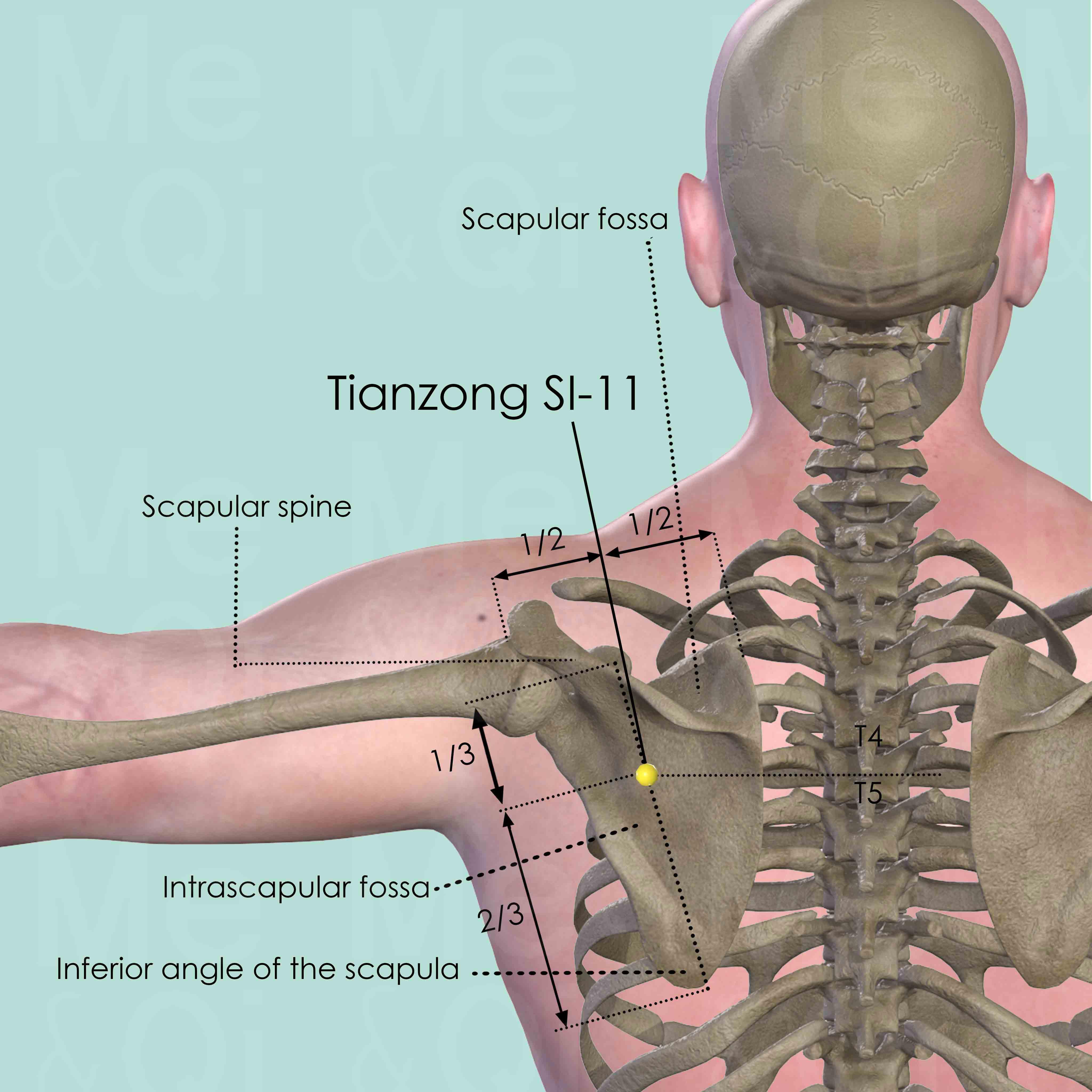The patient is better to be seated in a relaxed way with arms hanging down. Draw an imaginary line from the midpoint of the scapular spine to the inferior angle of the scapula. Tianzong SI-11 is located at the junction of the upper and middle third of this line, in a depression on the infraspinatus muscle, which is often sensitive to pressure. Also, Tianzong SI-11 is generally at the same level as the gap between the 4th and the 5th spinous process (T4 and T5).