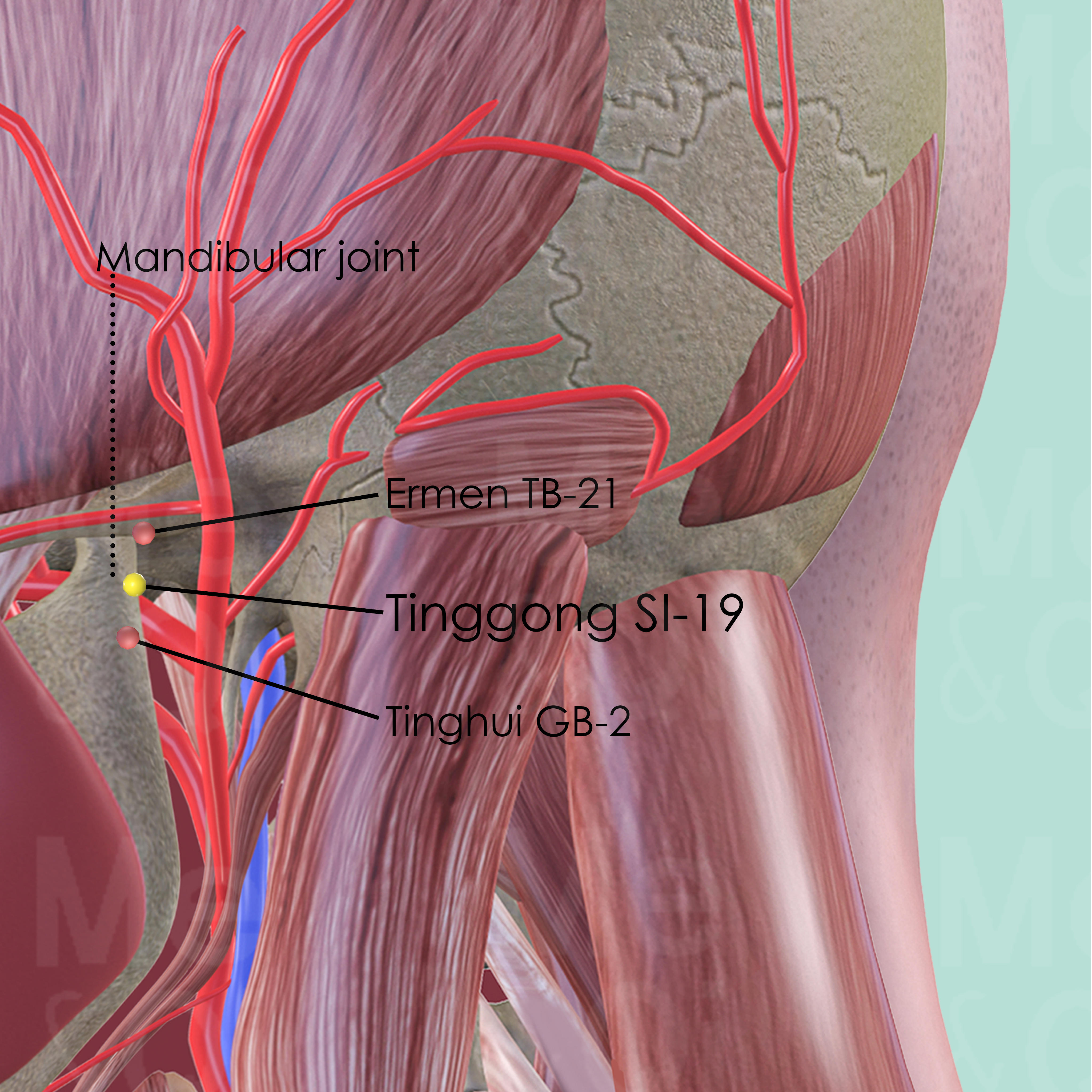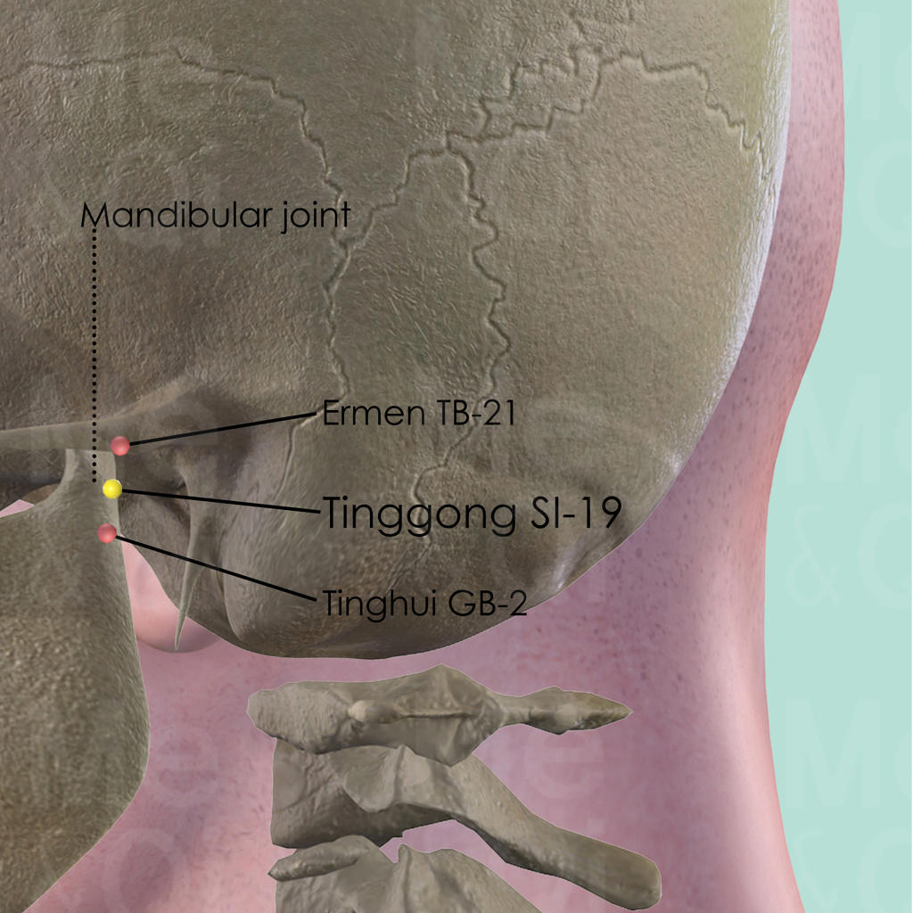 Locate and needle this point with the mouth open. This allows the condyloid process of the mandible to slide anteriorly and reveals the depression. Locate the vertical sulcus at the junction between the ear and the cheek. Then locate Tinggong SI-19 on the level of the tragus on the sulcus. It is located between Ermen TB-21 and Tinghui GB-2.