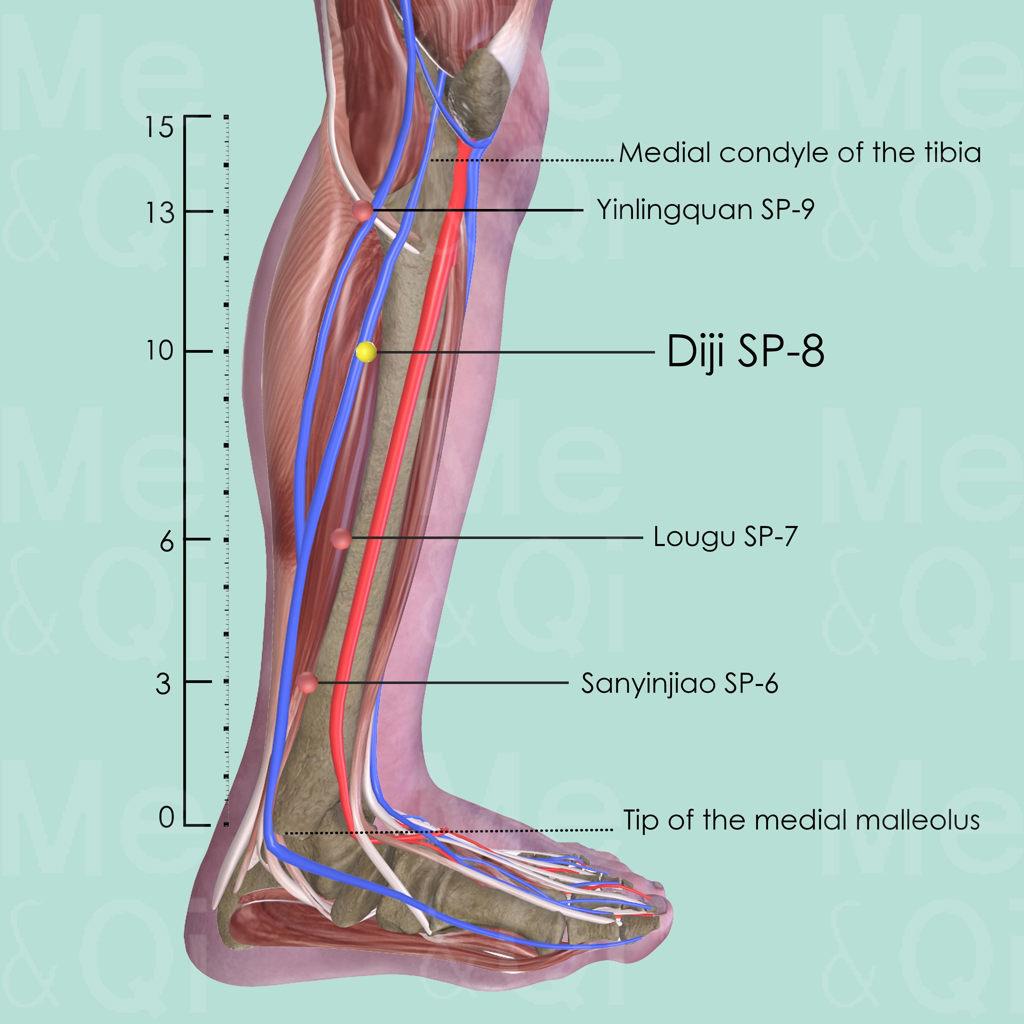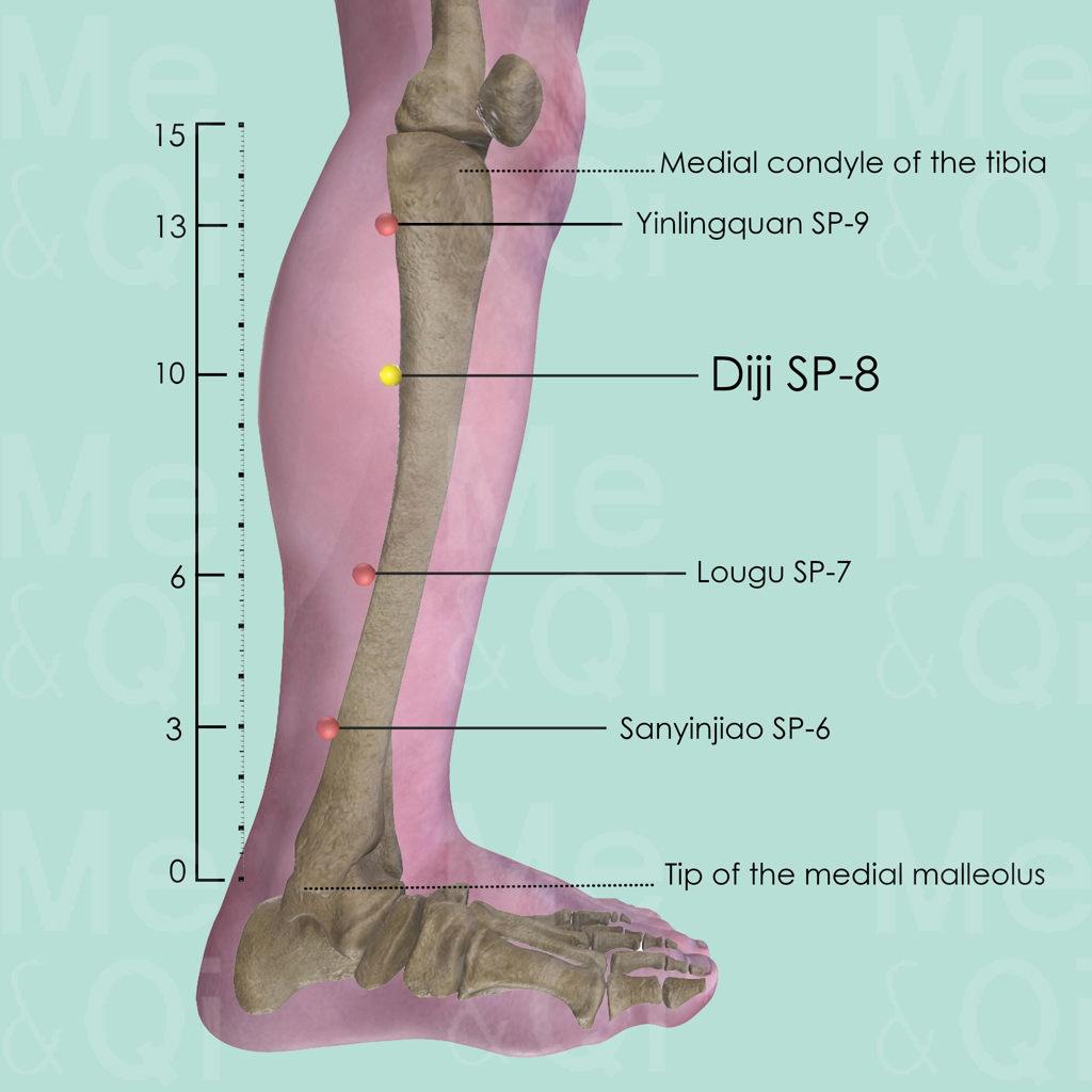First locate Yinlingquan SP-9 on the lower border of the medial condyle of the tibia. Draw an imaginary line between SP-9 and the tip of the medial malleolus. Locate Diji SP-8 on this line, 3 cun below SP-9.