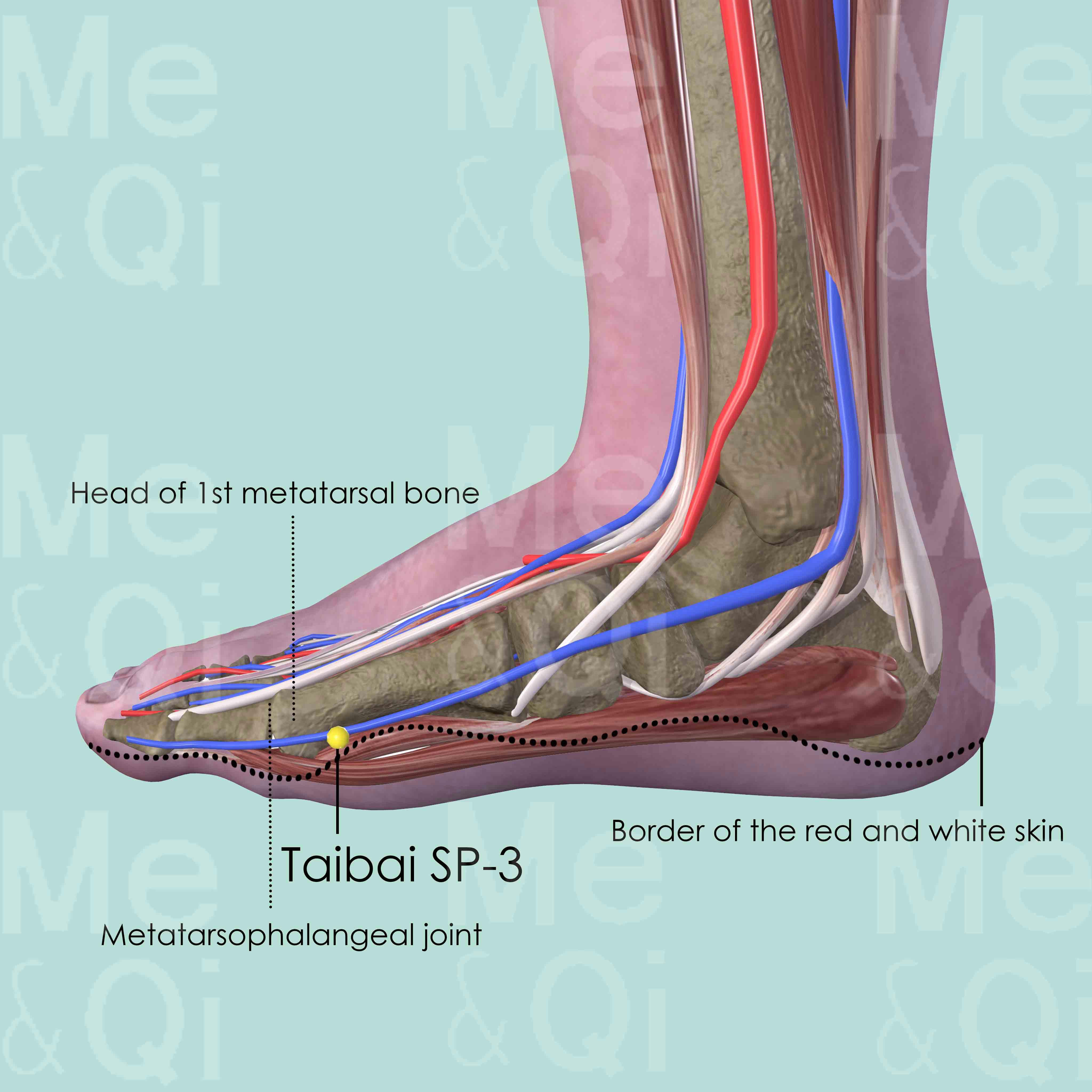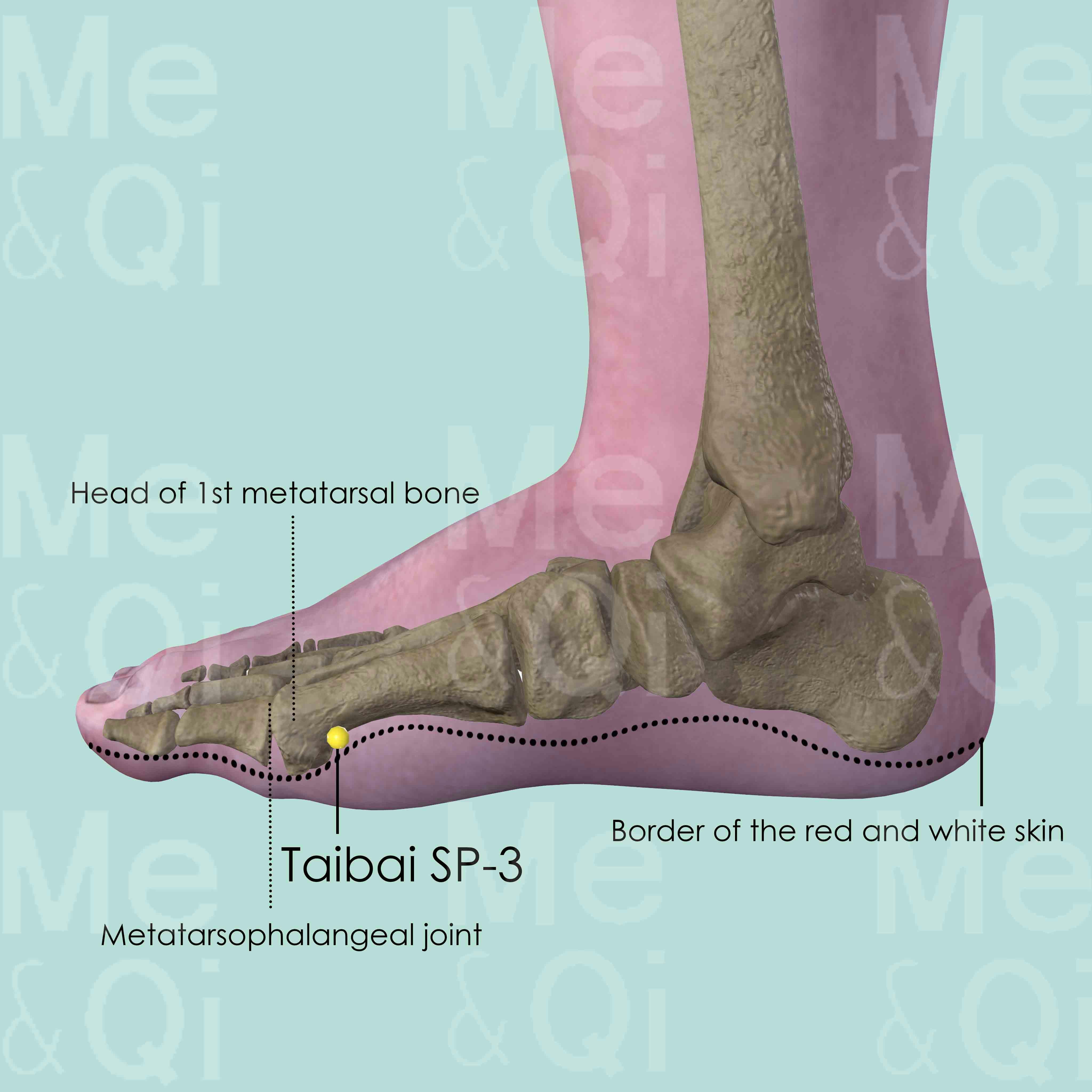 The metatarsophalangeal joint forms a prominent landmark, when palpate along the border of the red and white skin on the medial aspect of the foot from toes to ankle. Taibai SP-3 is located in a depression just proximal to this joint. The depression is at the junction of the head and the shaft of the 1st metatarsal bone.