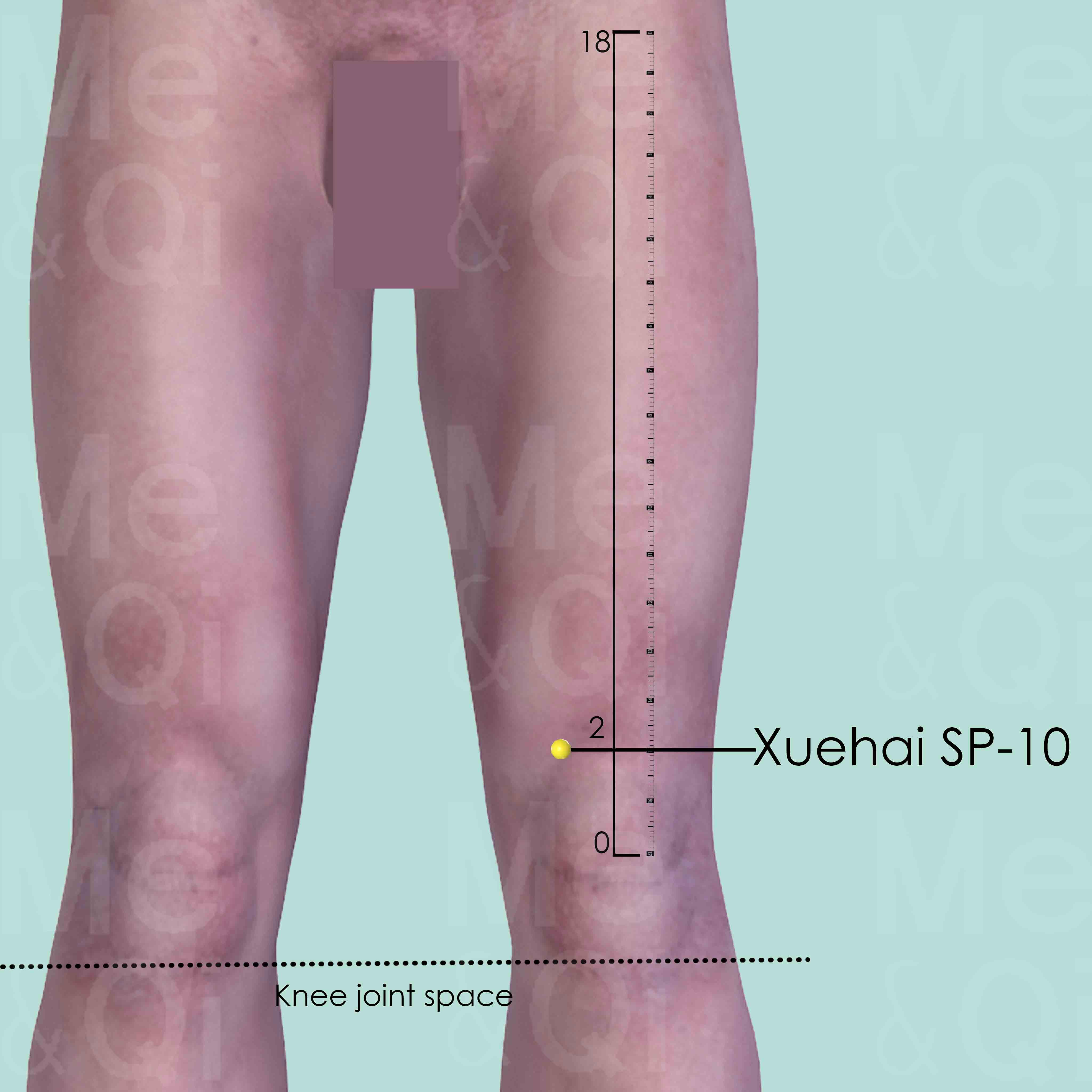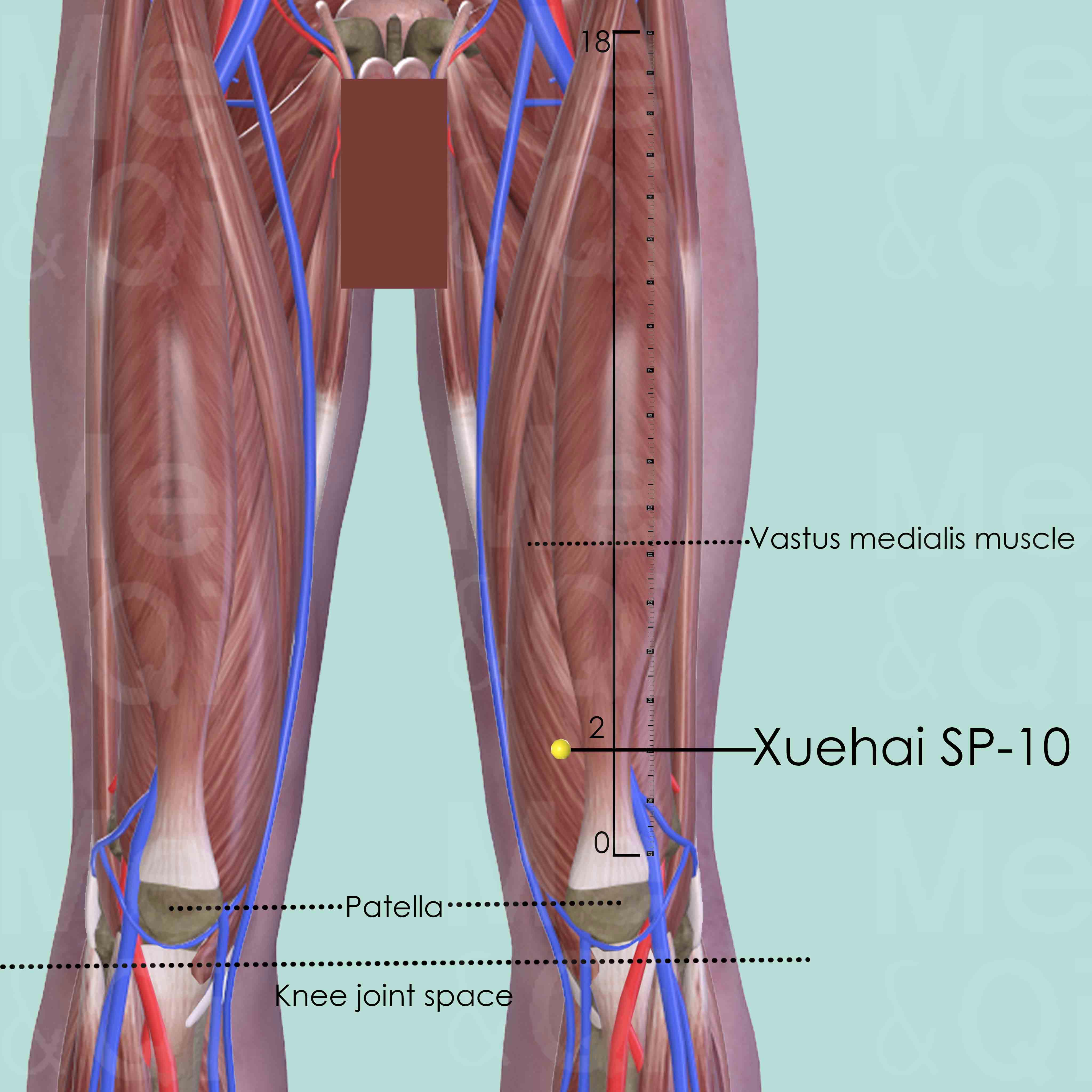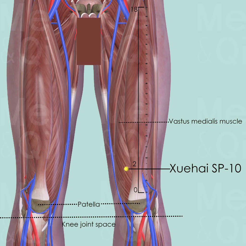 When knee is flexed, Xuehai SP-10 is 2 cun above the medial upper border of the patella, in a depression on the vastus medialis muscle.