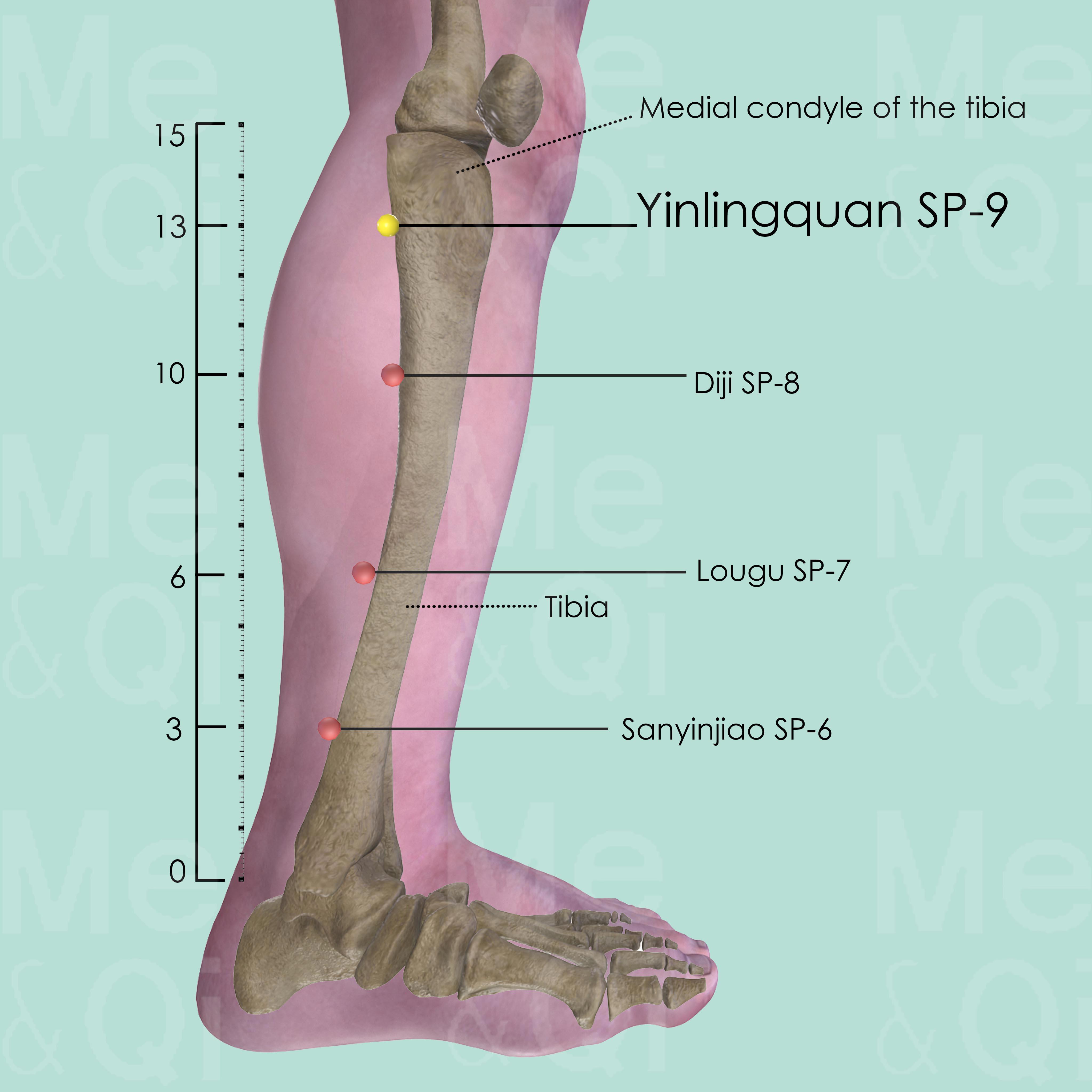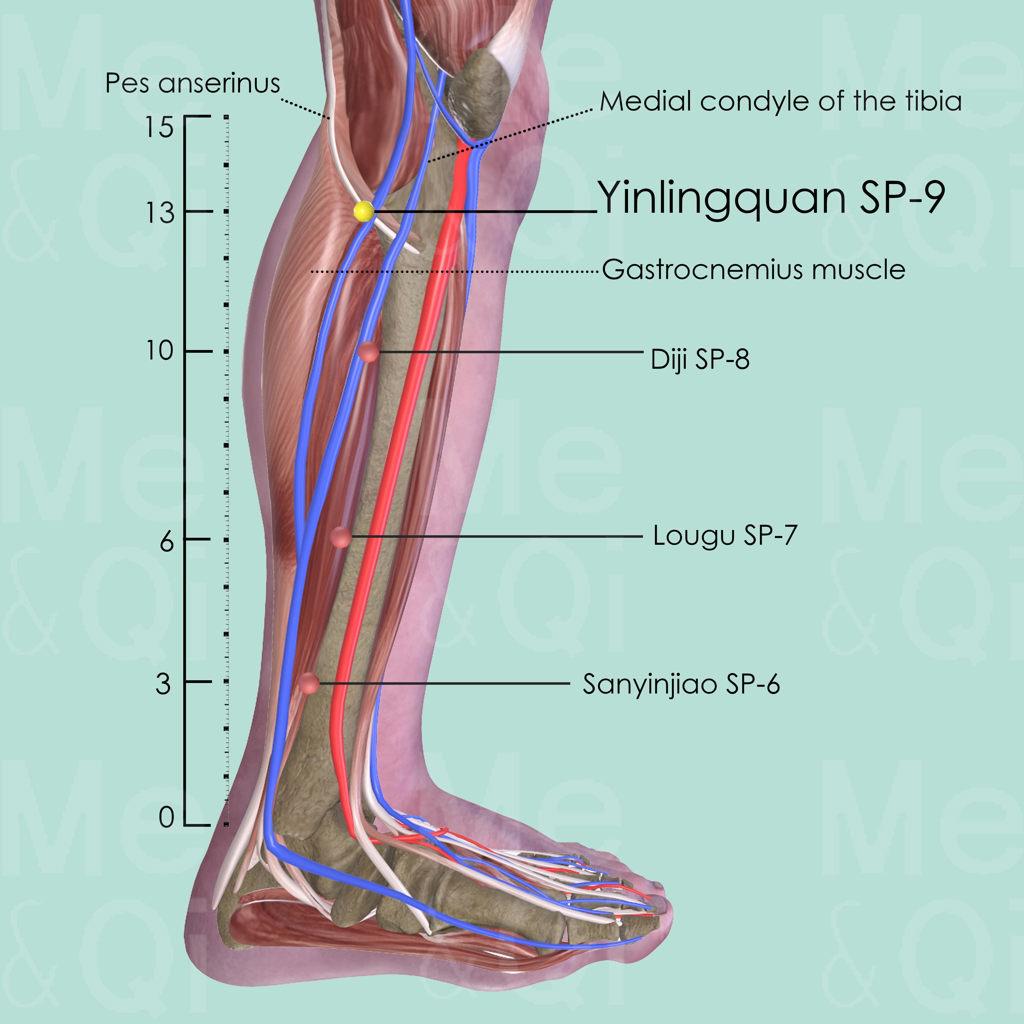 Locate Yinlingquan SP-9 by palpating along the posterior border of the medial crest of the tibia towards the head of the tibia. SP-9 is in a depression at the junction of the shaft and the head of the tibia, between the pes anserinus superficialis and the belly of the gastrocnemius muscle. This point is normally sensitive when pressed.