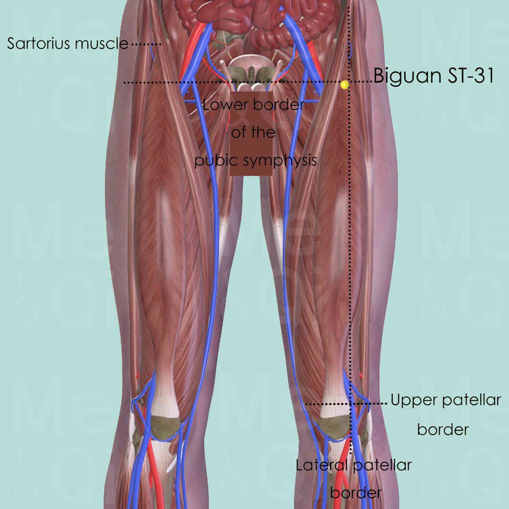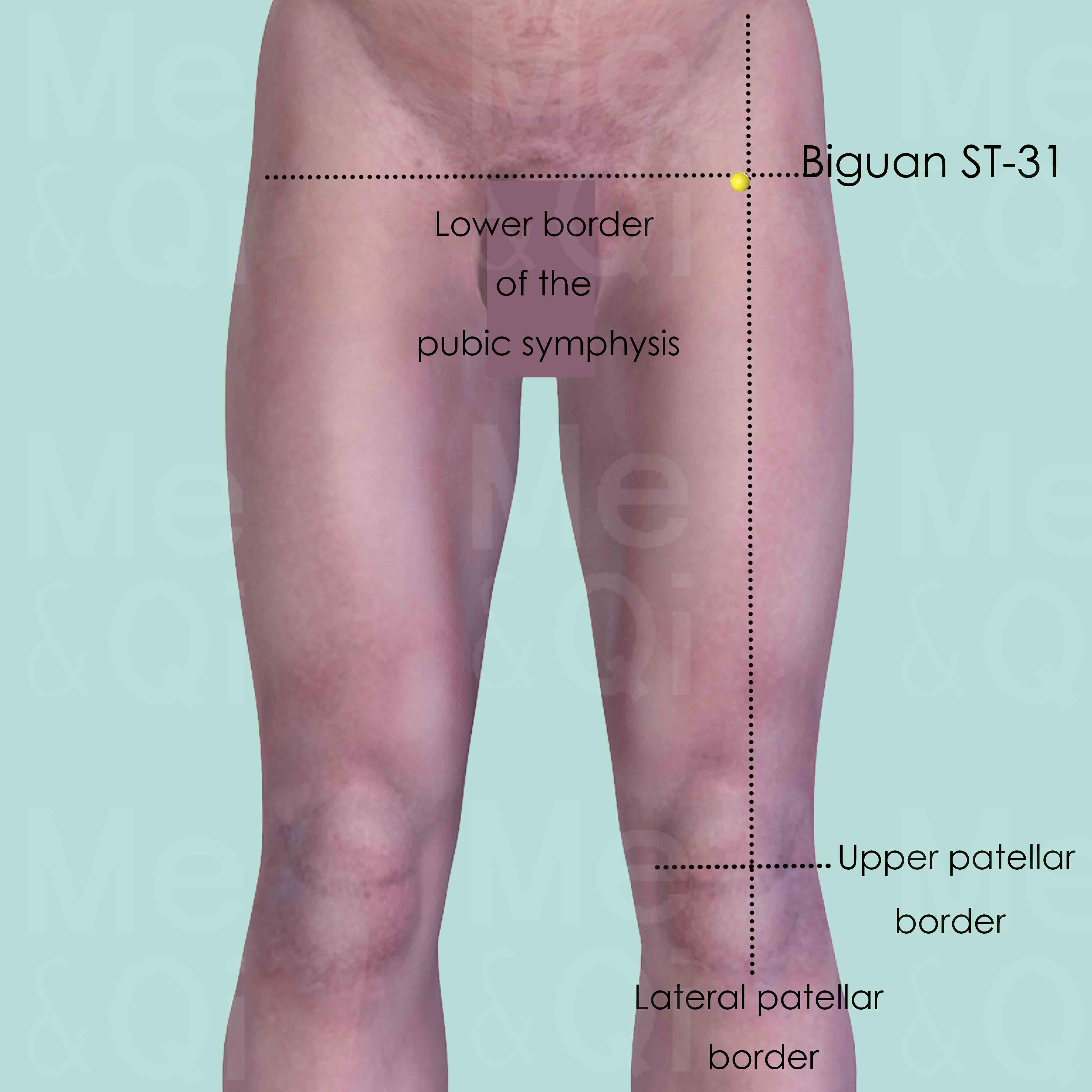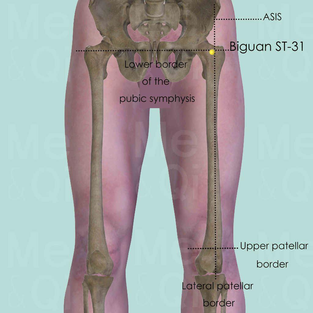 Biguan ST-31 is a very important point indicated for Painful Obstruction Syndrome, Atrophy Syndrome or sequelae of Wind-stroke of the leg, hip, thigh and knee.
