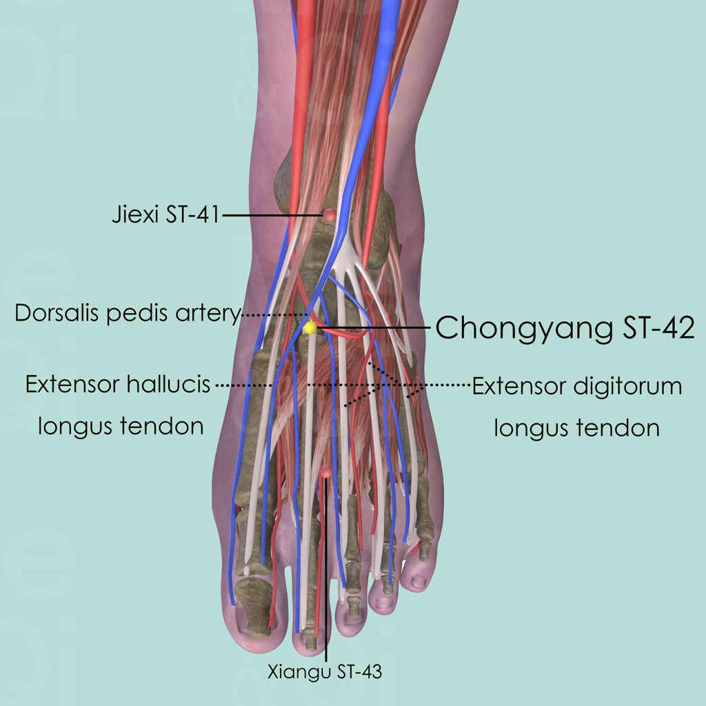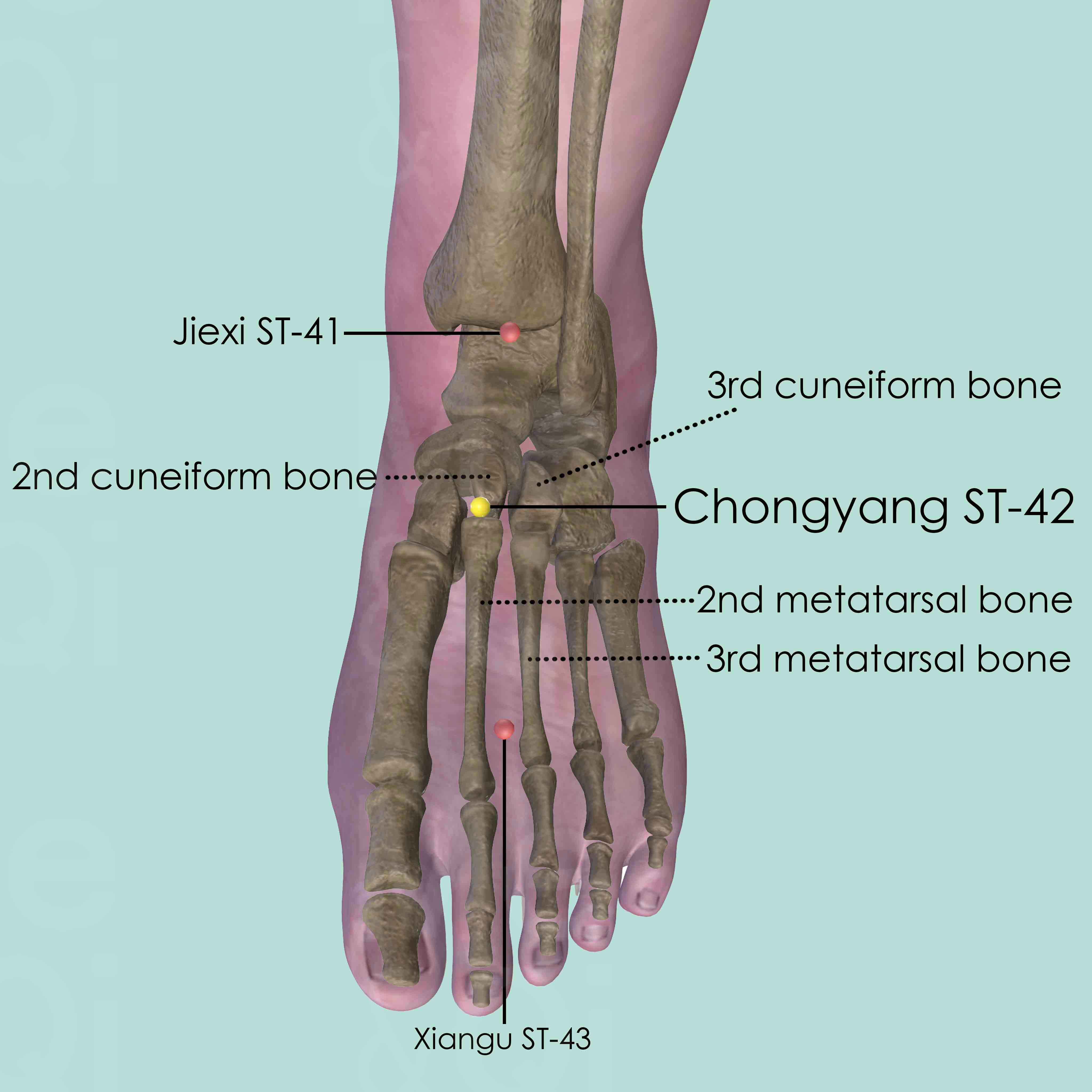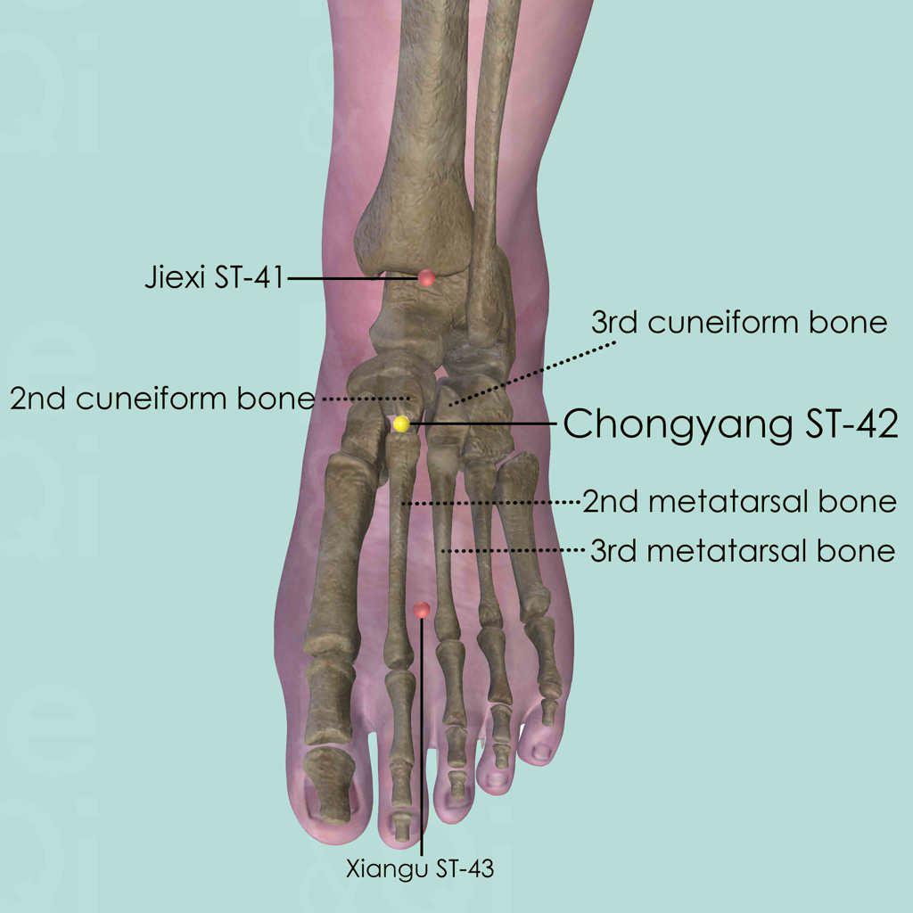 First identify Xiangu ST-43 in the depression between the base of the 2nd and 3rd metatarsal bones. Then identify Jiexi ST-41 between the tendons of extensor digitorum and the extensor hallucis longus muscle. Approximately at the level of the tip of the external malleolus. Palpate from ST-43 towards ST-41 and locate Chongyang ST-42 at the highest point of the foot dorsum, lateral to the tendon of the extensor hallucis longus.