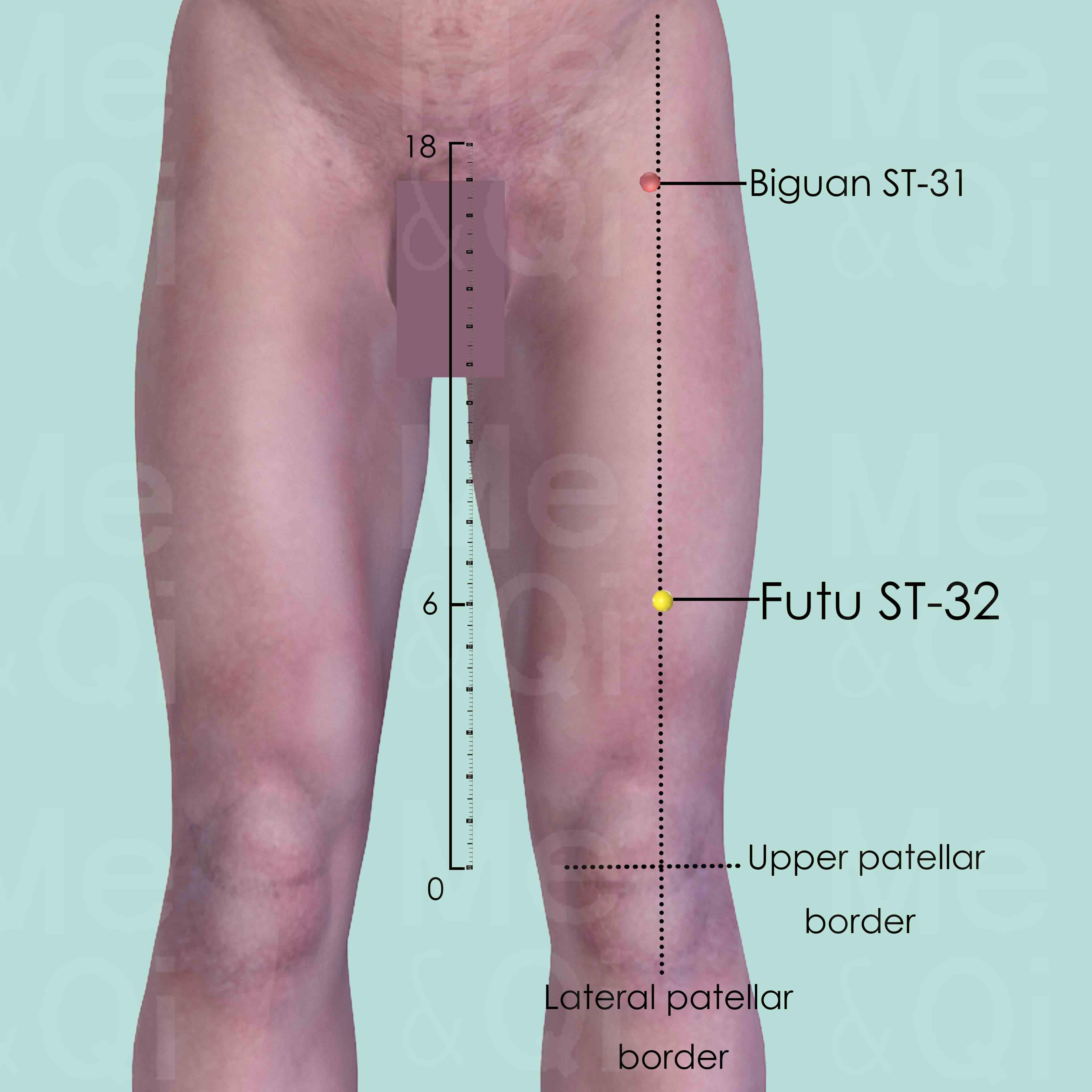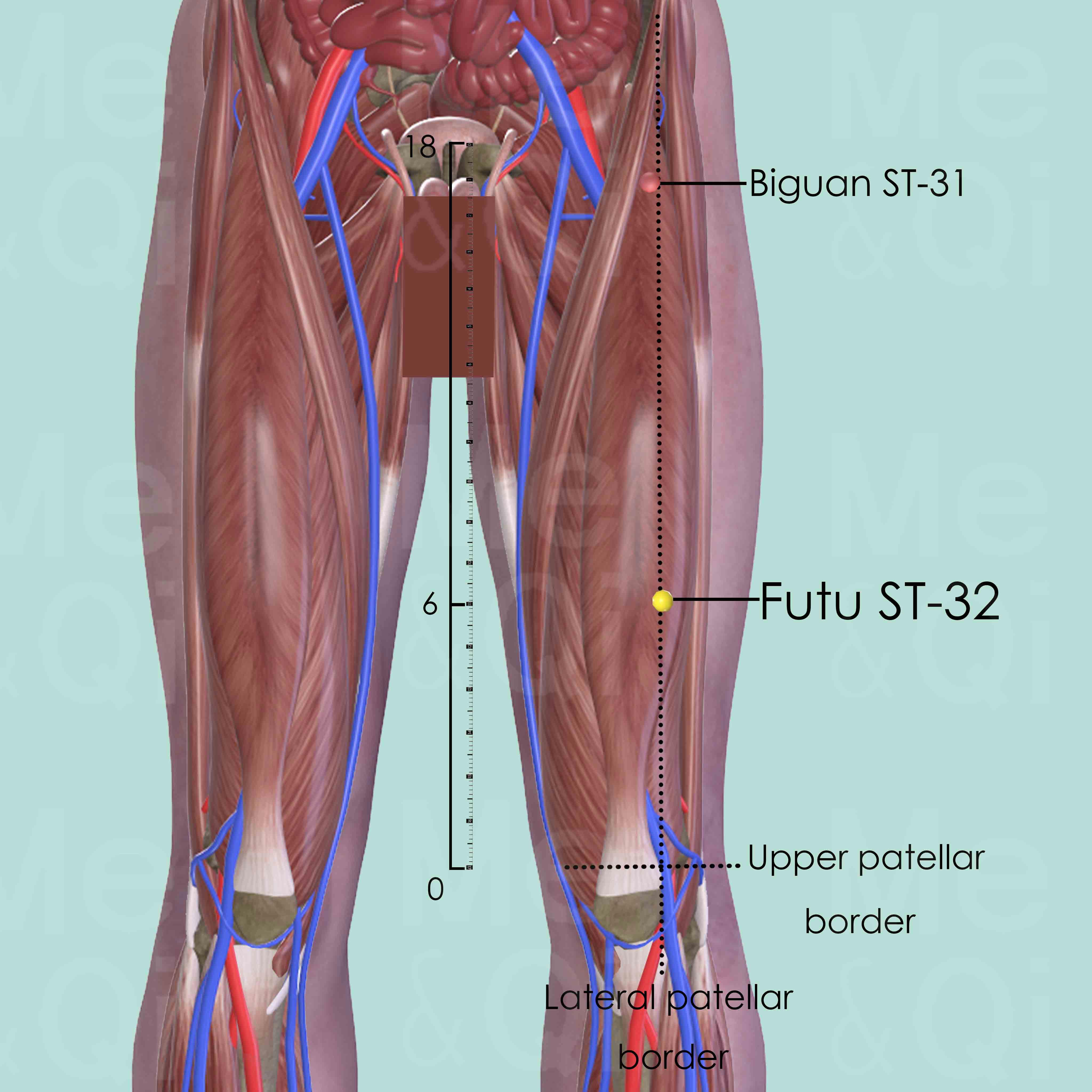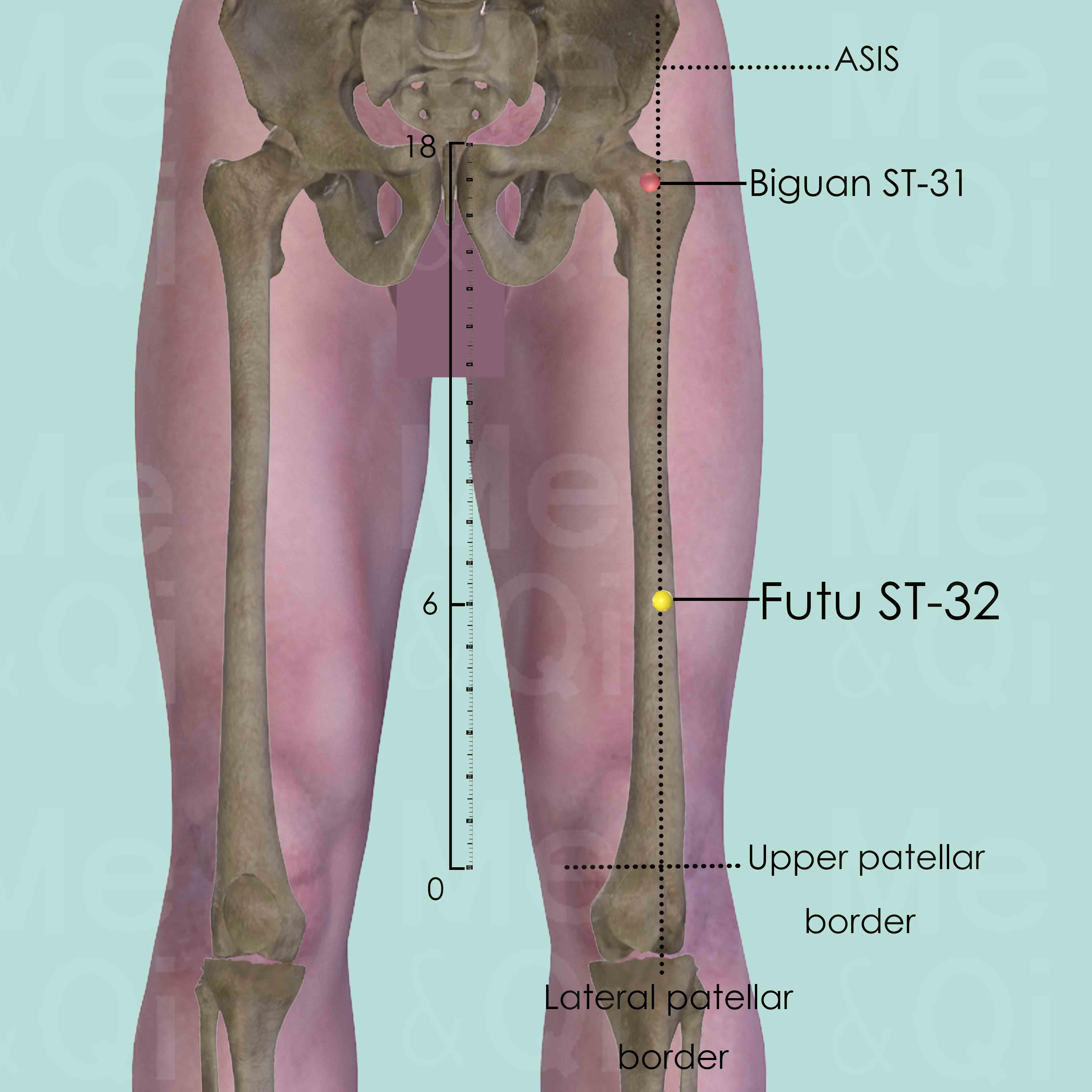 Like its neighboring point Biguan ST-31, Futu ST-32 is also indicated for Painful Obstruction Syndrome, Atrophy Syndrome or sequelae of Wind-stroke, particularly of the legs. However, its effectiveness is less stronger.