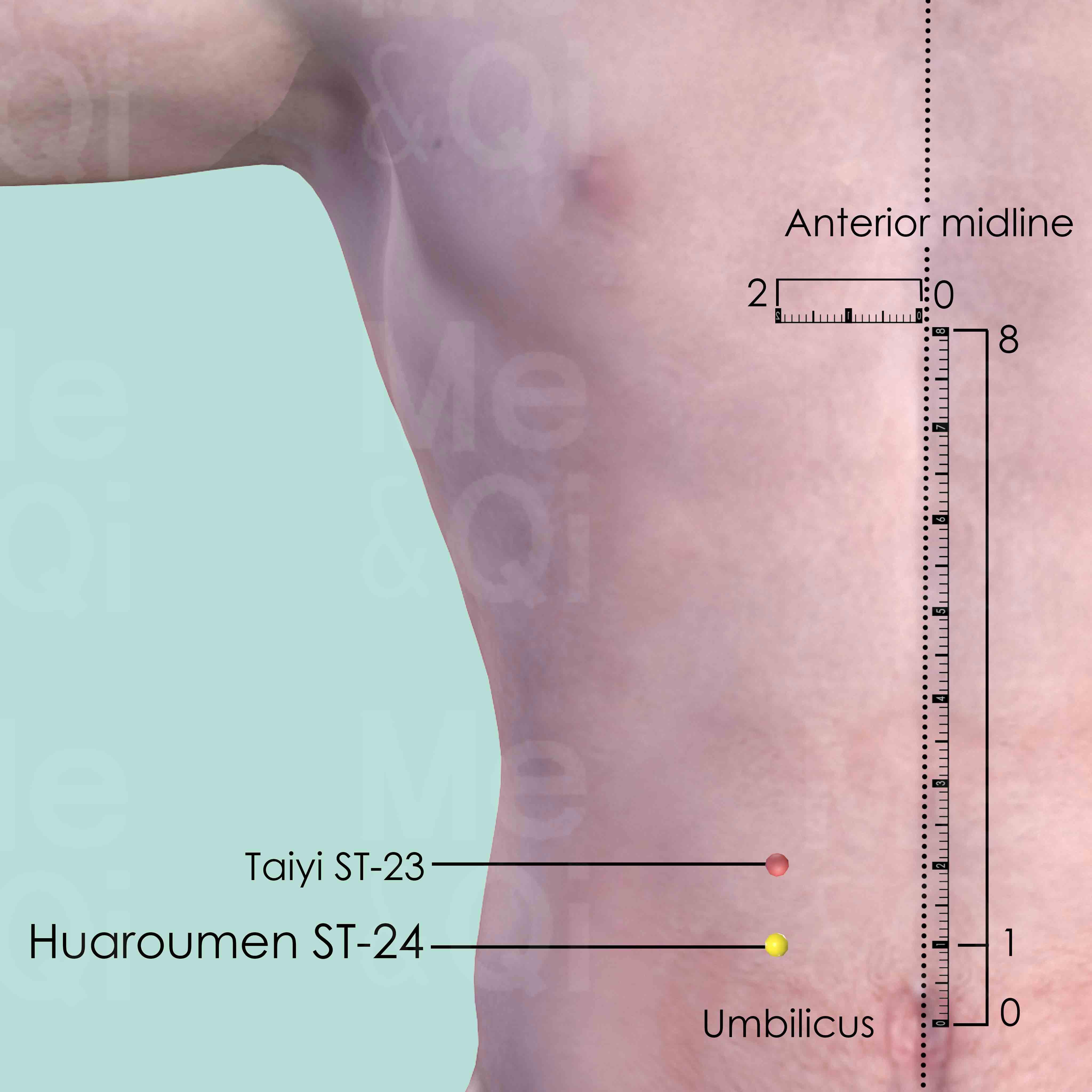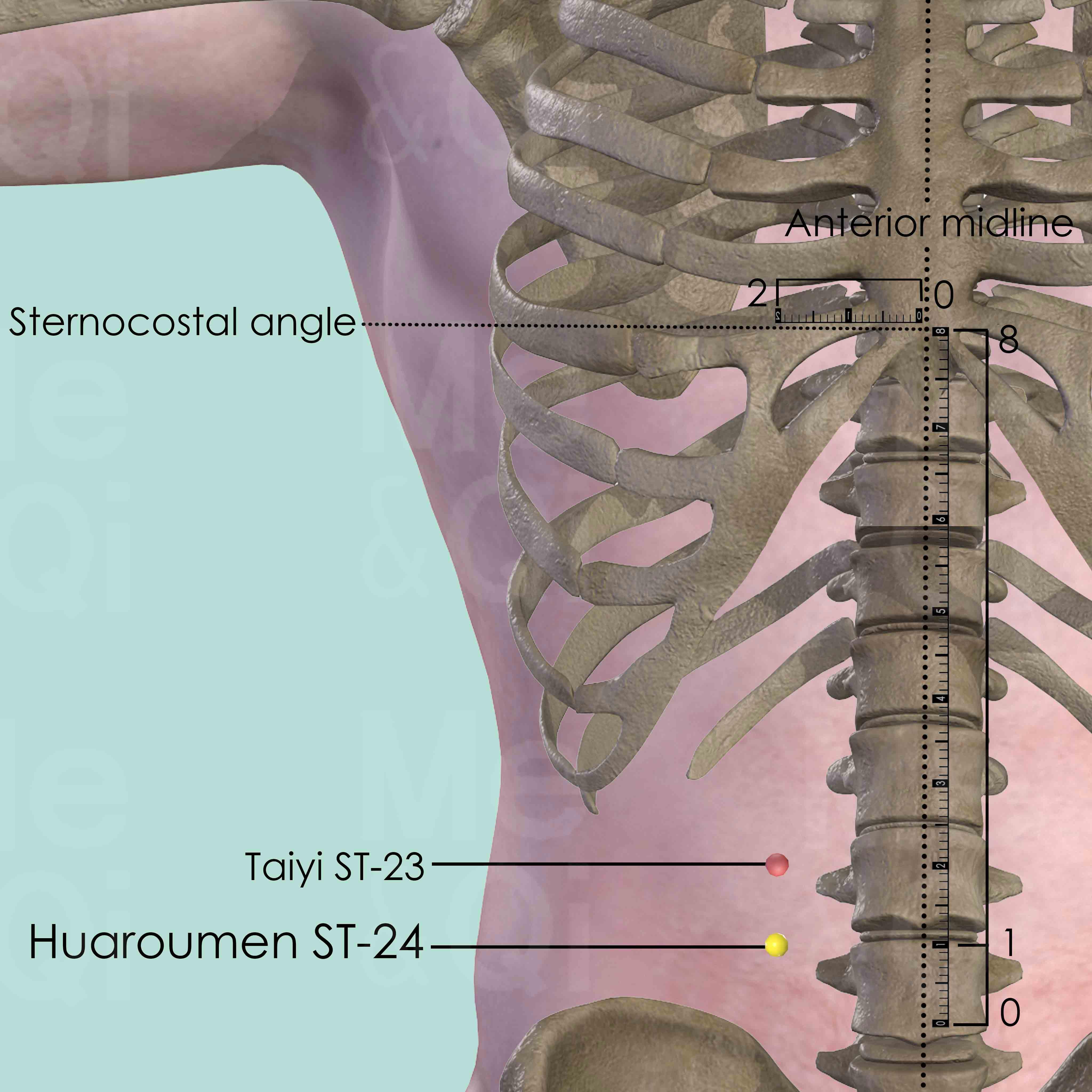 There are 8 cun between the sternocostal angle and the center of the umbilicus. Huaroumen ST-24 is 7 cun below the sternocostal angle and 1 cun above the umbilicus. It is also 2 cun lateral to the anterior midline.