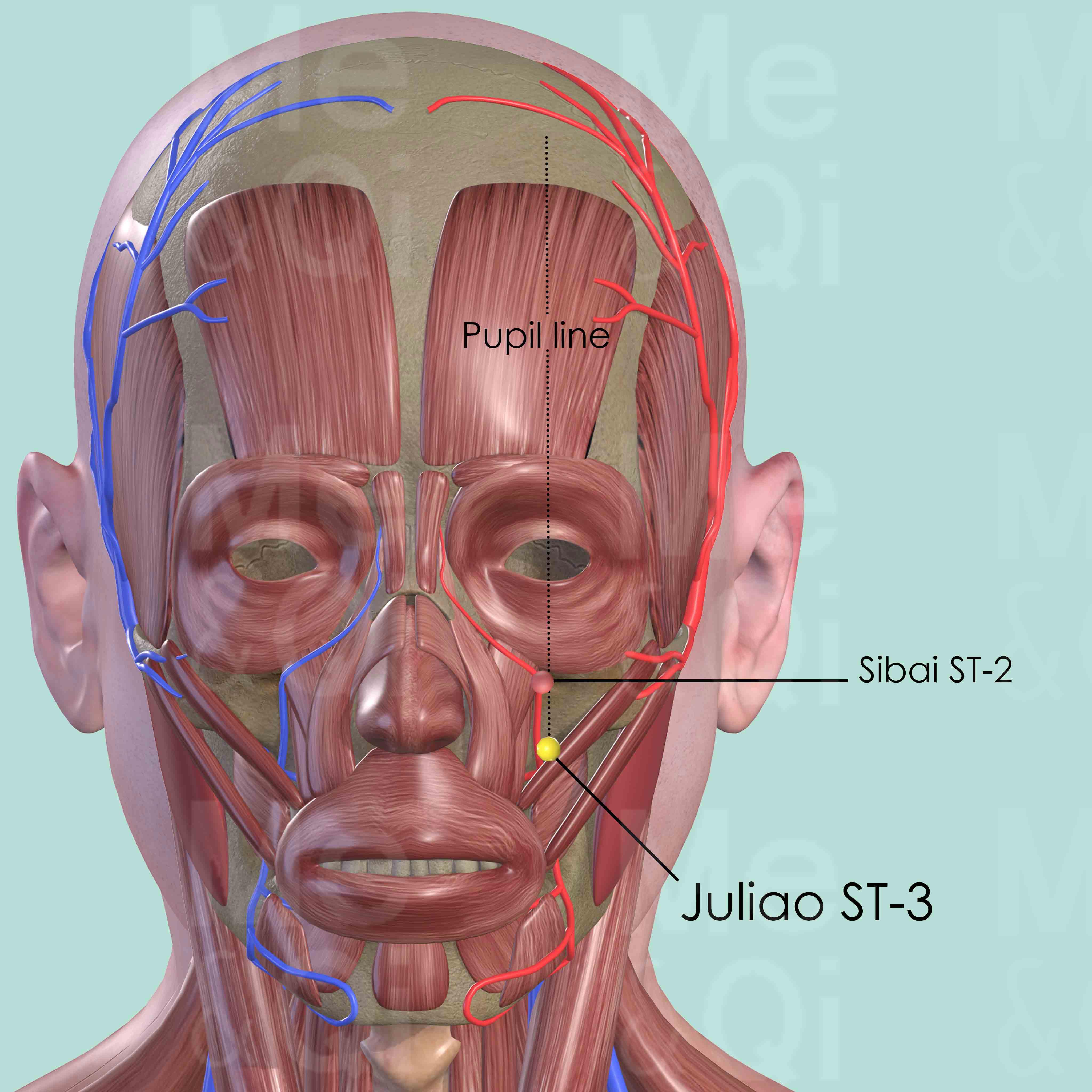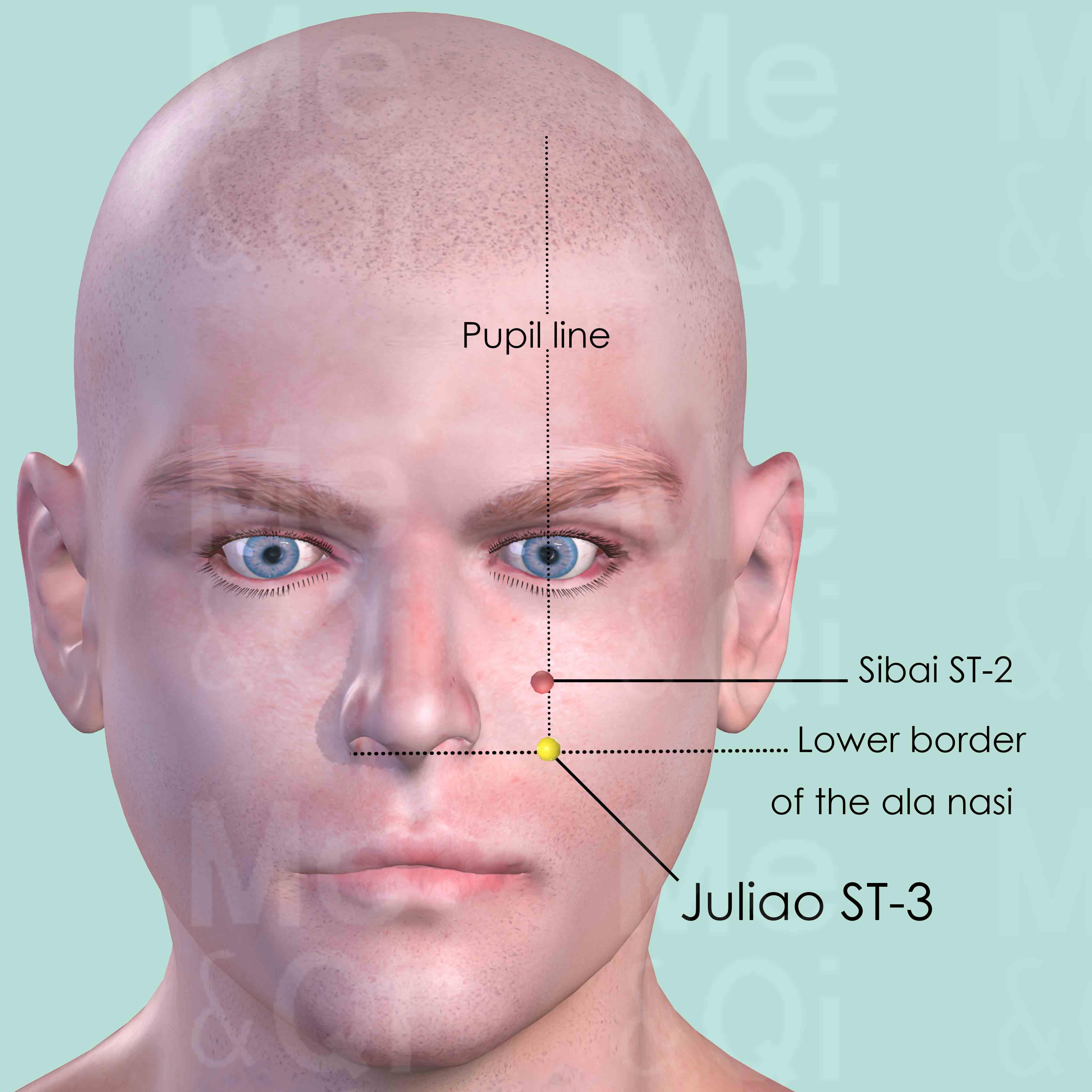 The first four points of the Stomach Channel are located vertically in the central pupil line, when the patients look straight ahead. Juliao ST-3 is located at the crossing point of the pupil line and a horizontal line on the level of the lower border of the ala nasi.