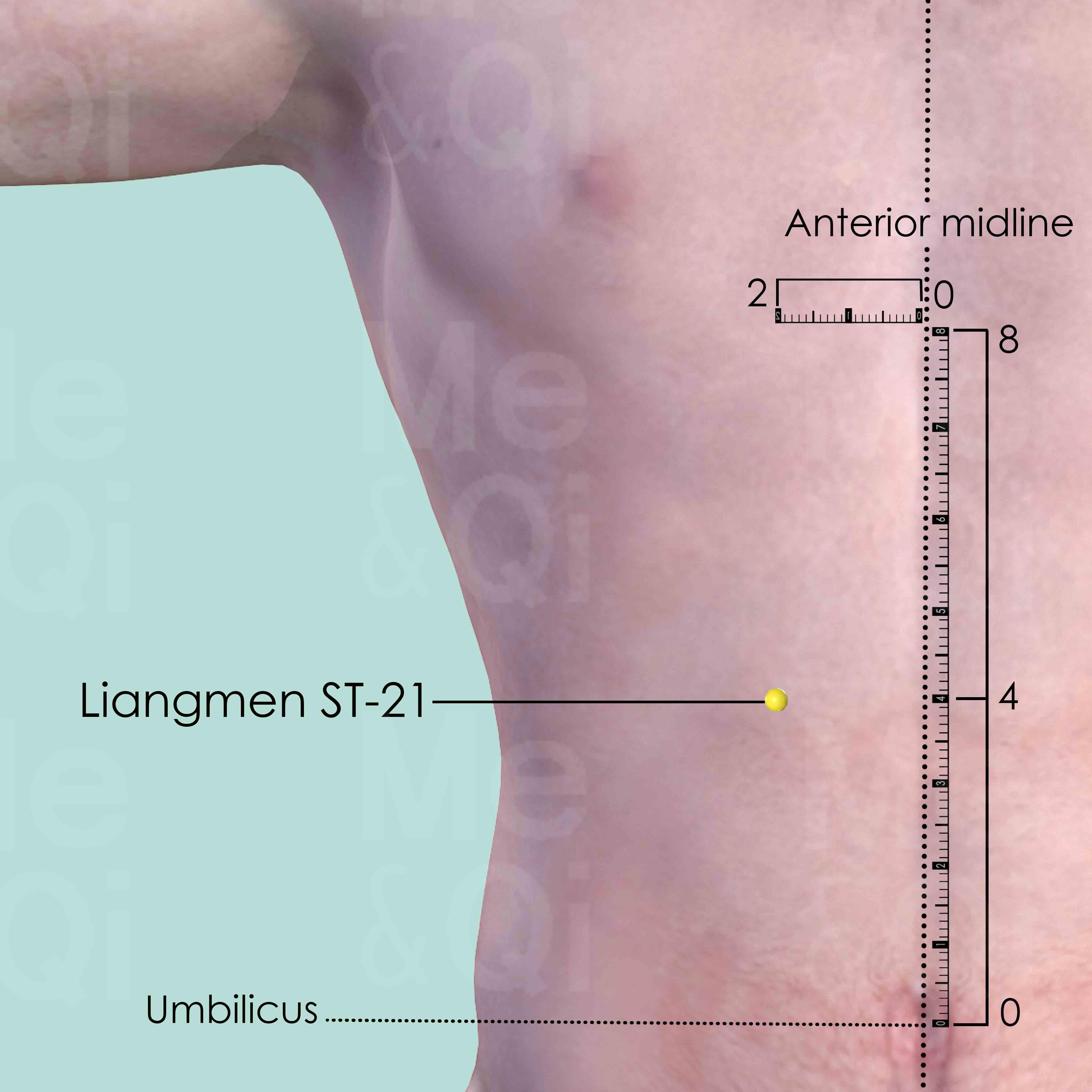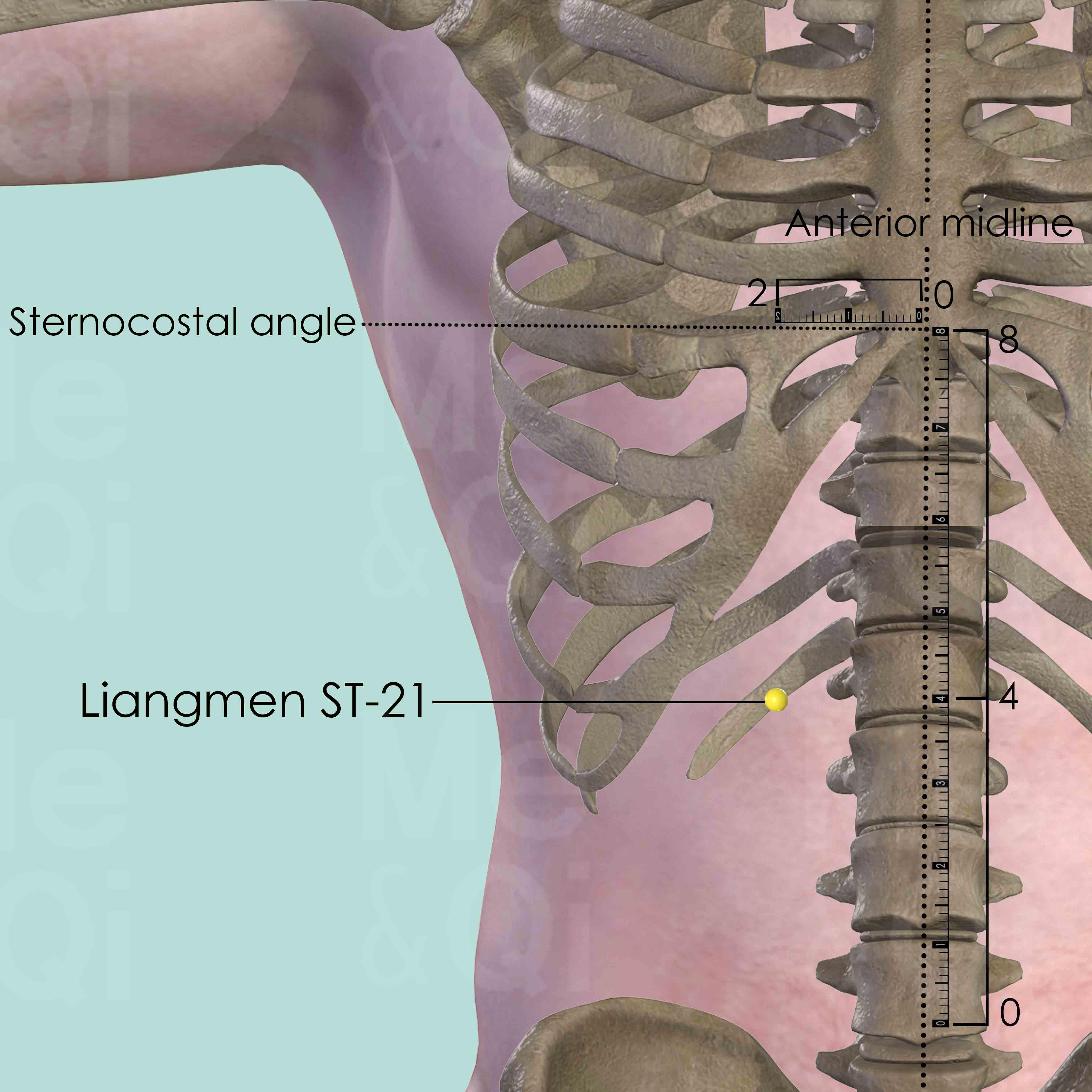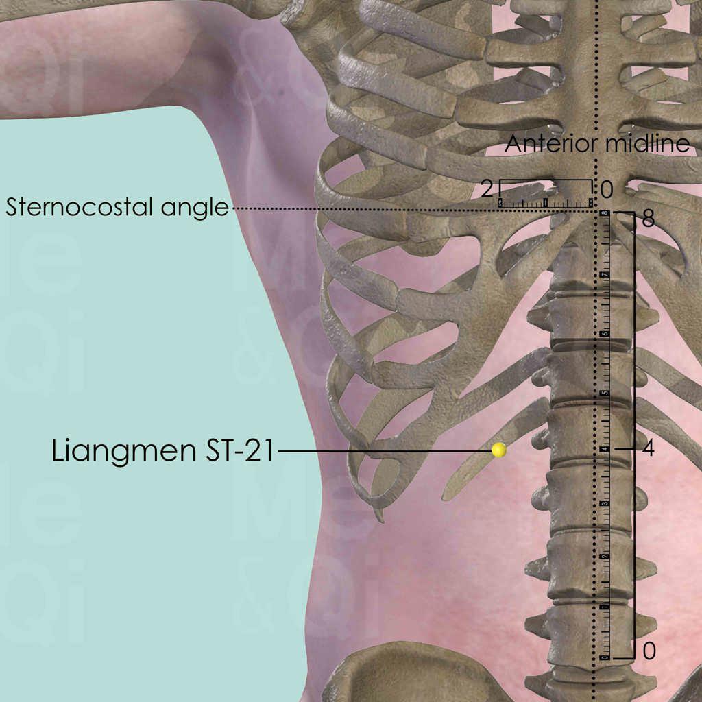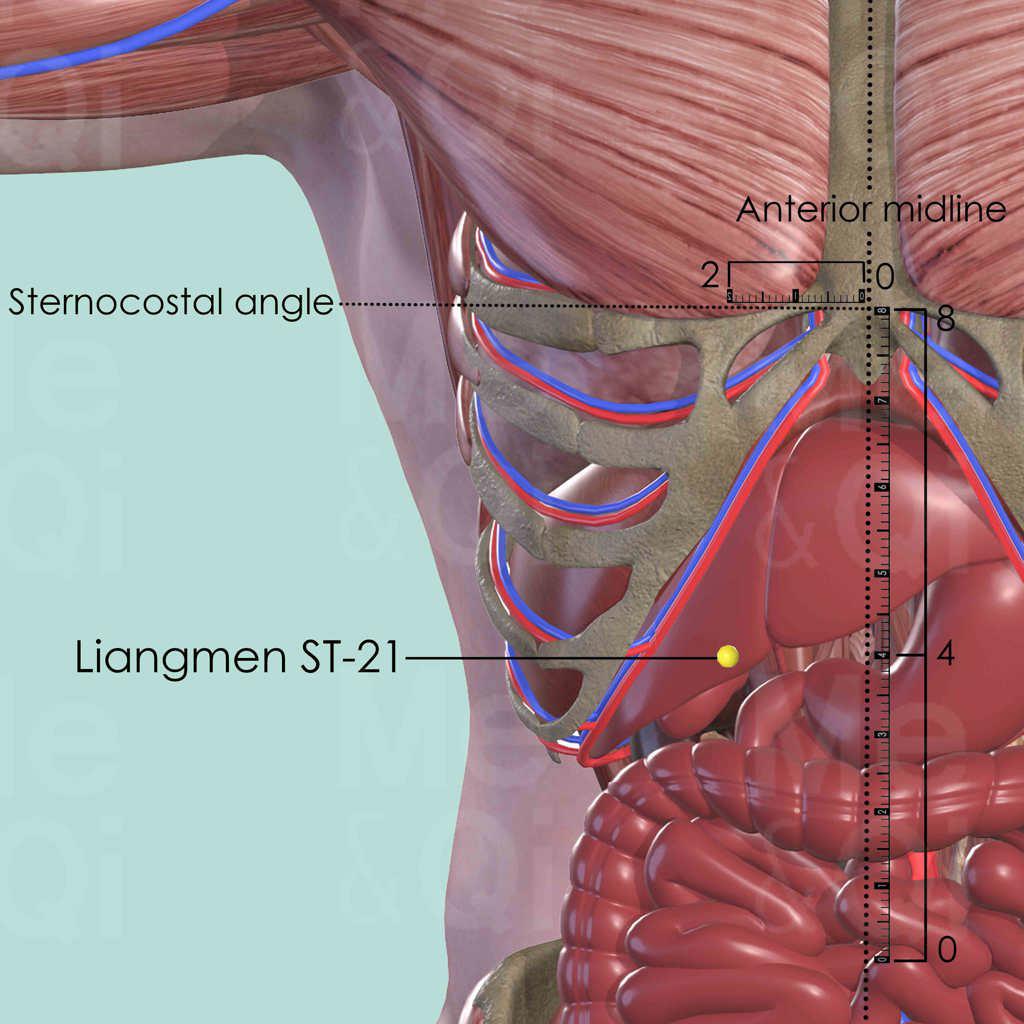 There are 8 cun between the sternocostal angle and the center of the umbilicus. Liangmen ST-21 is in the middle of these two points and 2 cun lateral to the anterior midline. Depends on the shape of the thorax, the location might be either on the rib or on the abdomen.