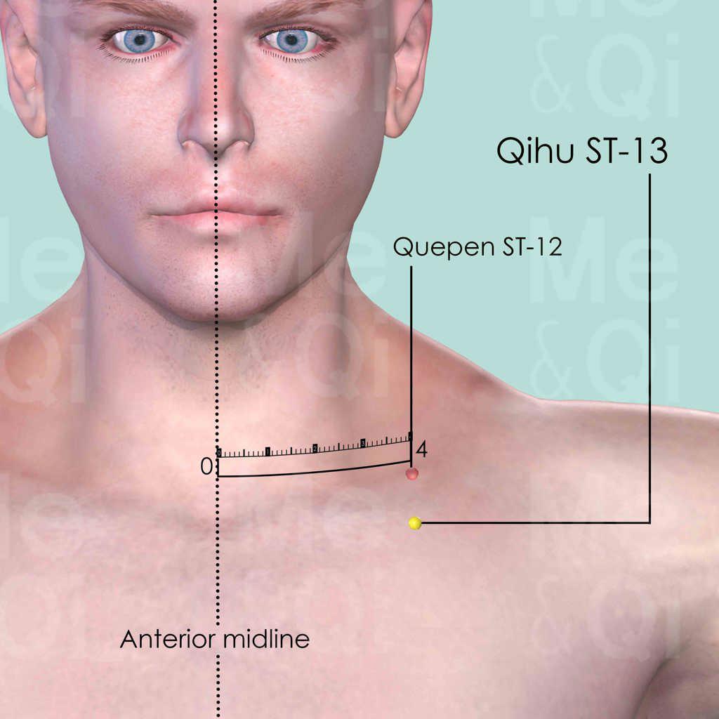 From the anterior midline, palpate 4 cun along the clavicle to the midpoint. Qihu ST-13 is located at the lower border of the clavicle, while Quepen ST-12 is on the other side of clavicle.