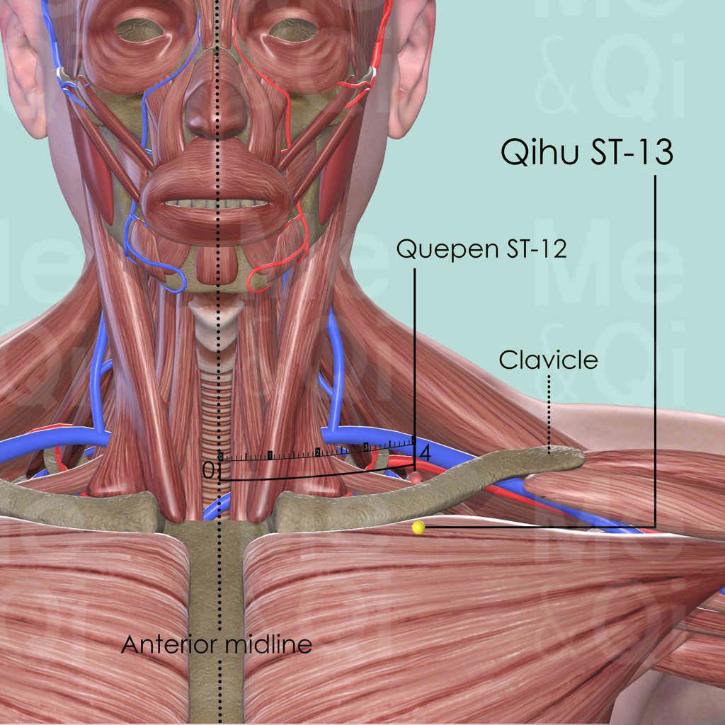 Qihu ST-13 is not a major point of the Stomach Channel. Its main function is to descend Rebellious Qi and open the chest, characterized by distention and fullness in the chest or lateral costal region.